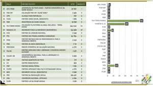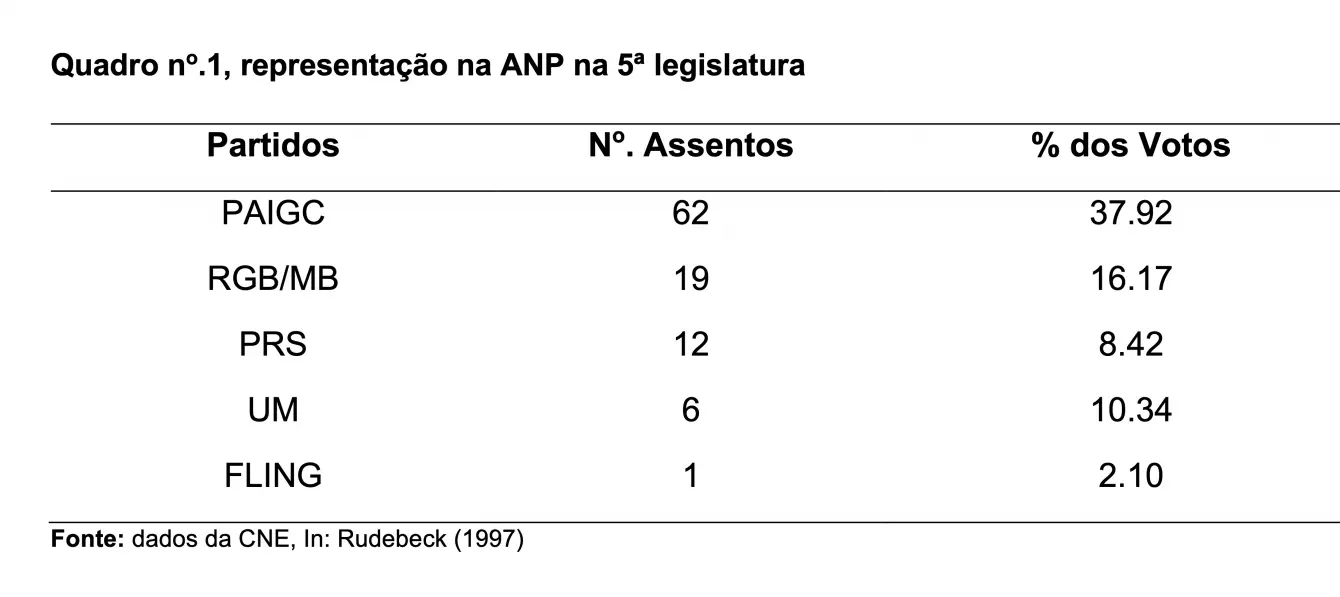Nessa corrida, apenas quatro (4) partidos e uma coligação eleitoral conseguiram chegar ao parlamento. Entretanto, a 5ª legislatura ficou representada com os seguintes partidos, conforme o quadro nº1 abaixo: