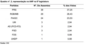 Para os 102 assentos na ANP, concorreram quinze (15) partidos. Apenas cinco conseguiram a representação parlamentar, conforme se pode ver no quadro a seguir: