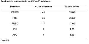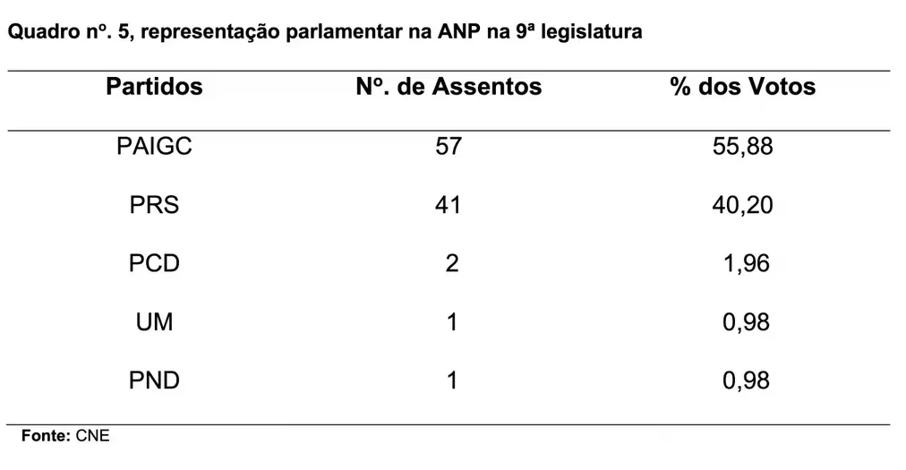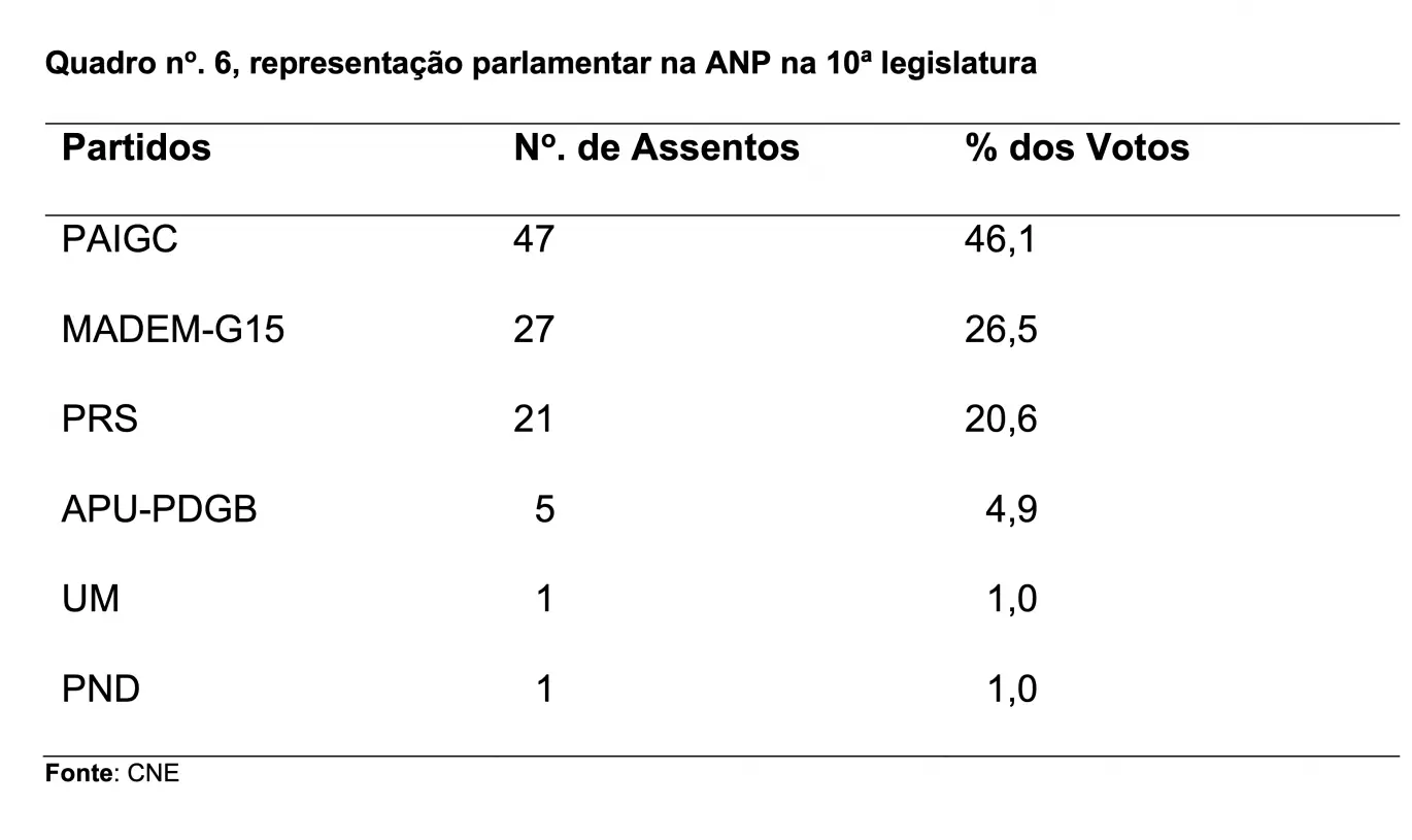 Nas Eleições Legislativas concorreram quinze (15) partidos para os 102 assentos na ANP, a saber: PS-GB, FDS, PUSD, UPG, PRN, UM, PRS, PCD, RGB/MB, PSD, PAIGC, PND, MP, PT e PRID, apenas cinco conseguiram a representação parlamentar, conforme se pode ver no quadro.