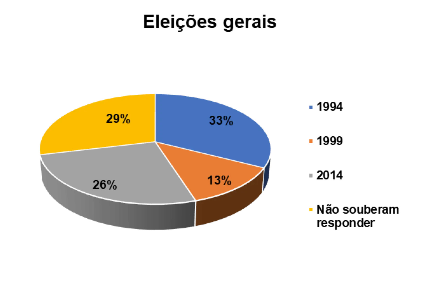 Em relação a participação nas eleições realizadas no pais percebe-se que 33% afirmam ter votado nas eleições gerais em 1994, 13% nas eleições de 1999 e 26 % nas eleições gerais de 2014. 29% não souberam responder essa questão.