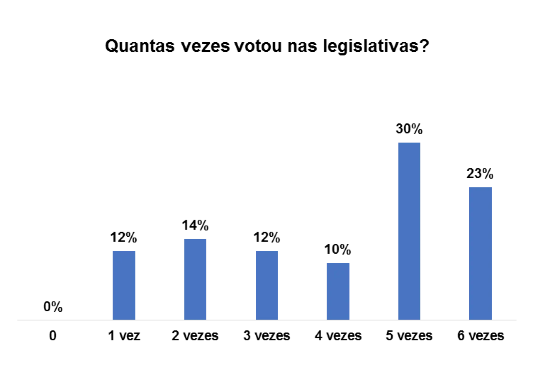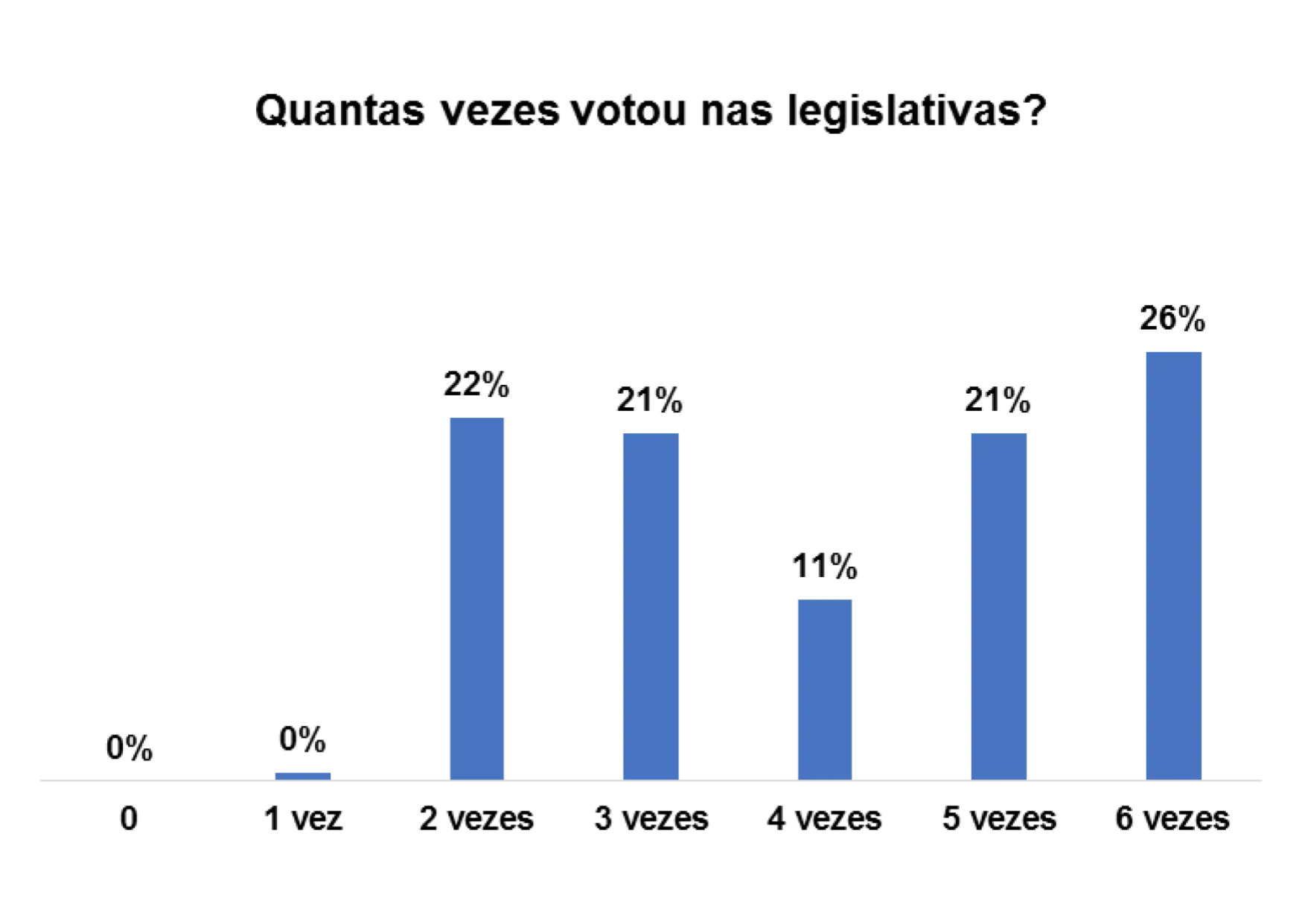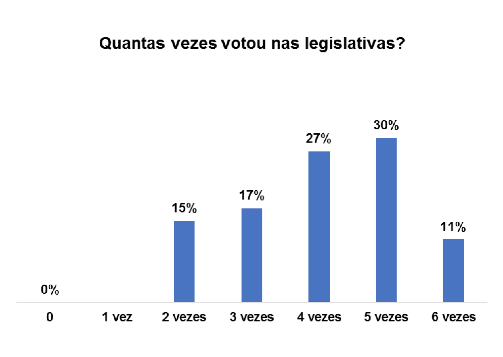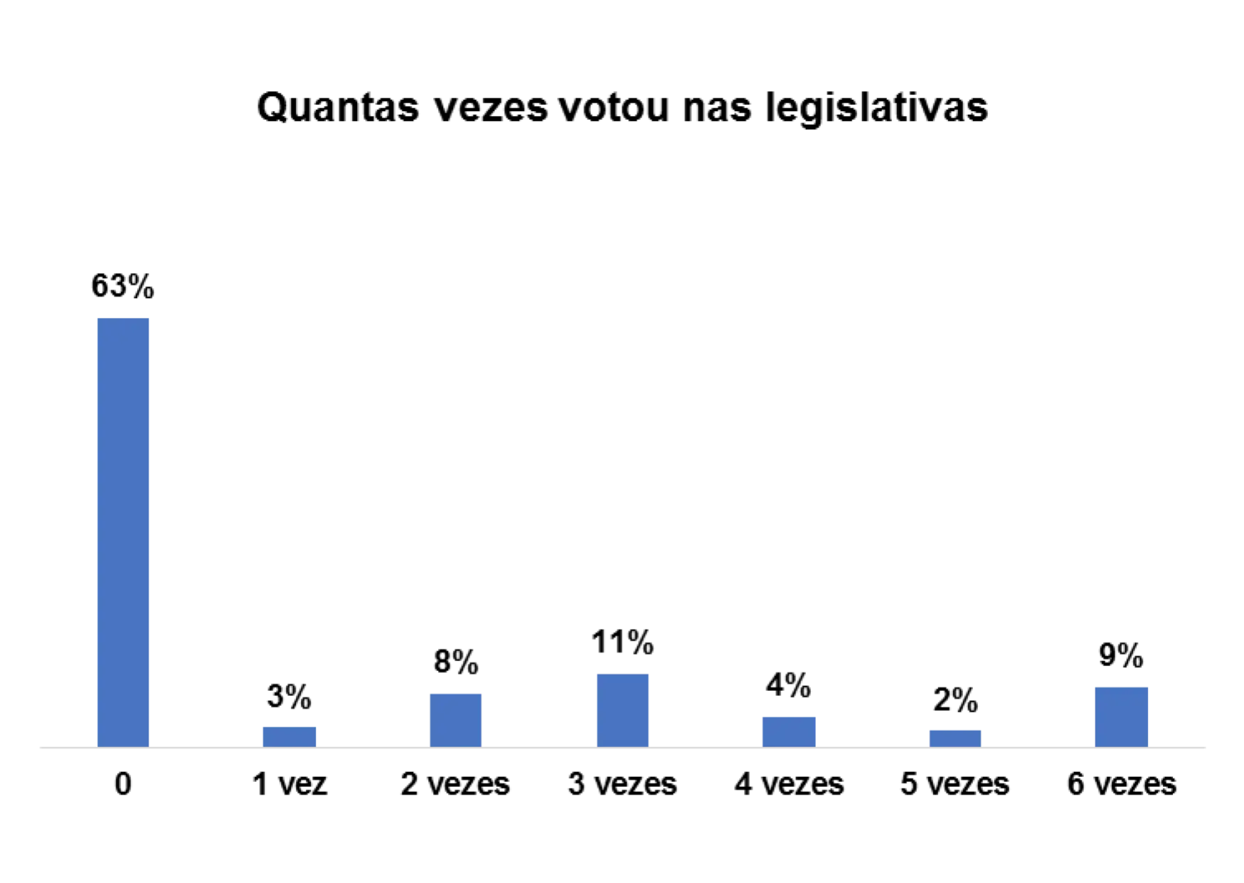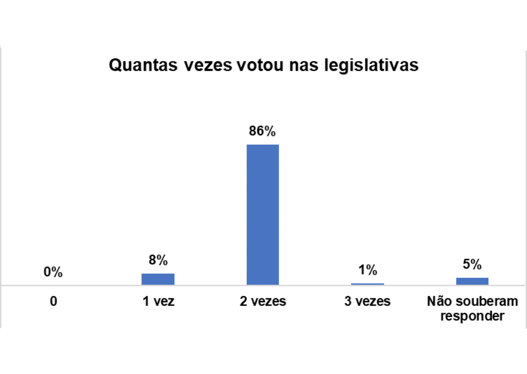 Em relação ao número de vezes que os entrevistados/as votaram nas eleições legislativas, 86% afirmam ter votado 2 vezes, 8% afirmam ter votado 1 vez e 1% afirmam ter votado 3 vezes.