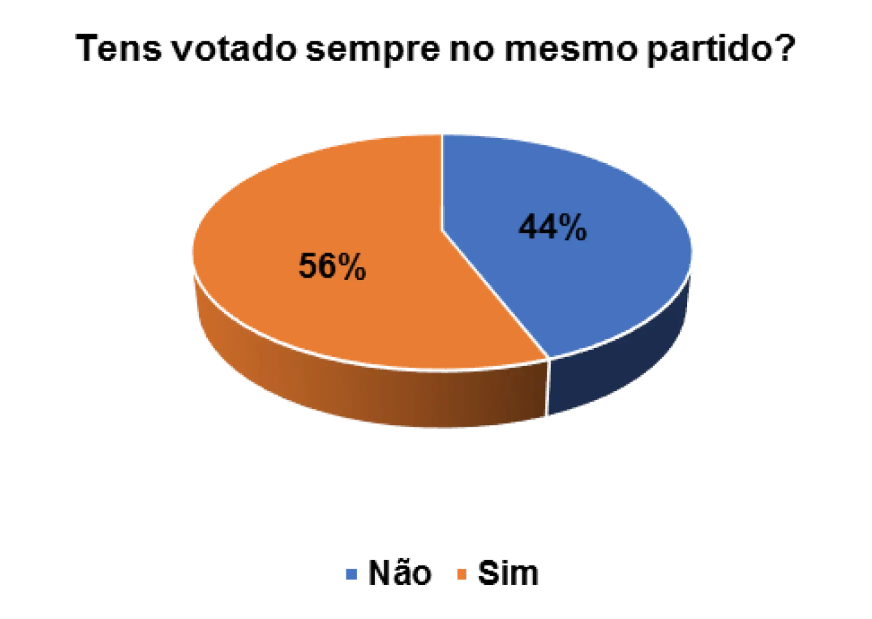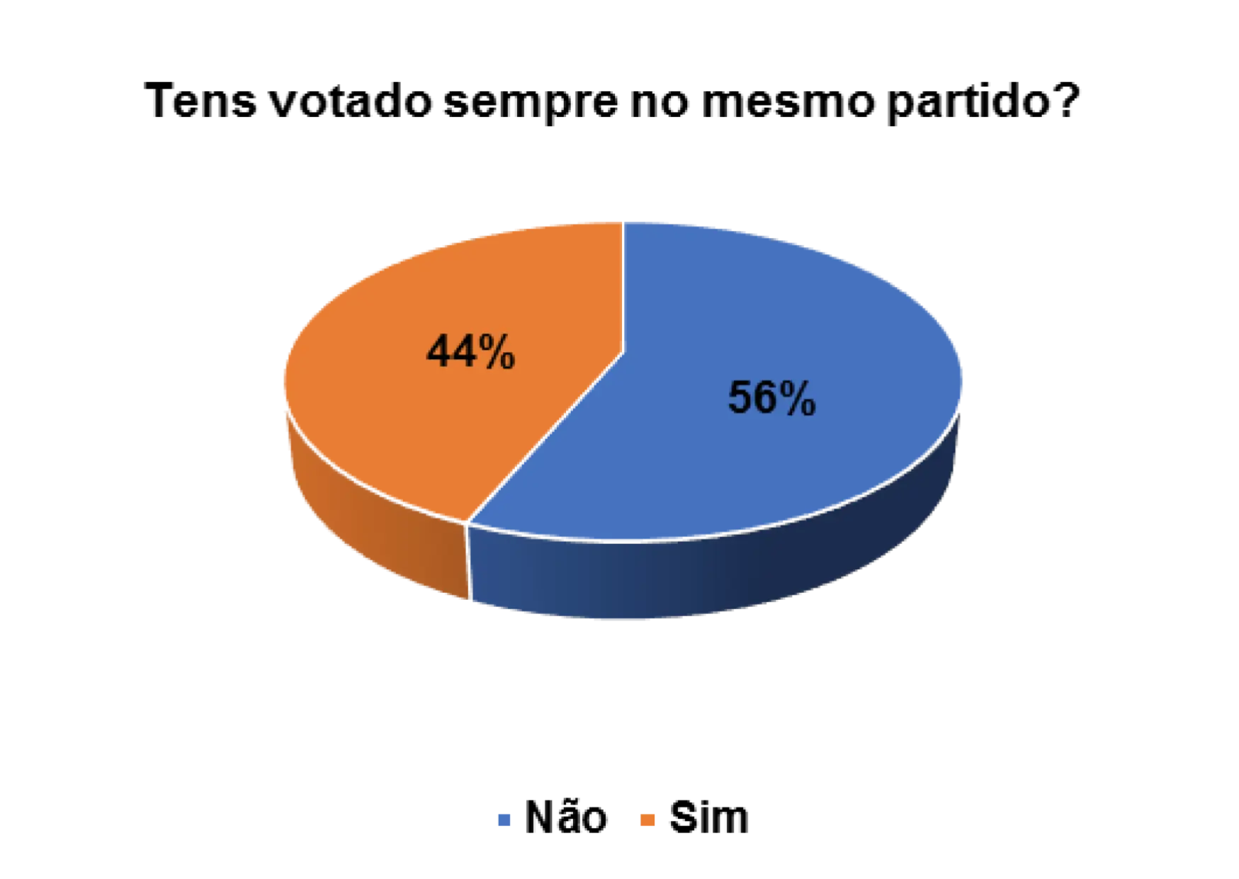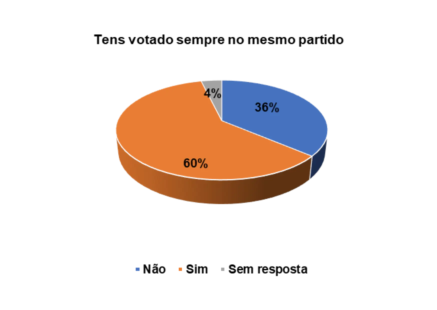 Também foi possível medir o nível de confiança que os eleitores entrevistados possuem em relação aos partidos políticos. Segundo o gráfico 14, verifica-se que 36% afirmam não votar sempre no mesmo partido, ao passo que 60% afirmam ter votado sempre no mesmo partido. Esta fidelidade, de alguns eleitores em votarem quase sempre no mesmo partido, pode estar relacionada a vários fatores, nomeadamente questões histórico-ideológicas, étnicas e religiosas. Essas ligações (e outras) têm definidas as opções dos eleitores na hora de decidirem os seus votos.