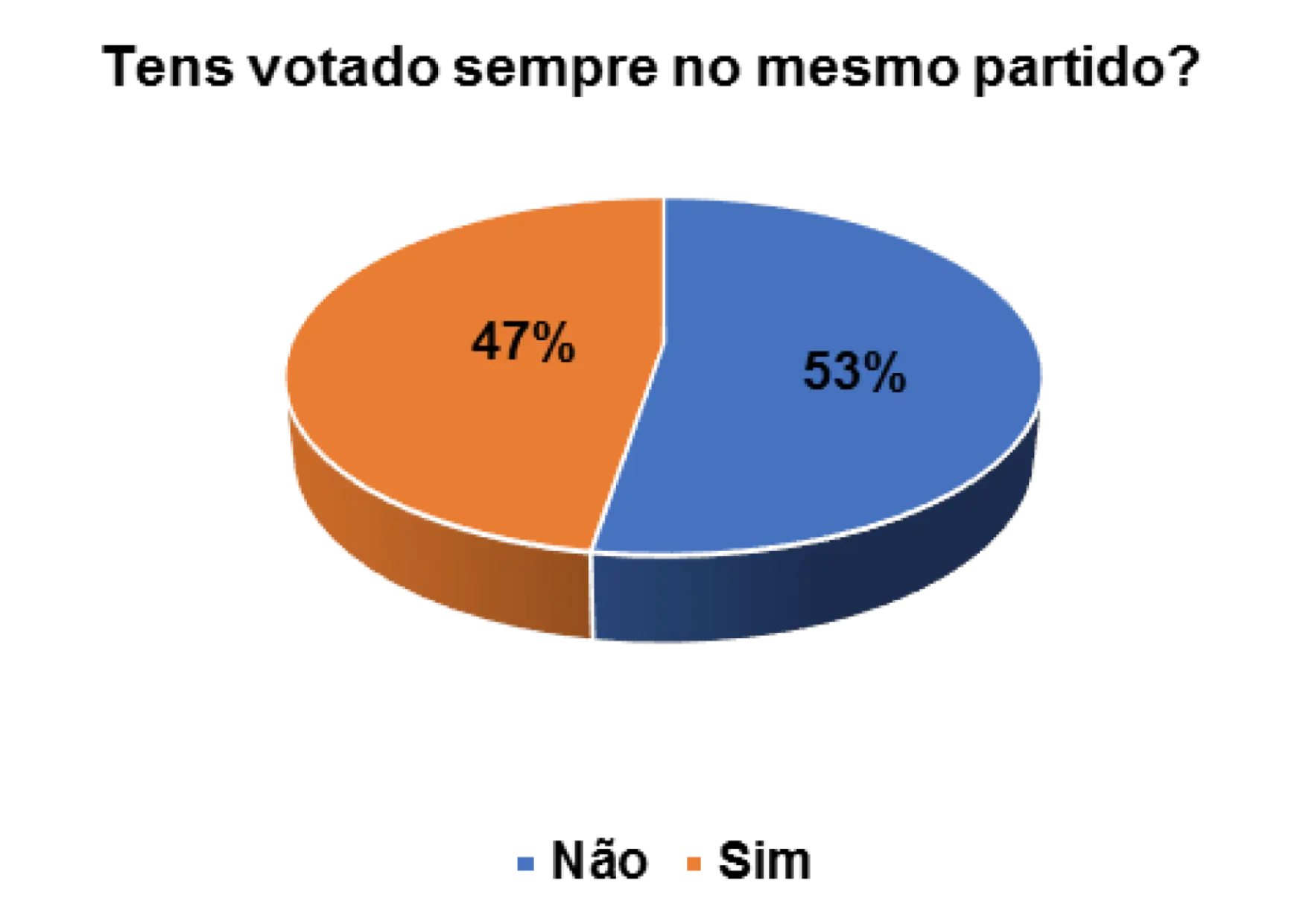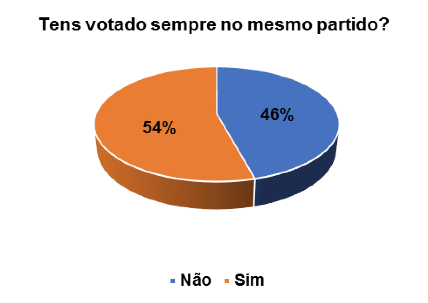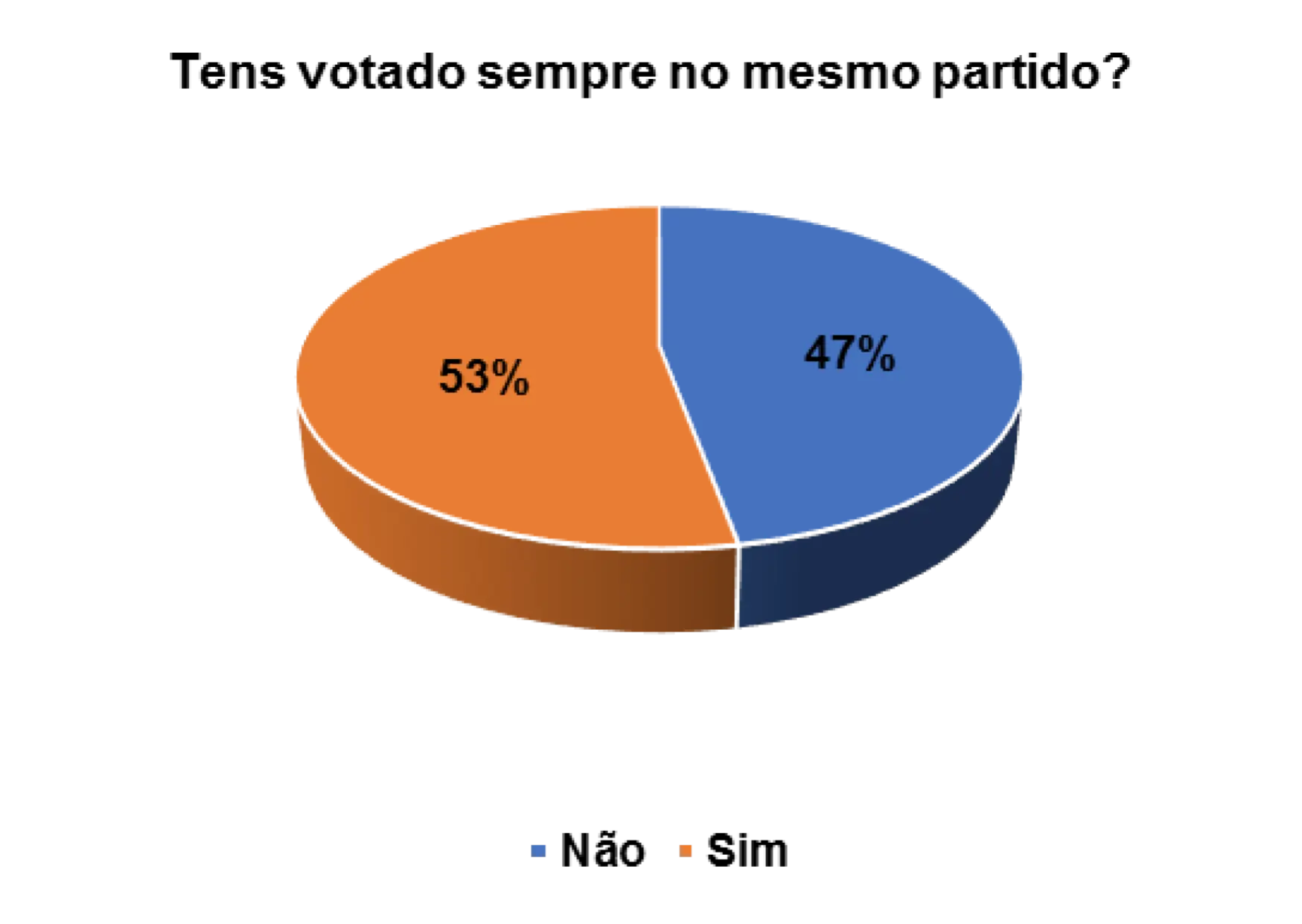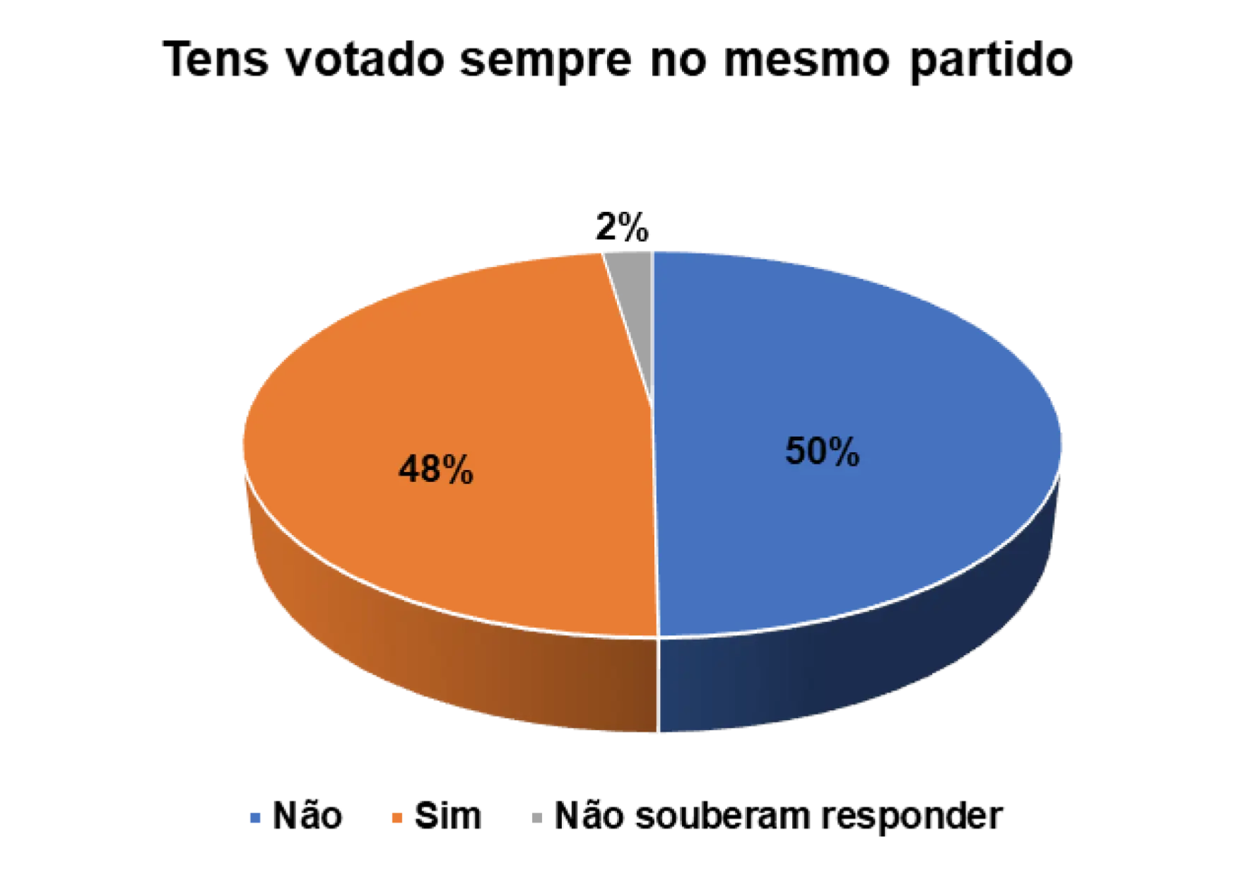 Também foi possível medir o nível de confiança que os eleitores entrevistados possuem em relação aos partidos políticos. Segundo o gráfico 14, verifica-se que 36% afirmam não votar sempre no mesmo partido, ao passo que 60% afirmam ter votado sempre no mesmo partido. Esta fidelidade, de alguns eleitores em votarem quase sempre no mesmo partido, pode estar relacionada a vários fatores, nomeadamente questões histórico-ideológicas, étnicas e religiosas. Essas ligações (e outras) têm definidas as opções dos eleitores na hora de decidirem os seus votos.
