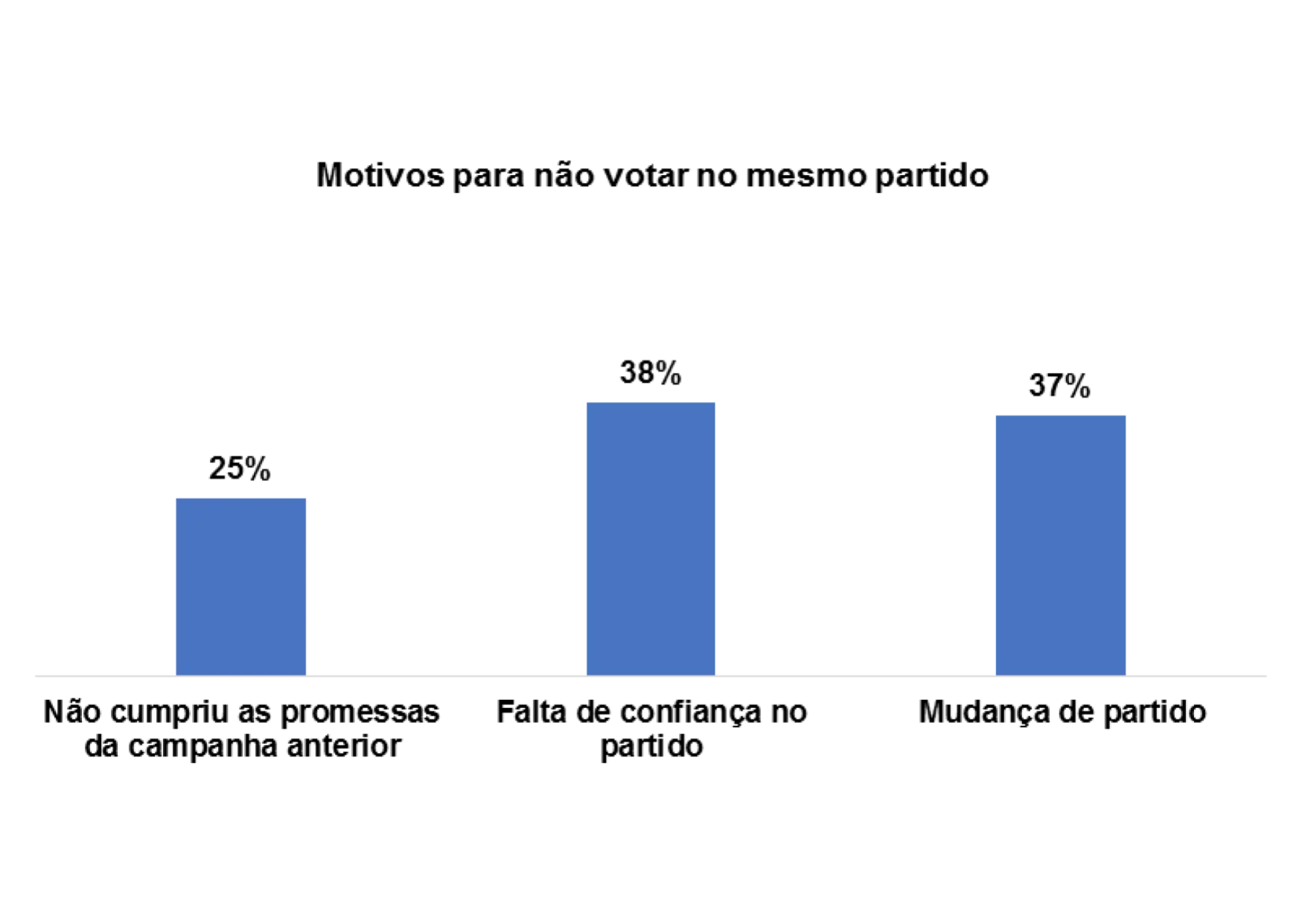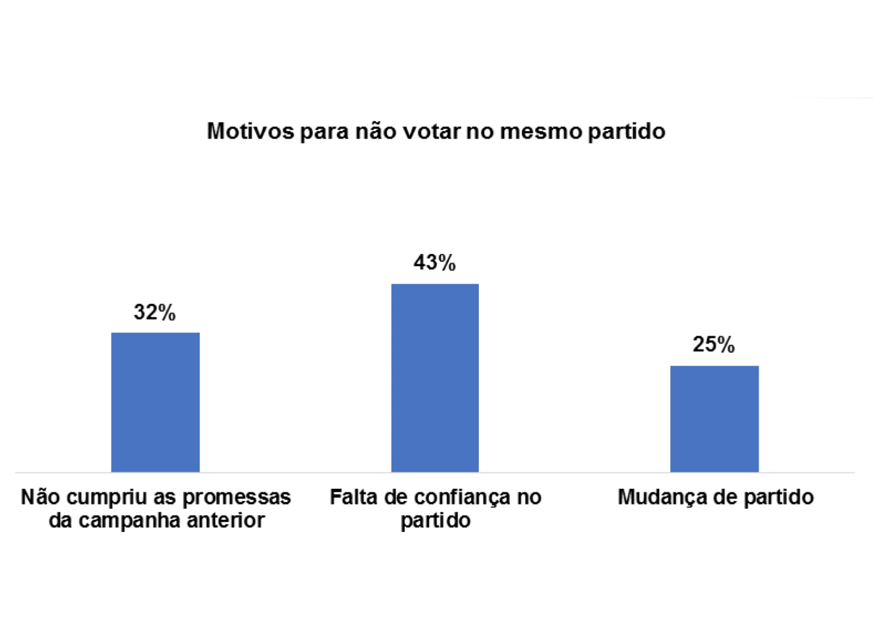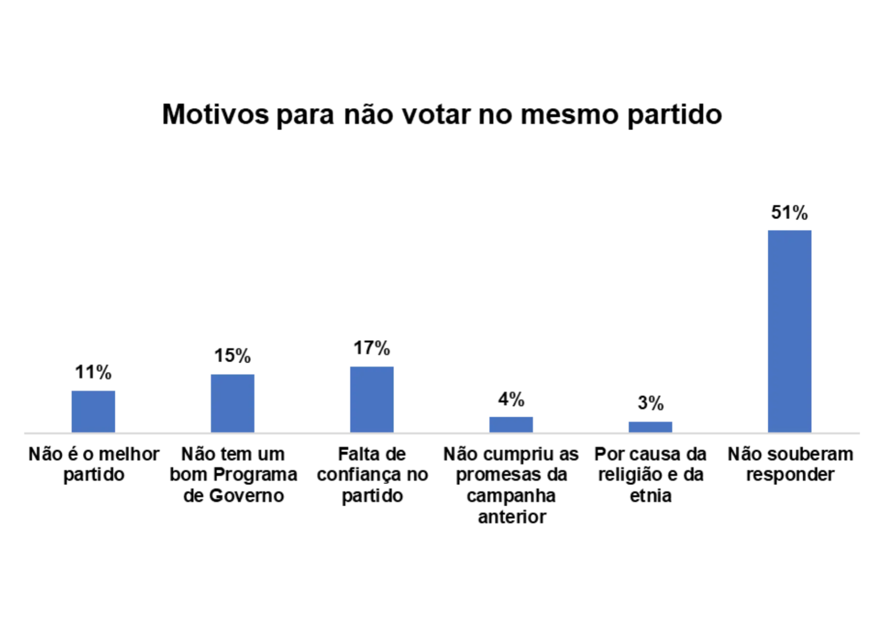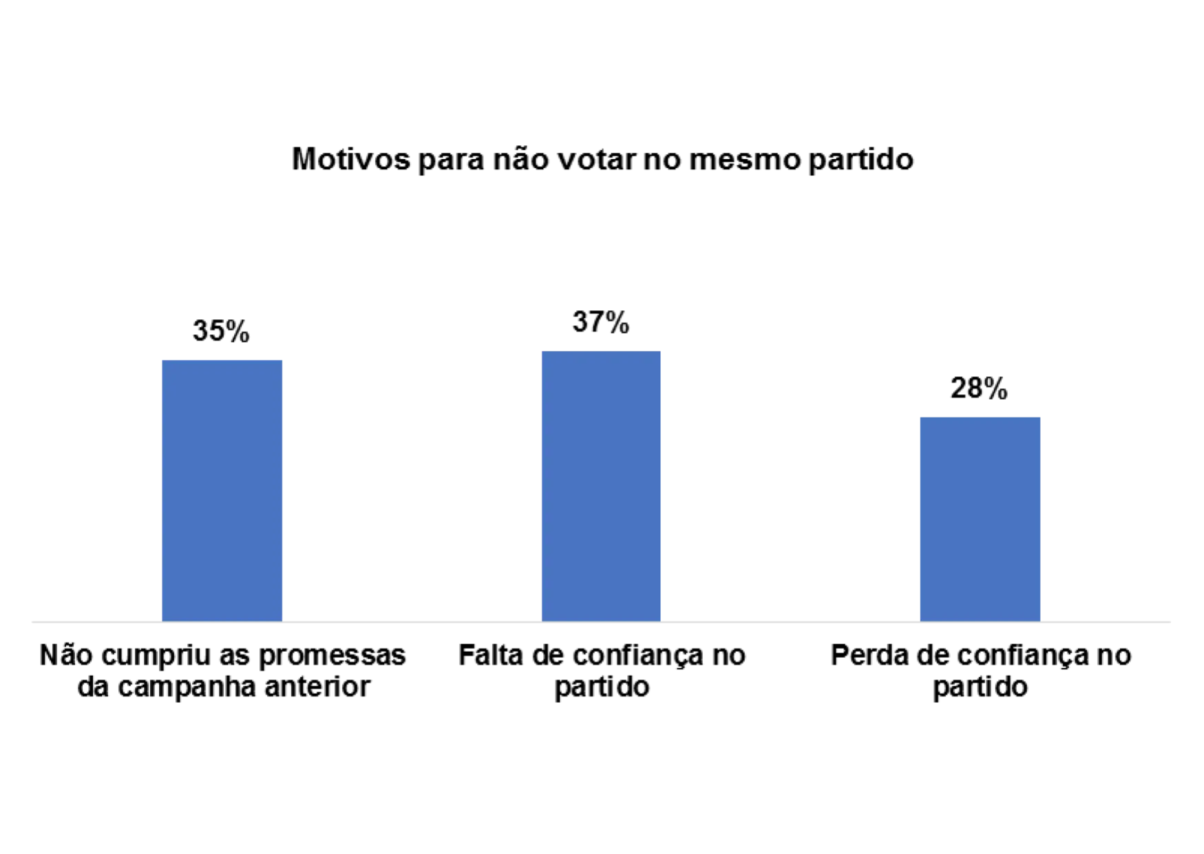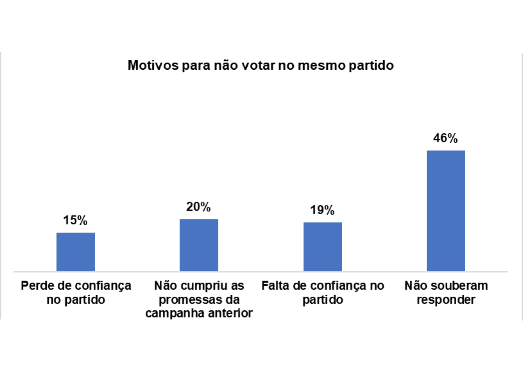 E os/as entrevistados/as afirmam que não votaram no mesmo partido nas últimas eleições pelos seguintes motivos: perda de confiança no partido (15%), não cumpriu as promessas da campanha anterior (20%) e a falta de confiança no partido (19%).