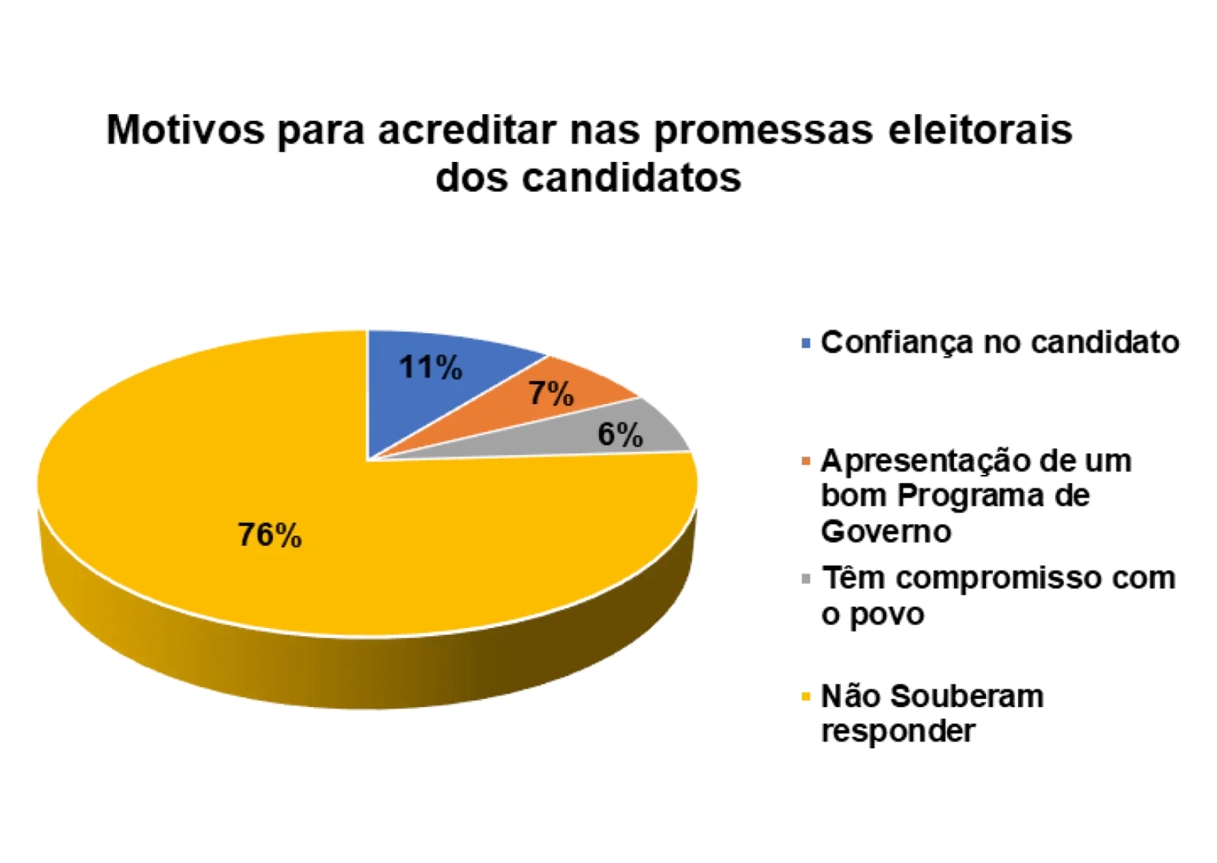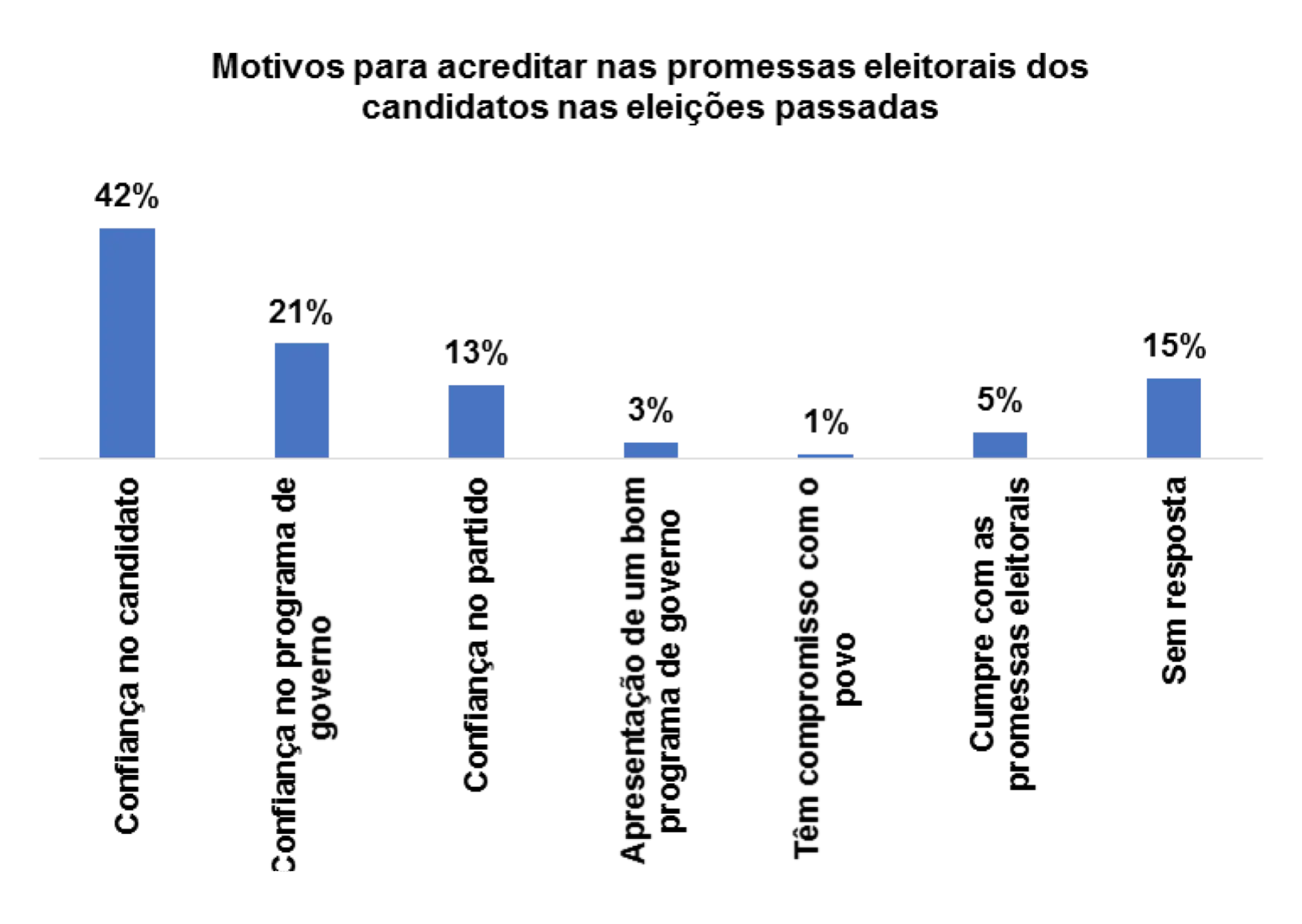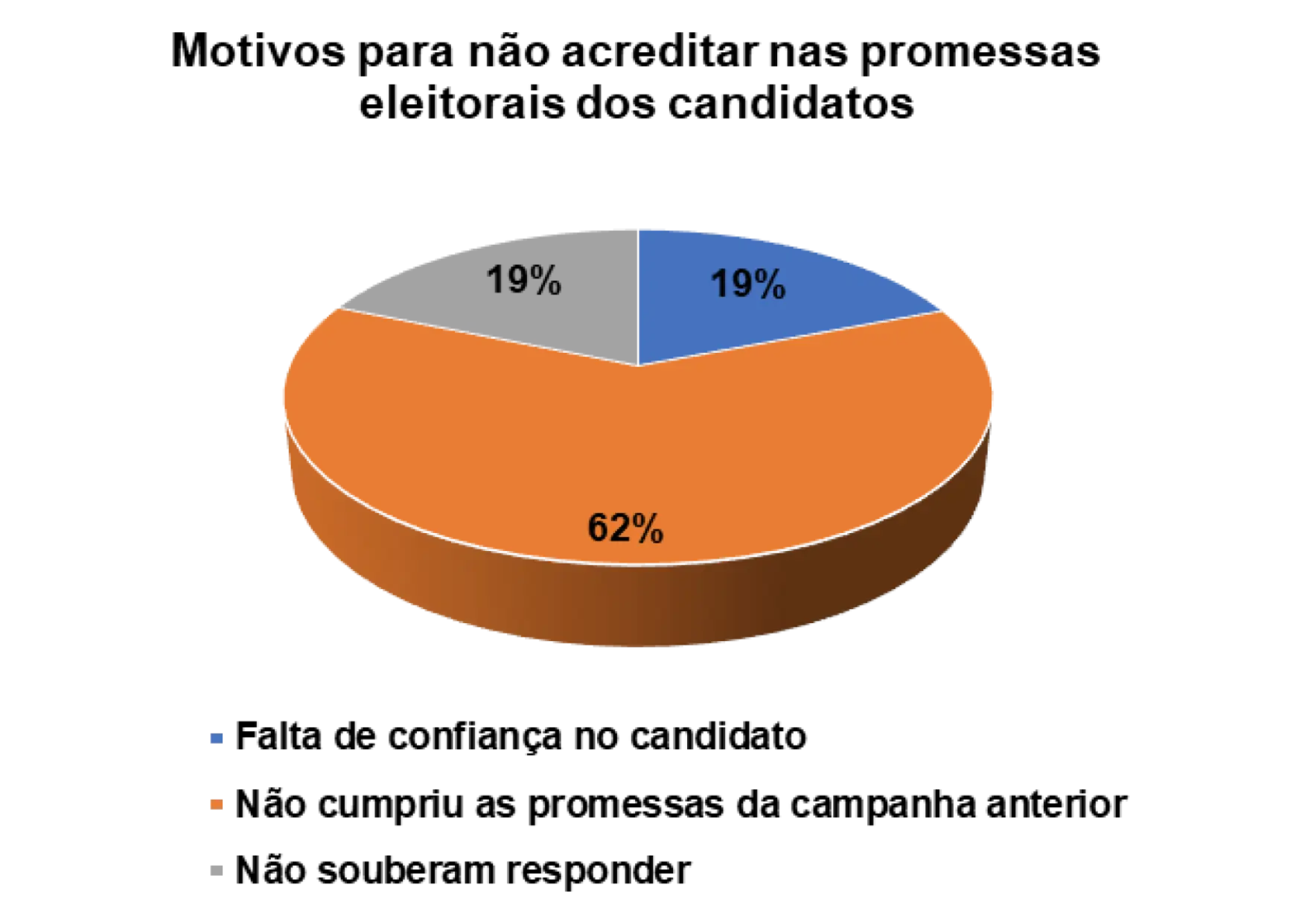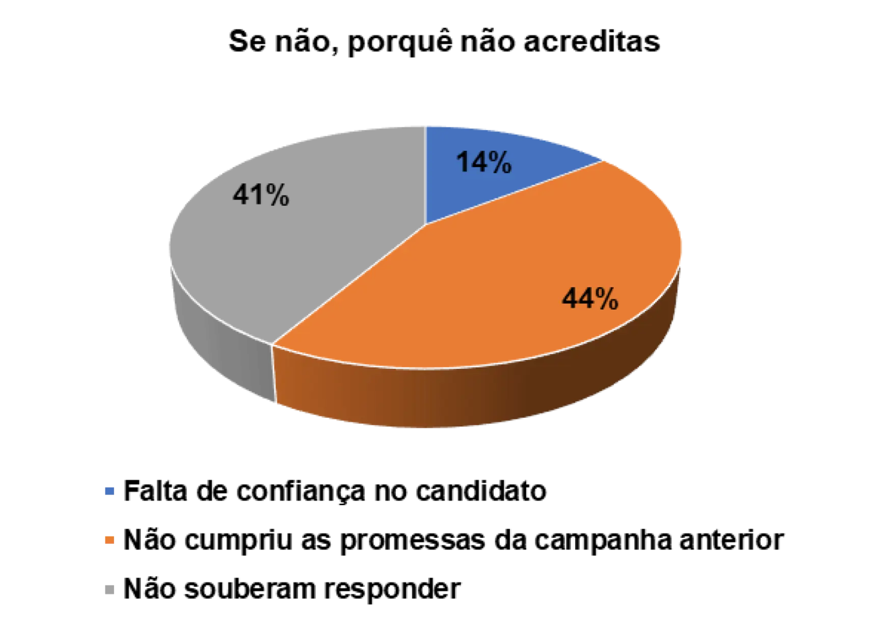 Entretanto, já para os eleitores entrevistados que afirmam não acreditarem nas promessas eleitorais dos candidatos, 14% alegam não confiarem no candidato e 44% porque o candidato não cumpriu com as promessas das campanhas anteriores.