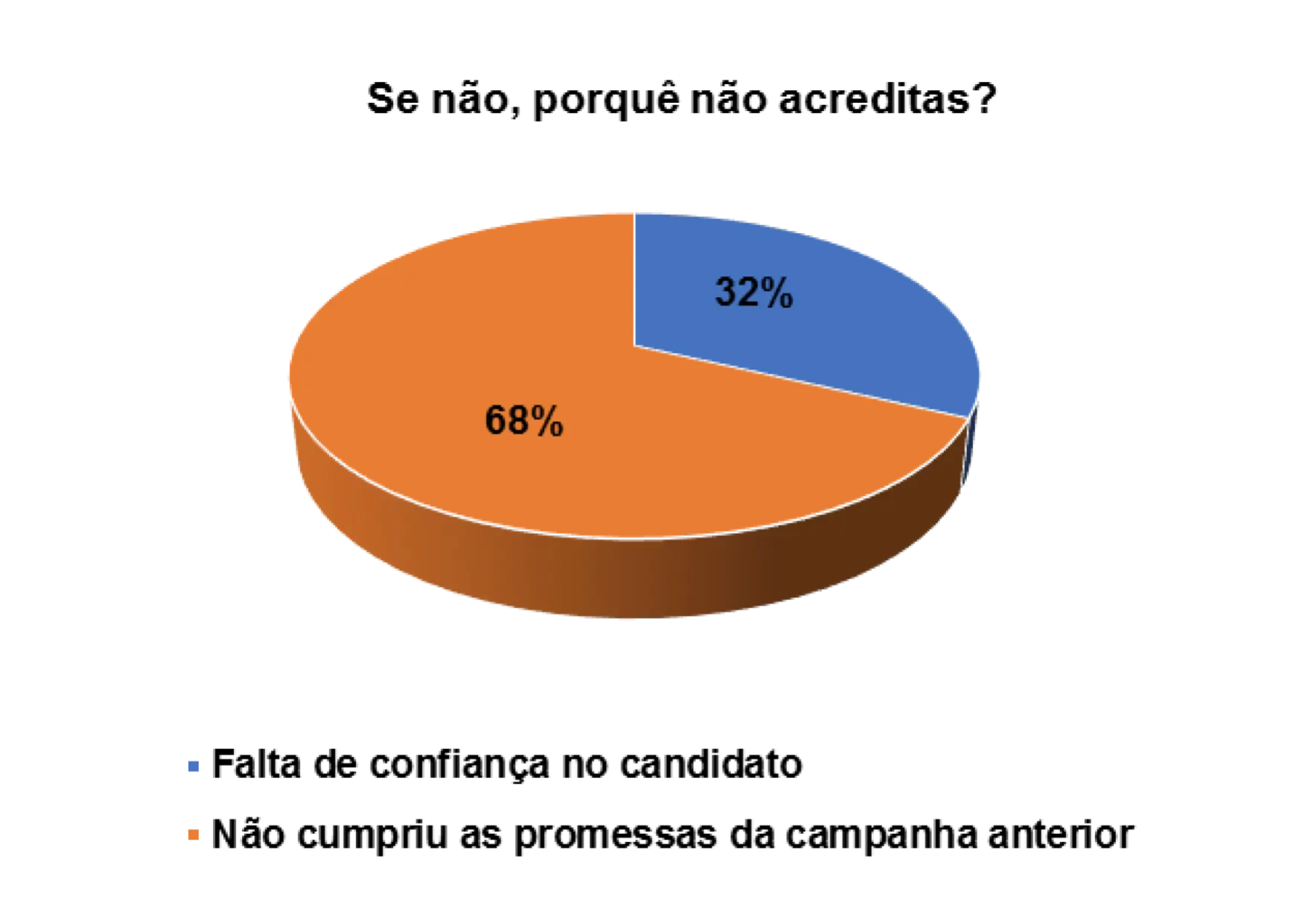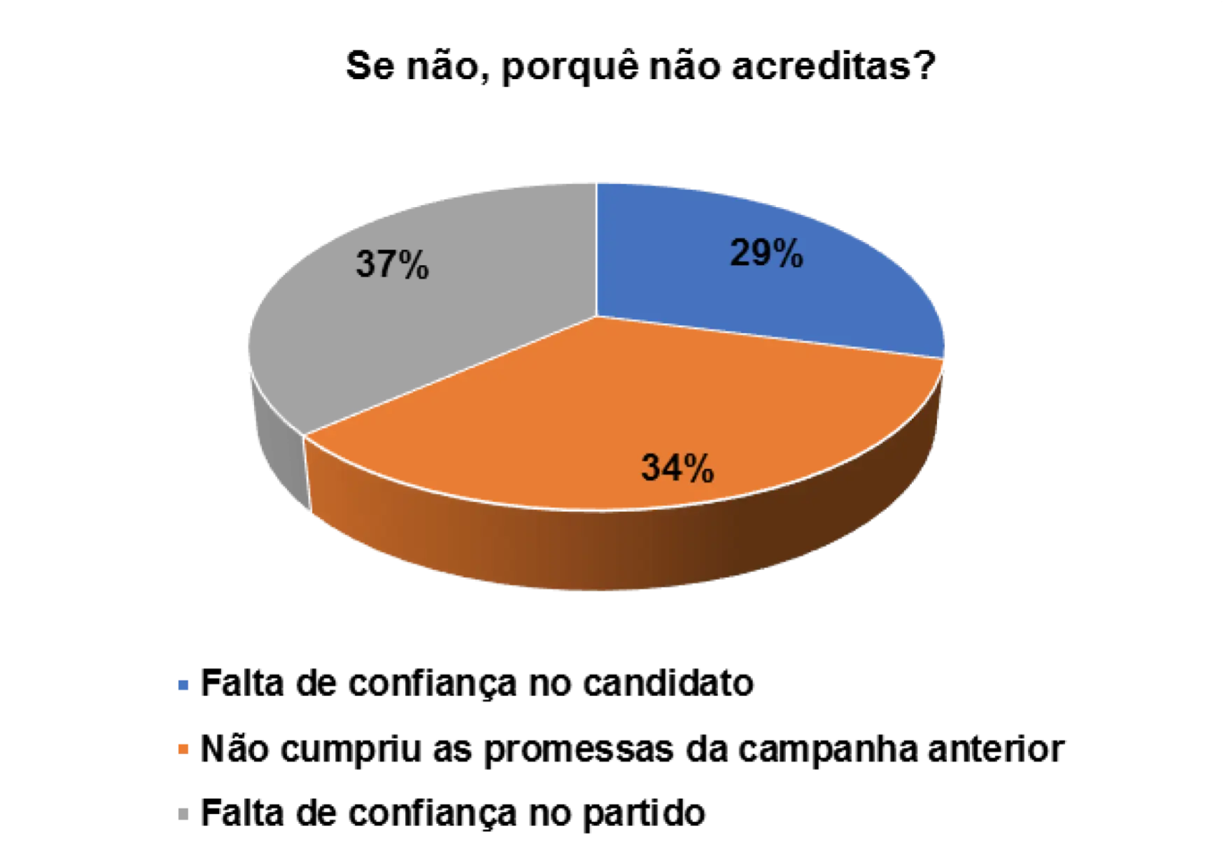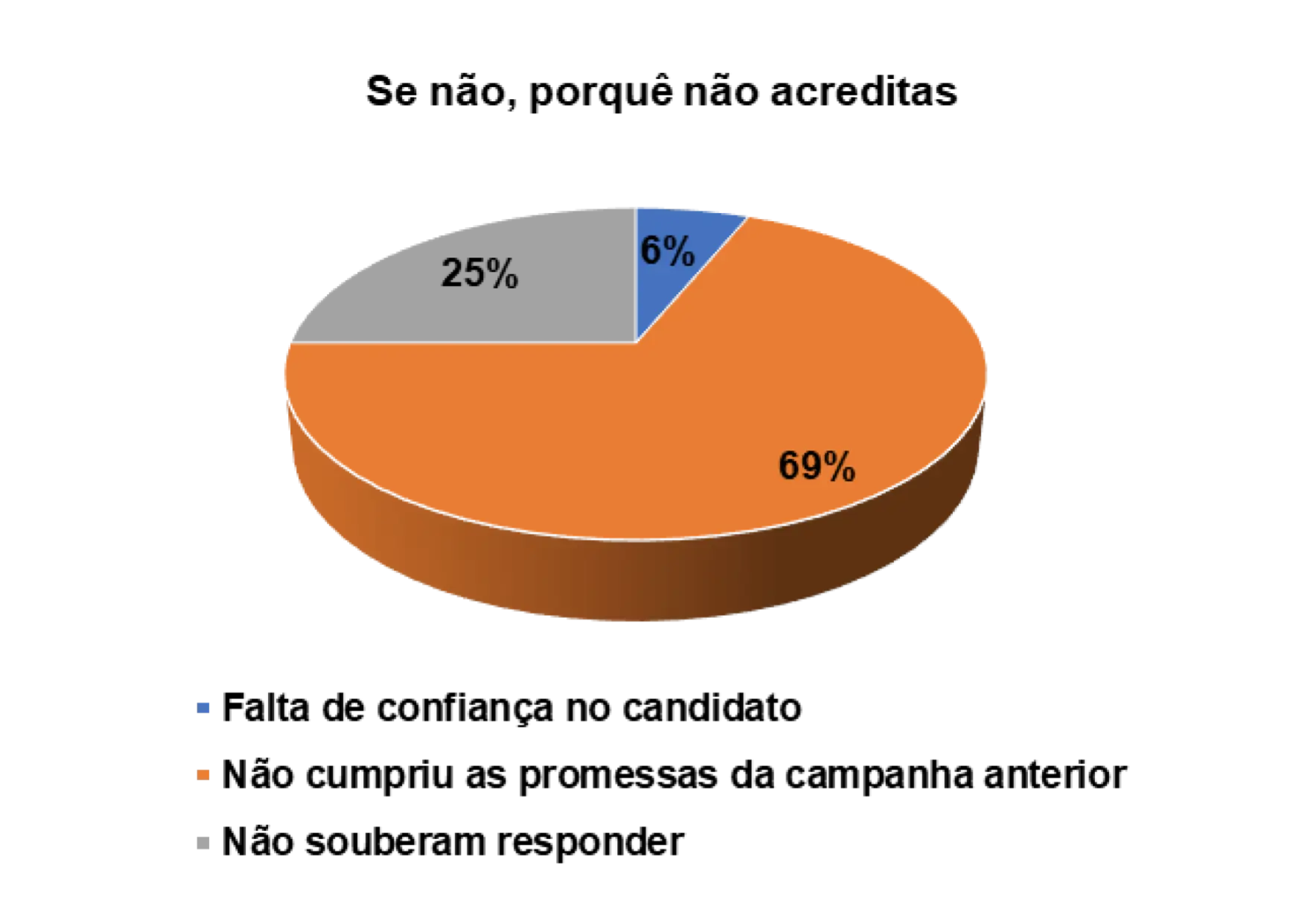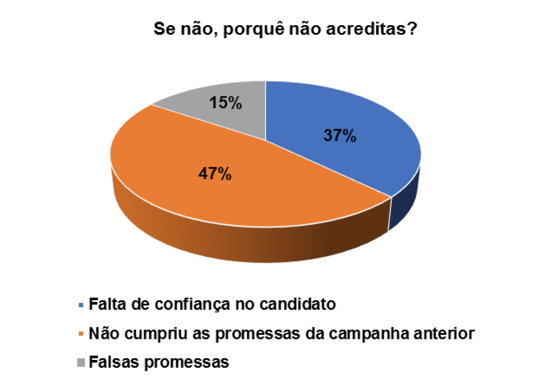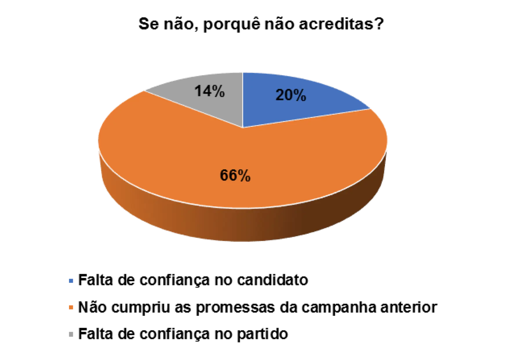 Entretanto, já para os eleitores entrevistados que afirmam não acreditarem nas promessas eleitorais dos candidatos, 14% alegam não confiarem no candidato e 44% porque o candidato não cumpriu com as promessas das campanhas anteriores.
