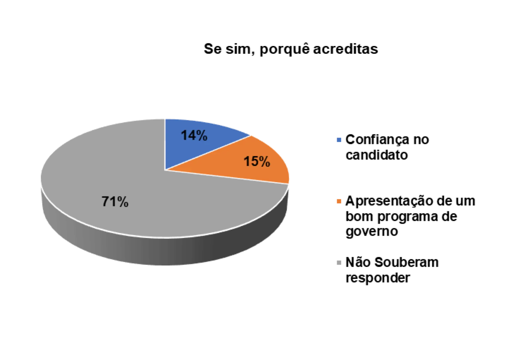 Portanto, segundo o gráfico 17, os/as entrevistados/as que afirmam que acreditam nas promessas eleitorais dos/as candidatos/as nas últimas eleições, 14% afirmam ter confiança no candidato, 15% afirmam que o candidato apresentou um bom programa de Governo e 71% não souberam responder.