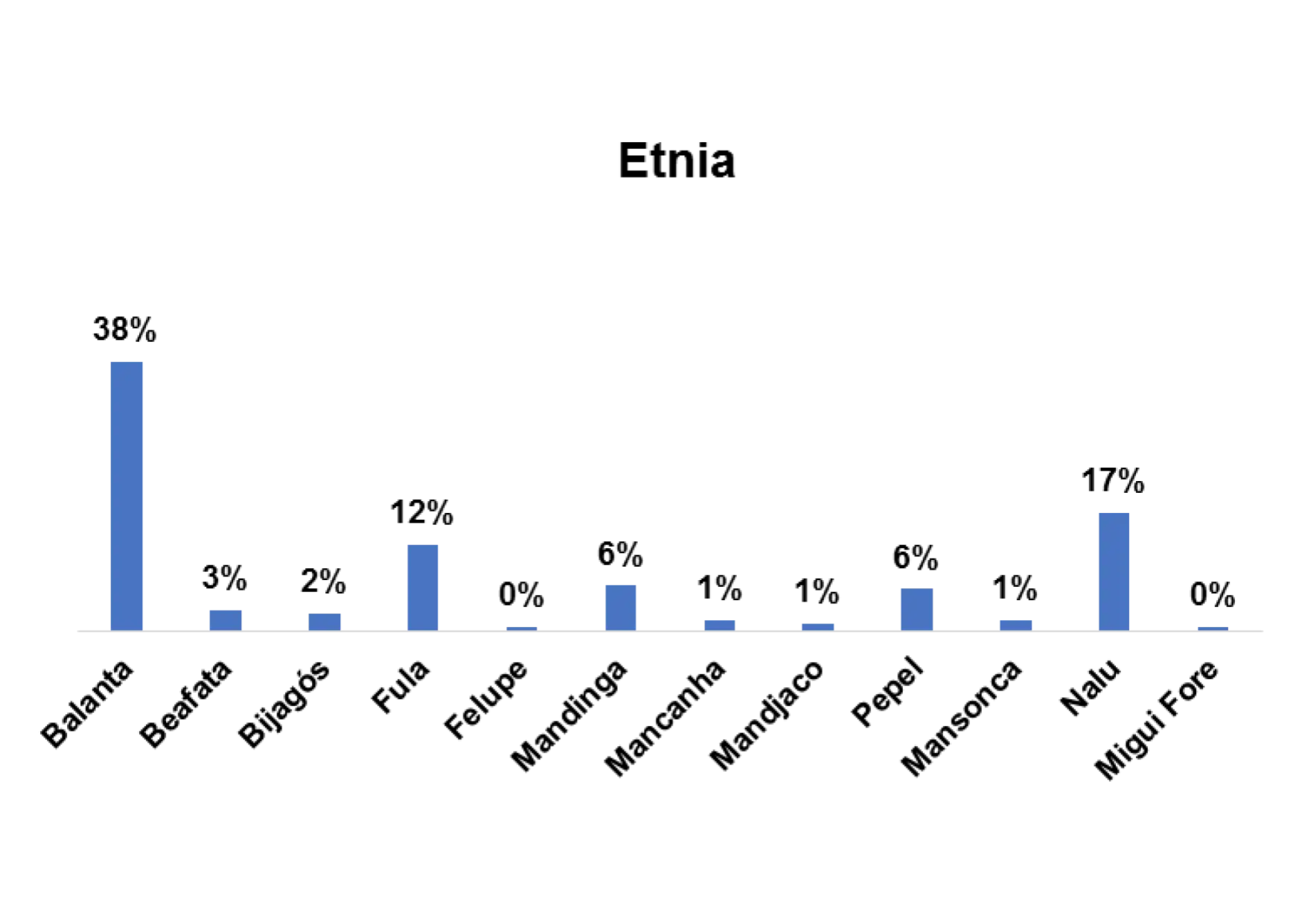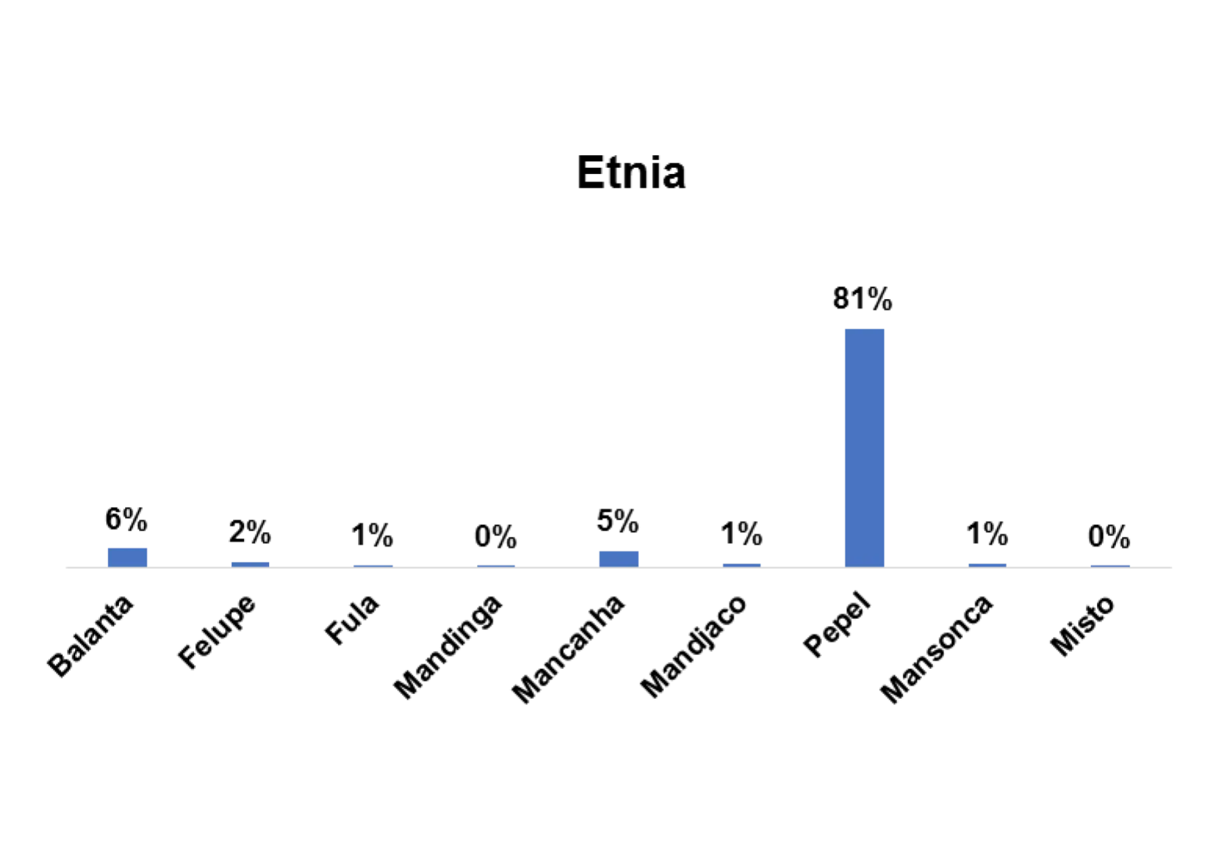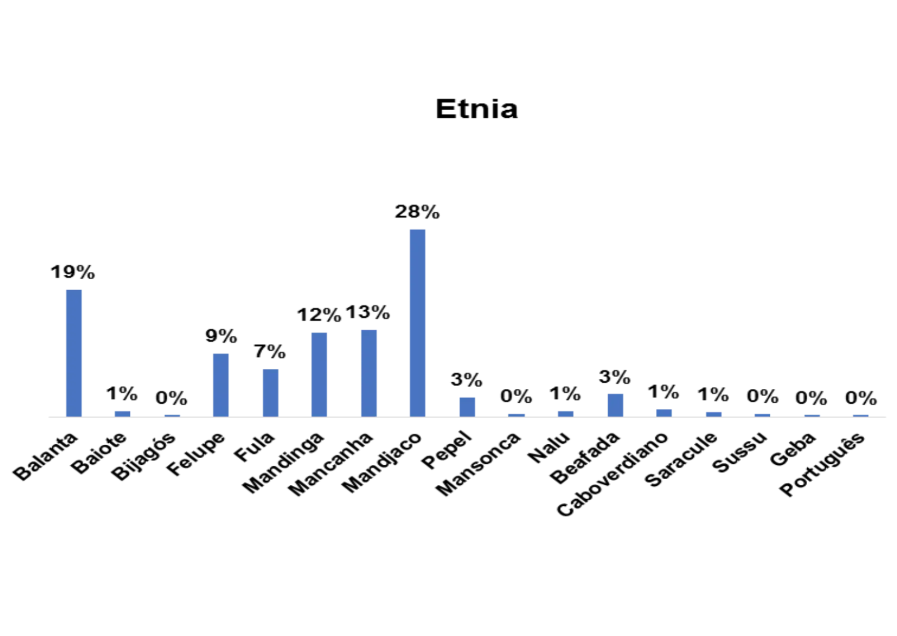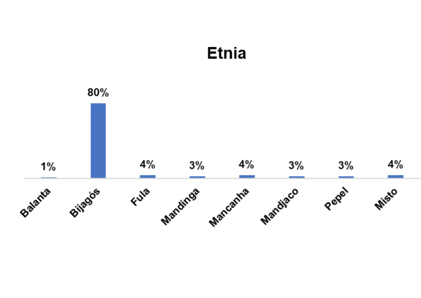 Segundo o gráfico 1, a etnia predominante entre os/as entrevistados/as no estudo na região de Bolama/Bijagós é a etnia Bijagós, representado por 80%.