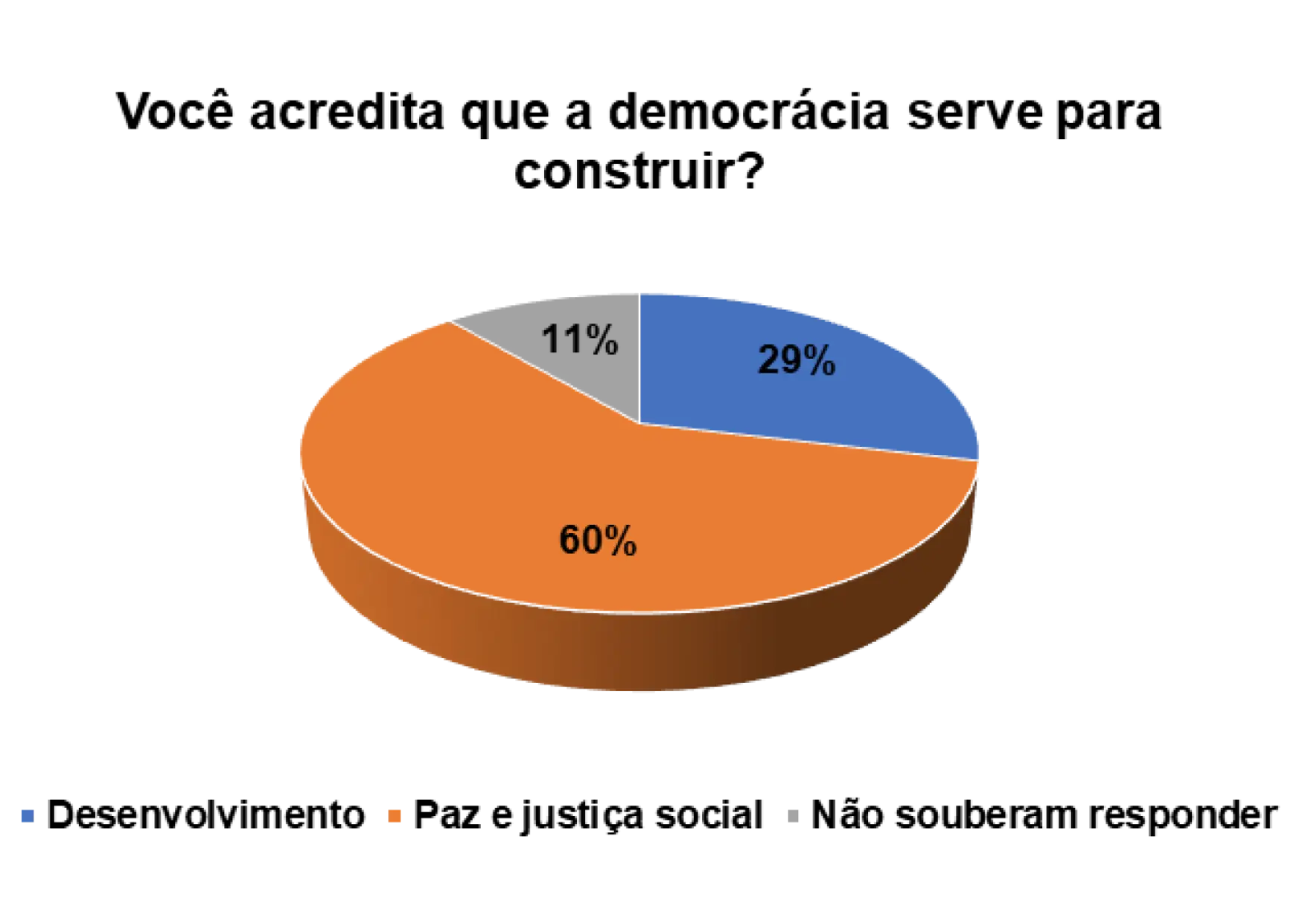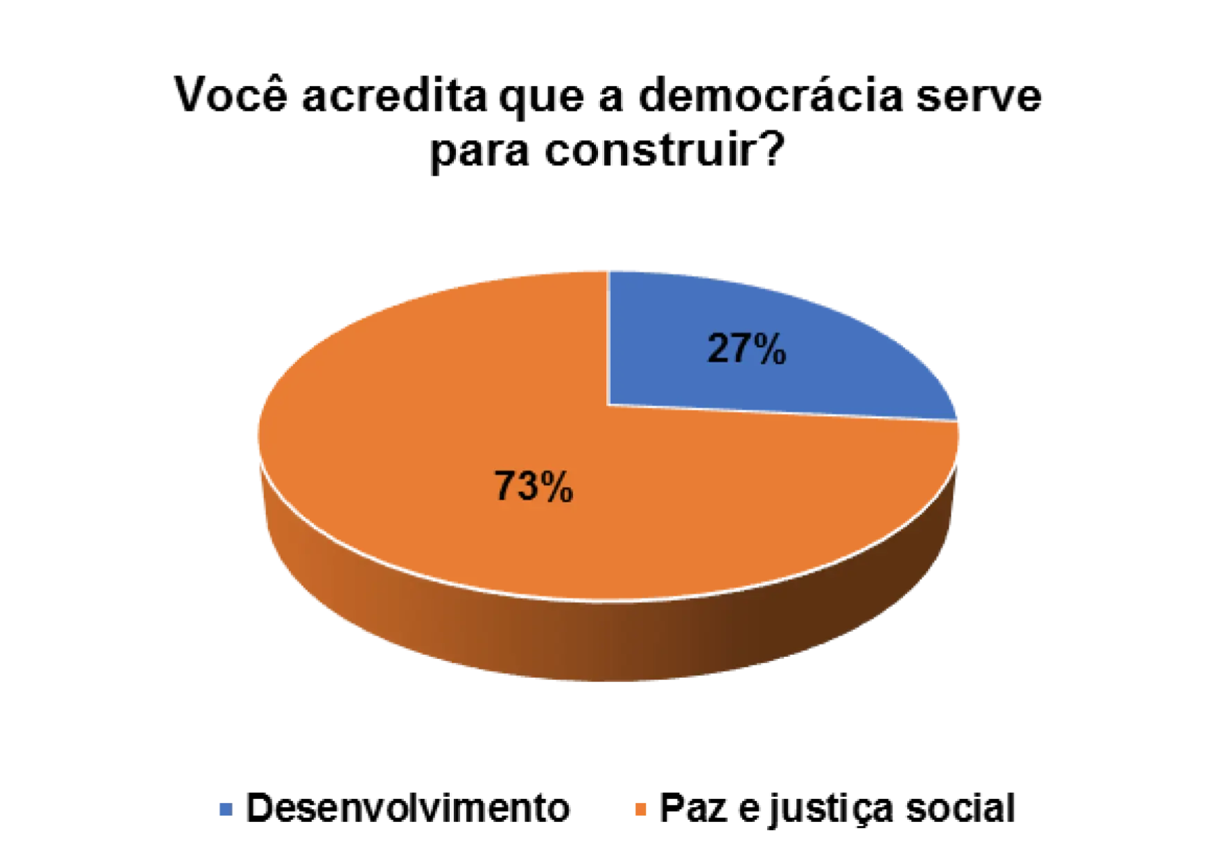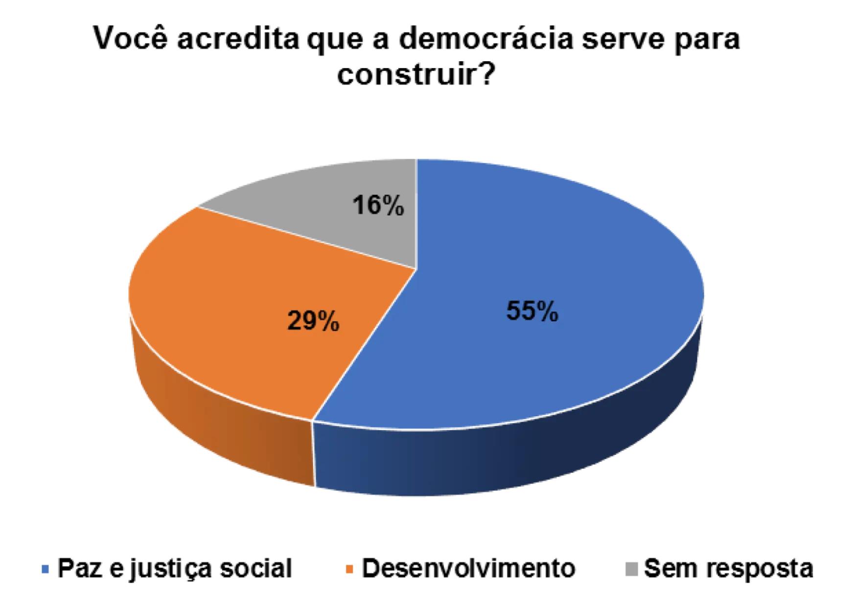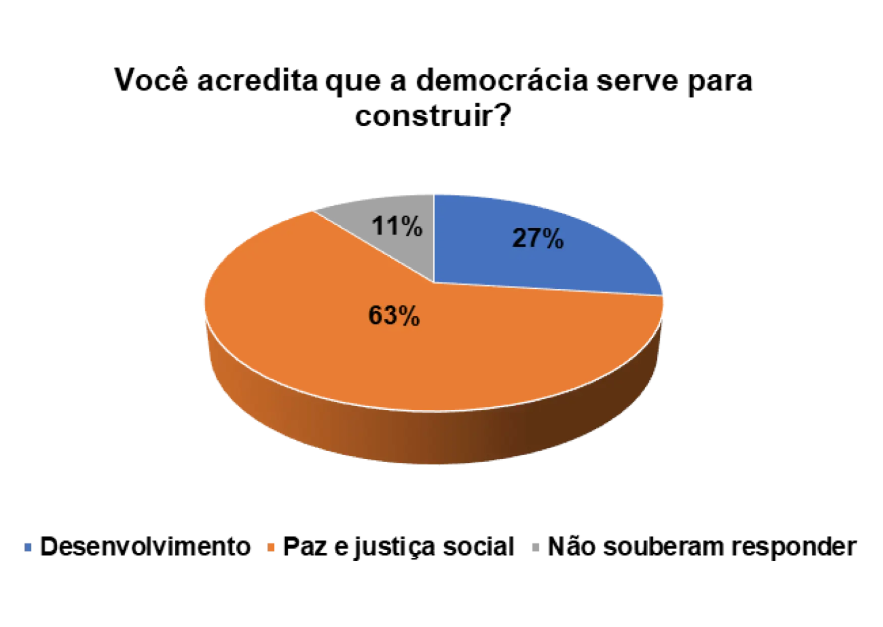 Quando questionados/as sobre o processo democrático do pais, num universo de 152 entrevistados/as, 63% afirmam que a democracia serve para a paz e justiça social e 27% afirmam que a democracia serve para o desenvolvimento do pais.