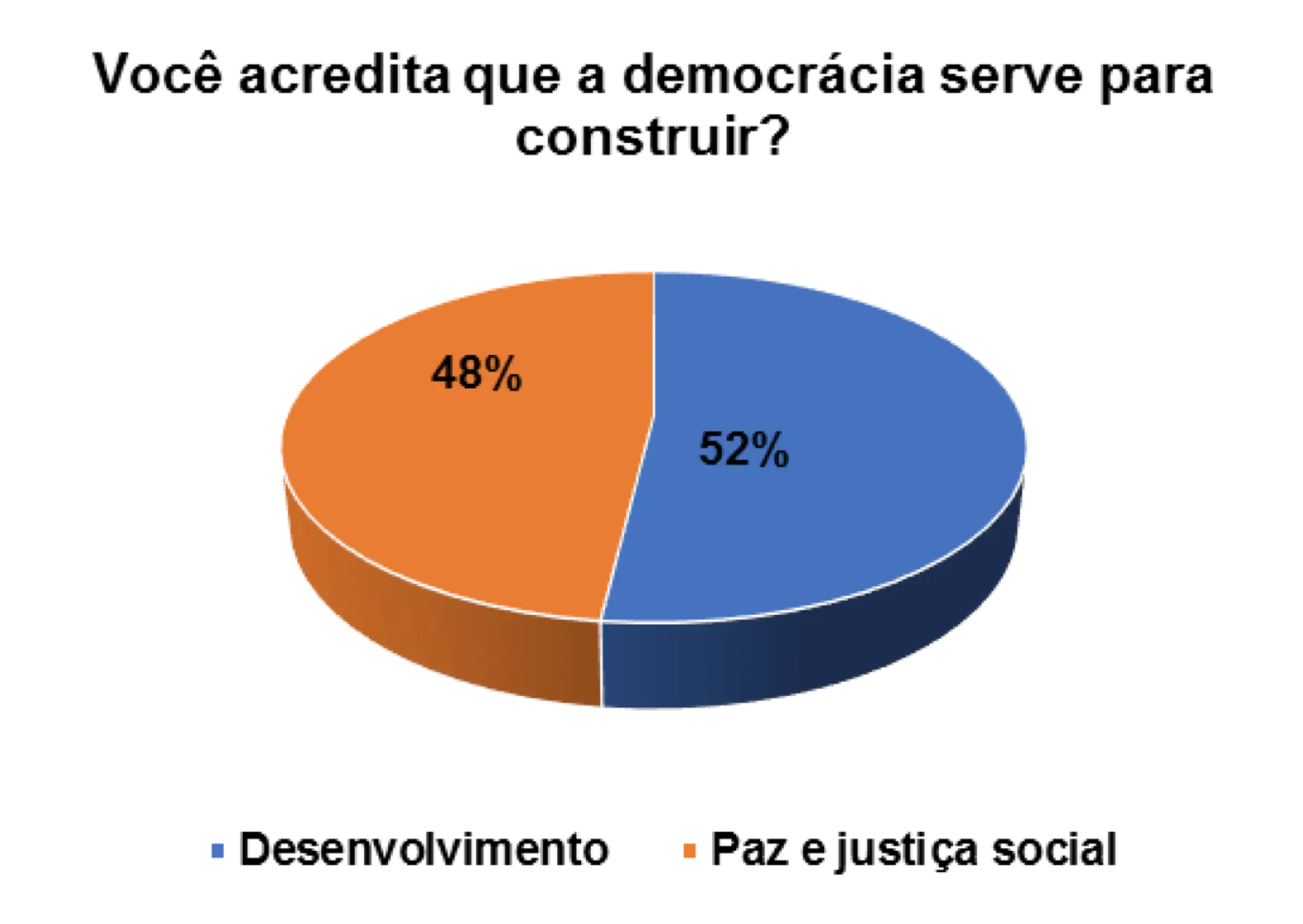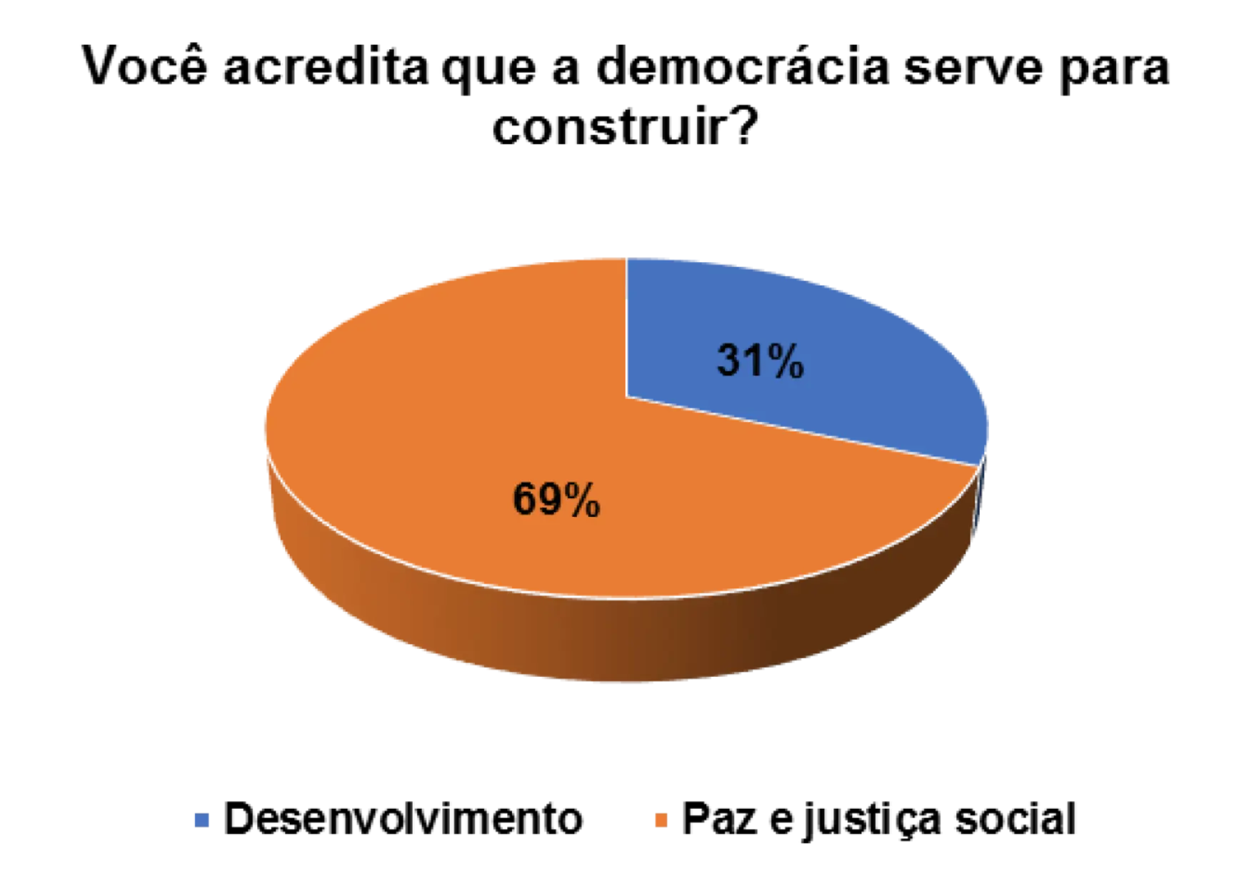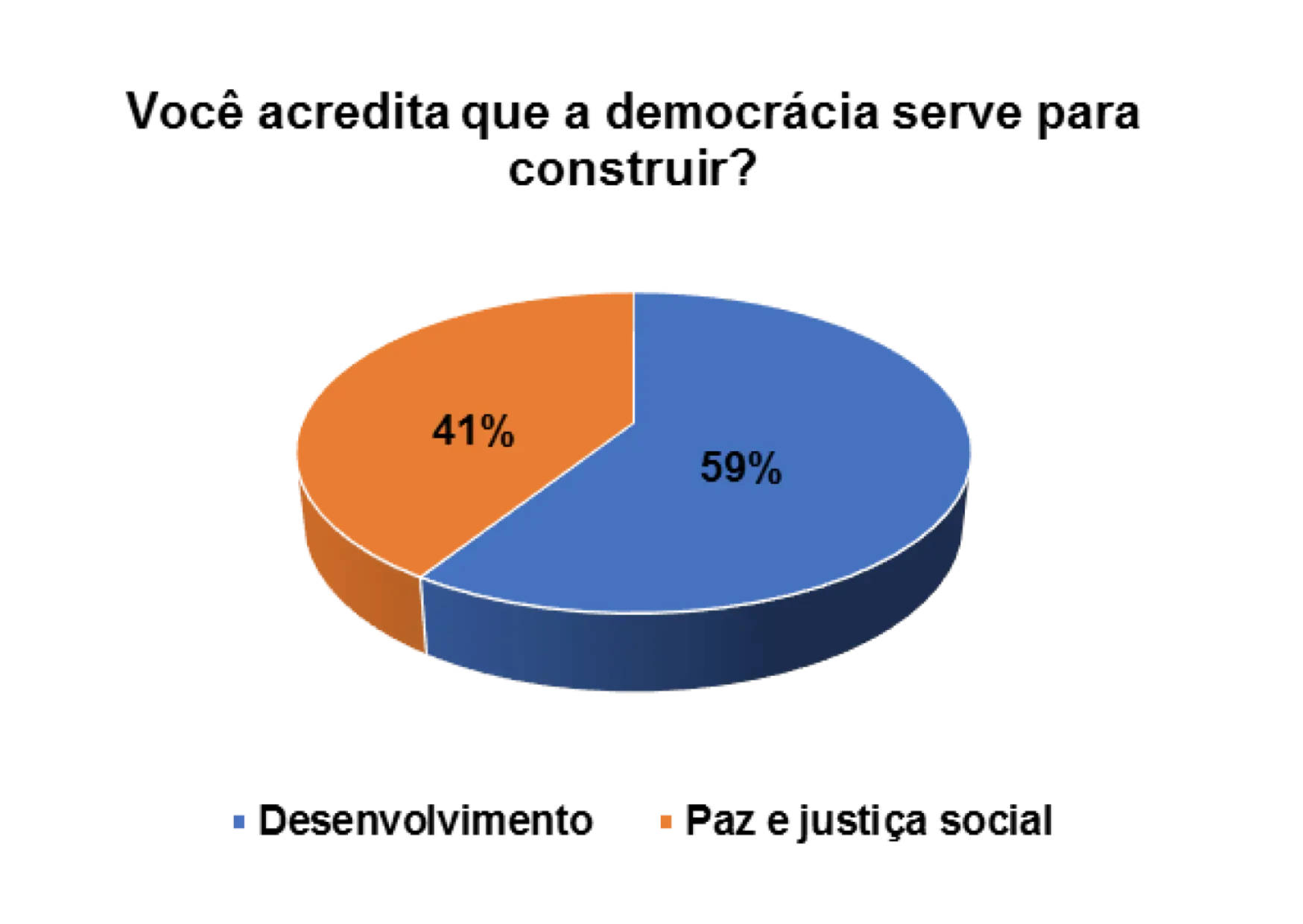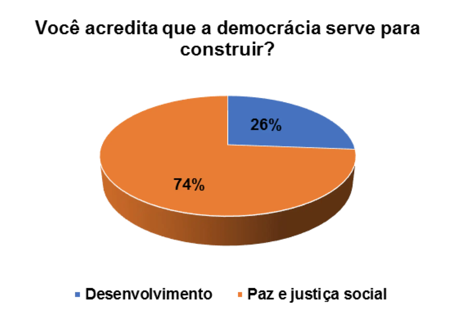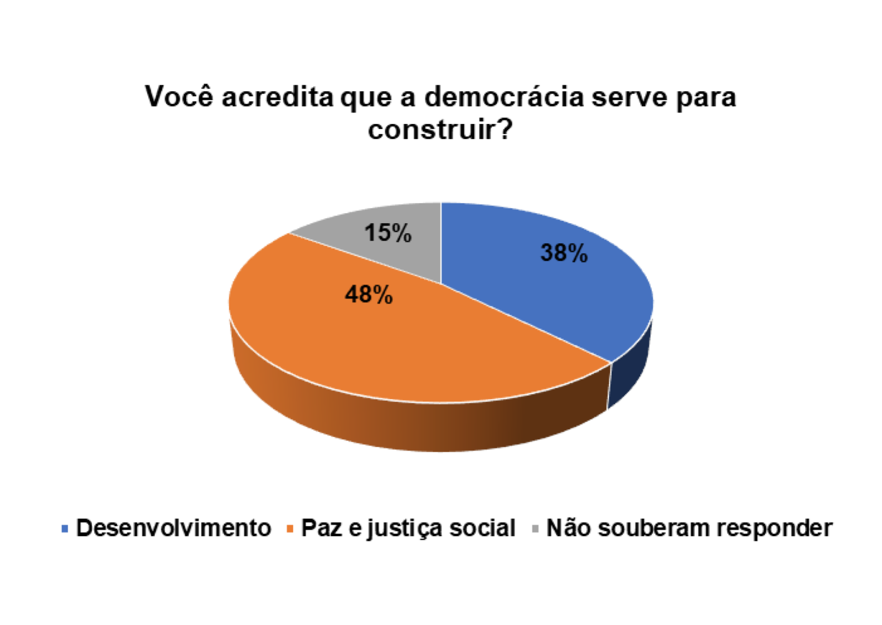 Quando questionados/as sobre o processo democrático do pais, num universo de 152 entrevistados/as, 63% afirmam que a democracia serve para a paz e justiça social e 27% afirmam que a democracia serve para o desenvolvimento do pais.