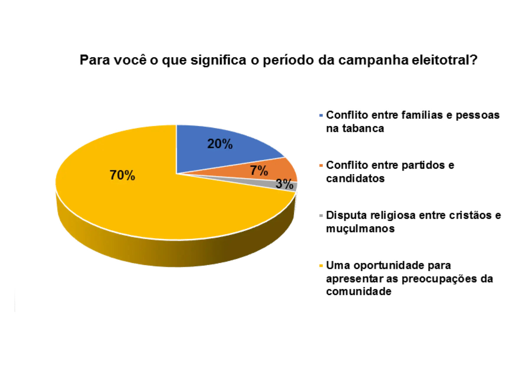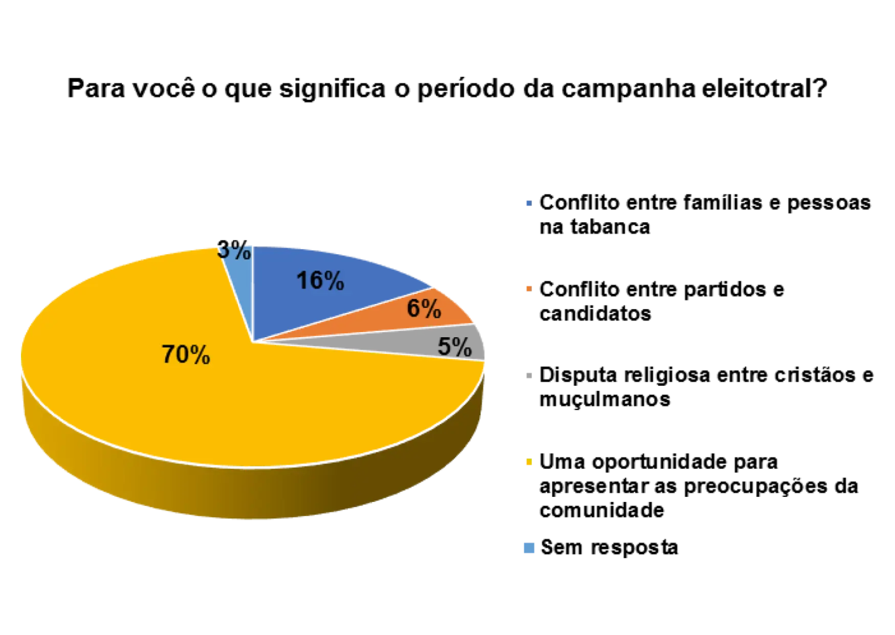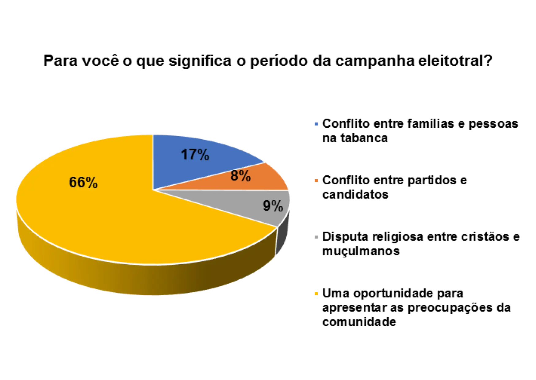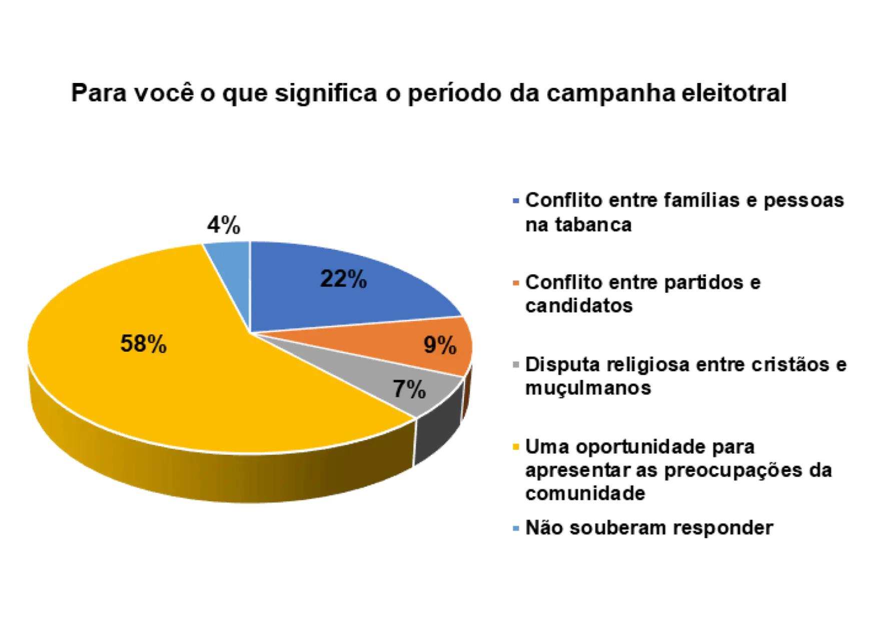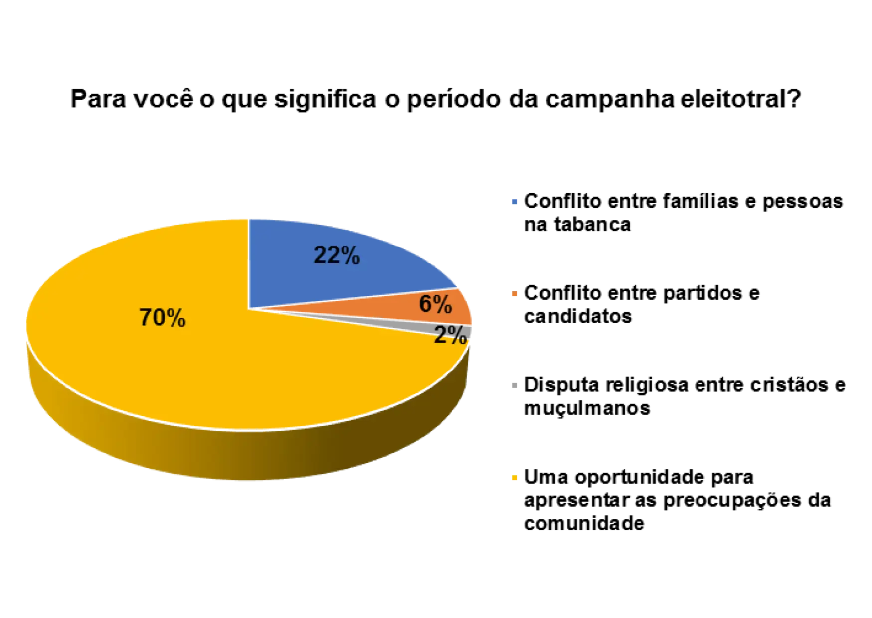 De acordo com o gráfico 21, 58% dos entrevistados/as afirmam que o período da campanha eleitoral é uma oportunidade para apresentar as preocupações da comunidade, 22% responderam que o período da campanha eleitoral significa conflitos entre famílias e pessoas na tabanca e 9% afirmam que significa conflito entre partidos e candidatos.