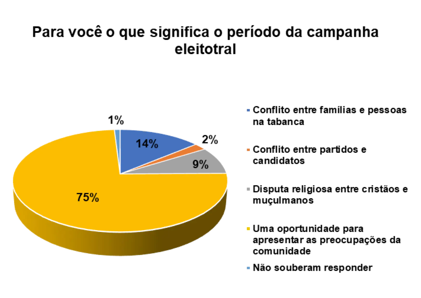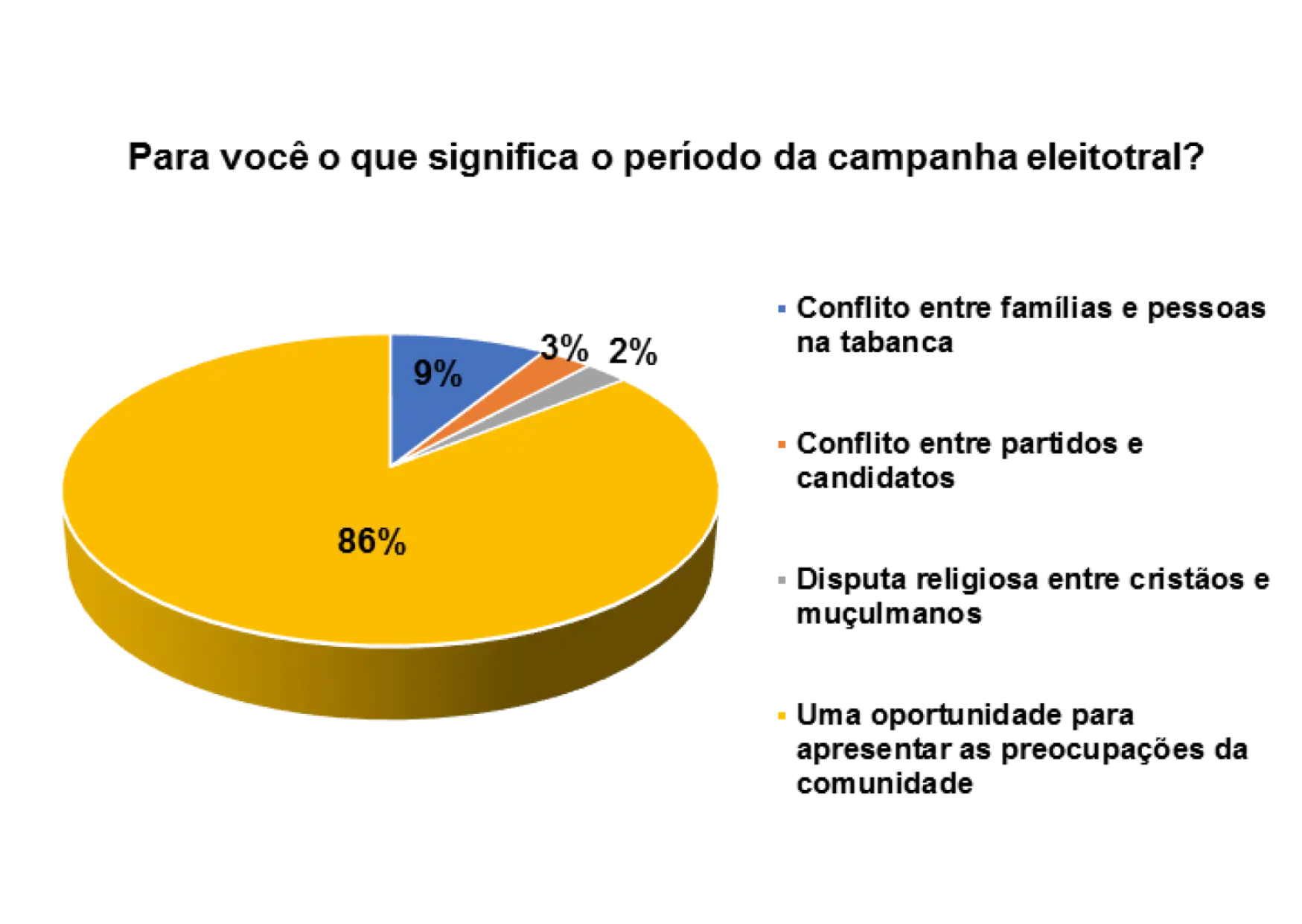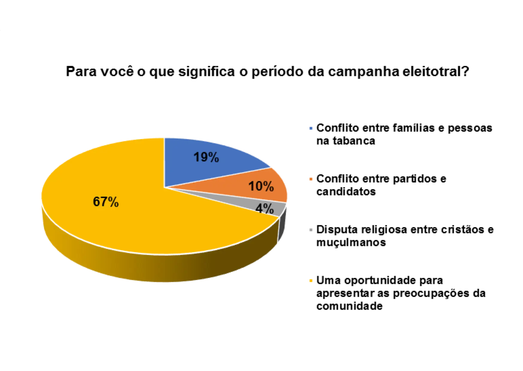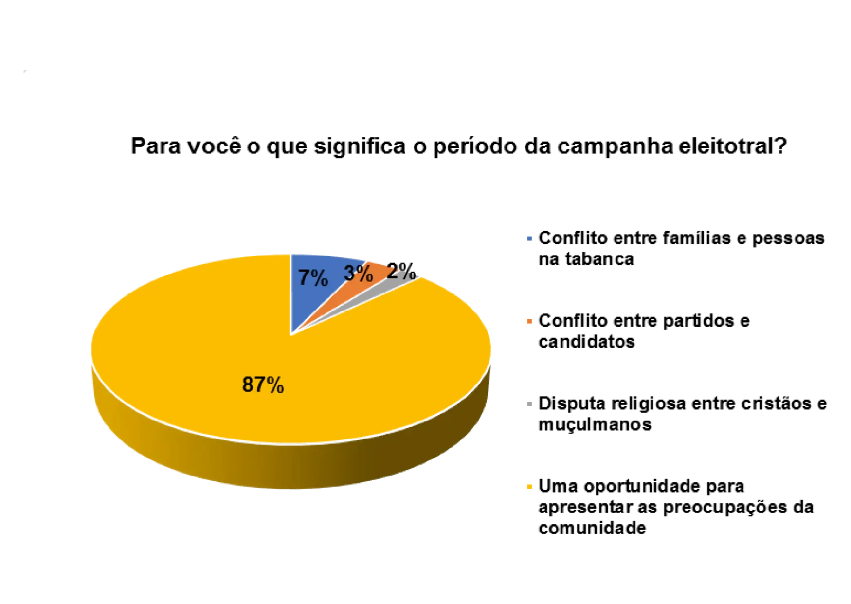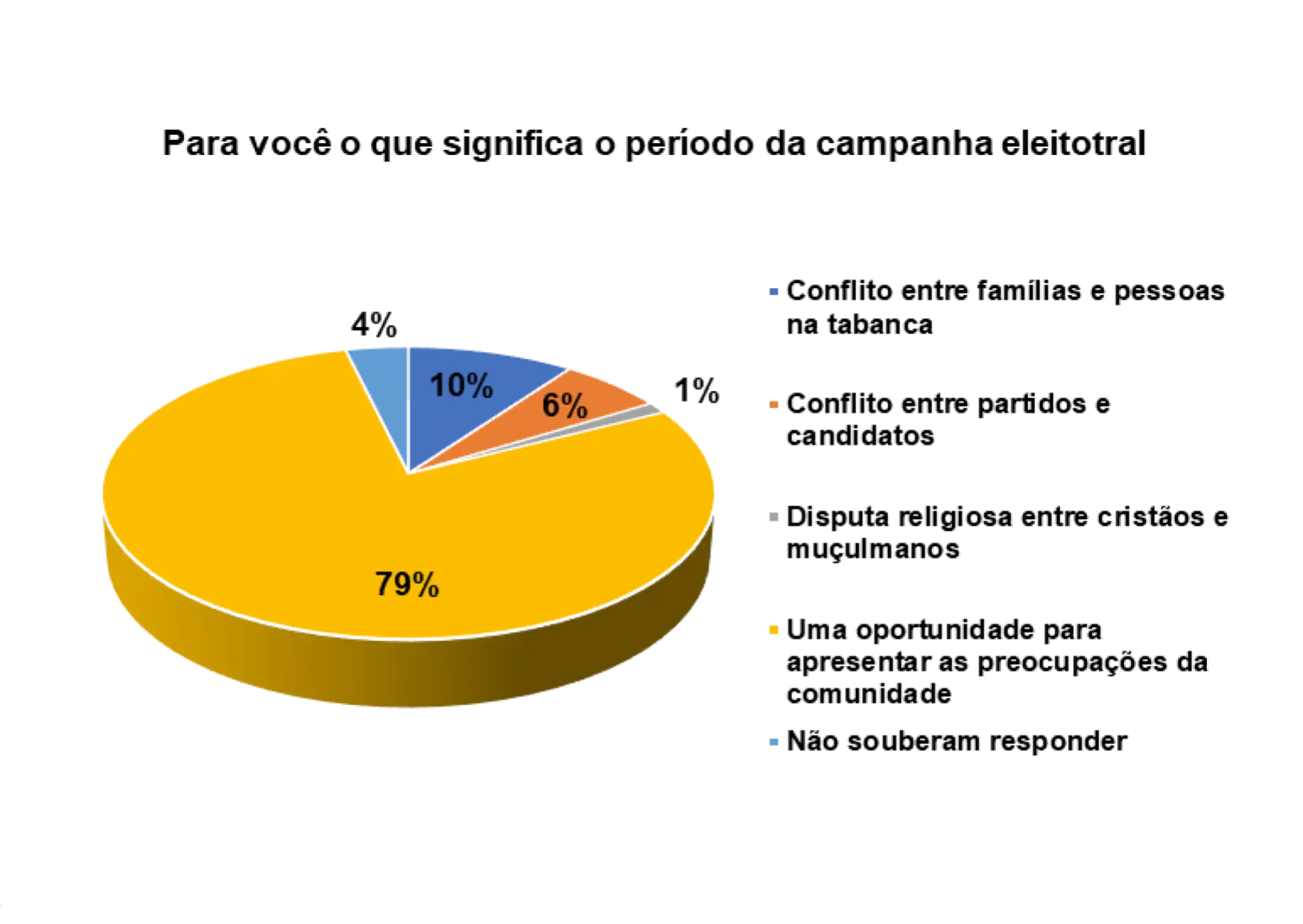 De acordo com o gráfico 21, 58% dos entrevistados/as afirmam que o período da campanha eleitoral é uma oportunidade para apresentar as preocupações da comunidade, 22% responderam que o período da campanha eleitoral significa conflitos entre famílias e pessoas na tabanca e 9% afirmam que significa conflito entre partidos e candidatos.