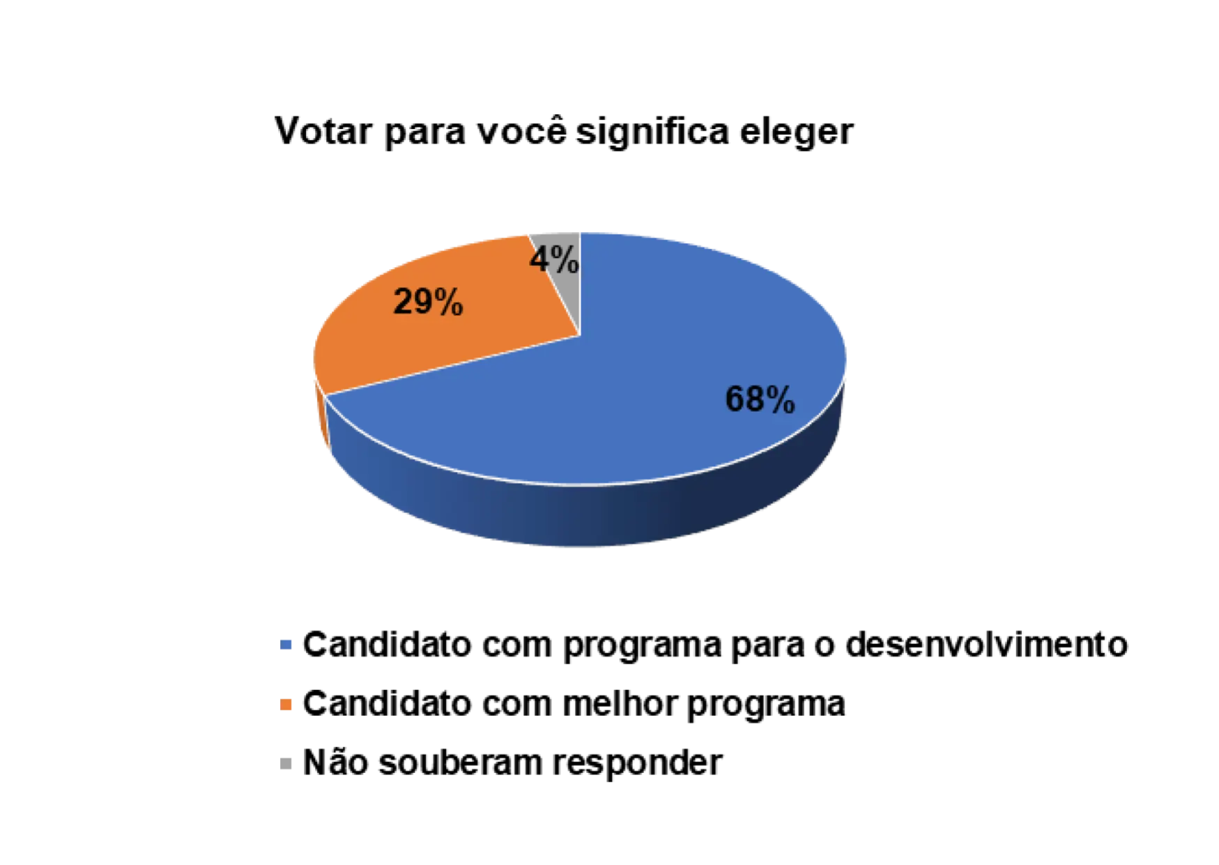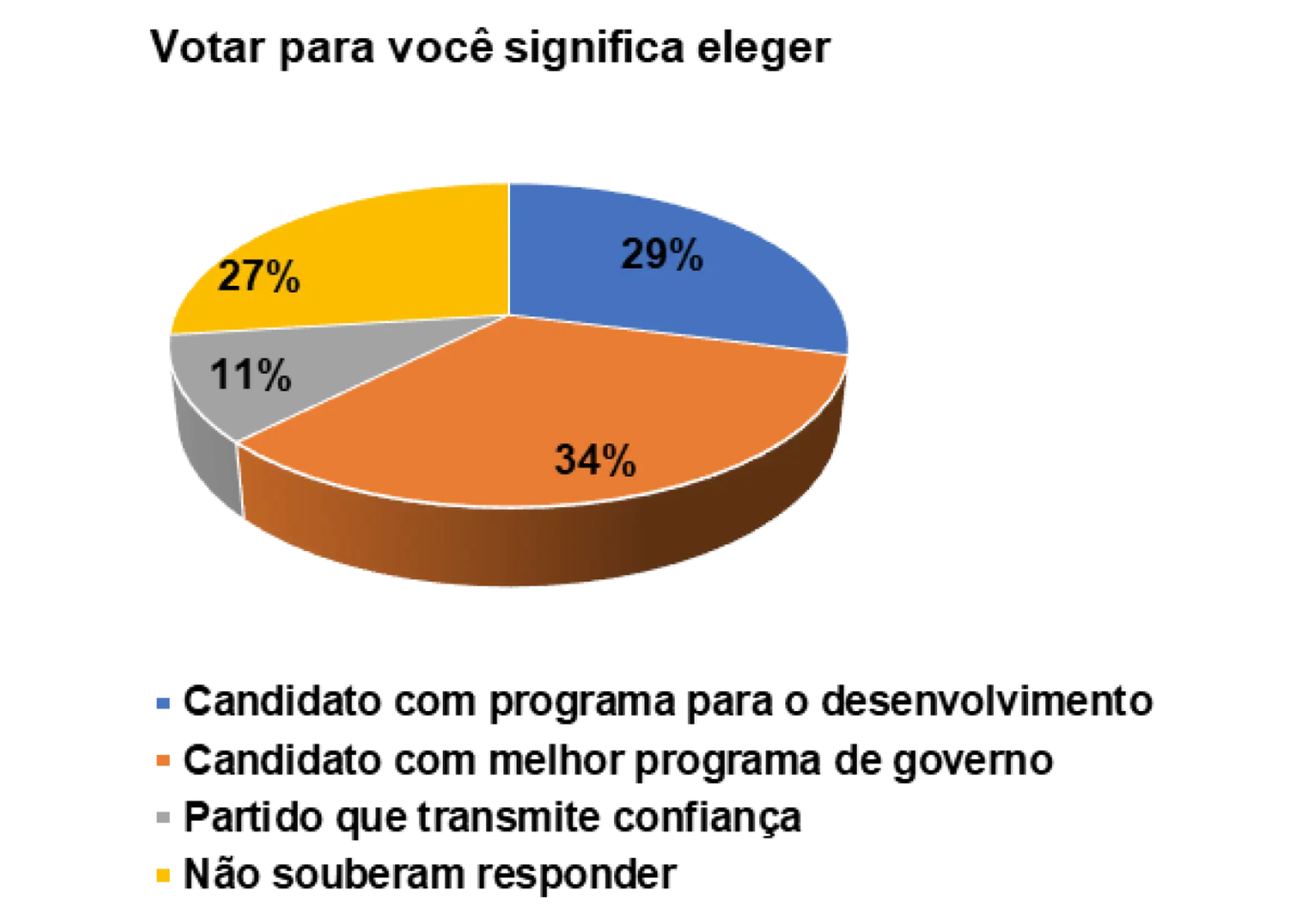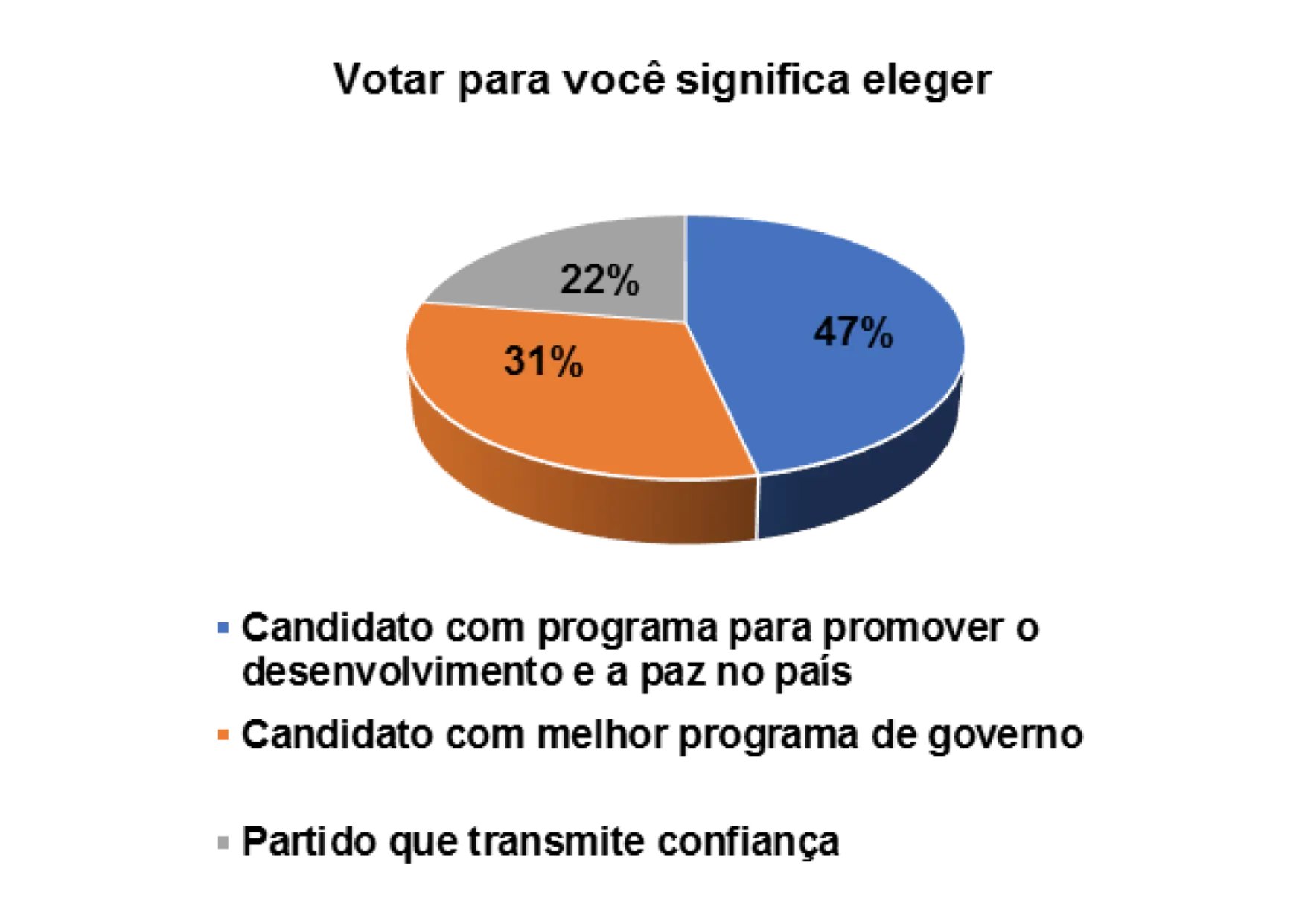 Nesse sentido, quando questionados sobre a importância do processo democrático para o pais, num universo de 152 eleitores entrevistados, 63% afirmam que a democracia serve para construir a paz e justiça social e 27% afirmam que a democracia serve para o desenvolvimento do pais. Obviamente, os eleitores demonstraram que a democracia serve para construir as duas coisas e, consequentemente, permitir que os cidadãos possam ter oportunidades para viver com dignidade.
