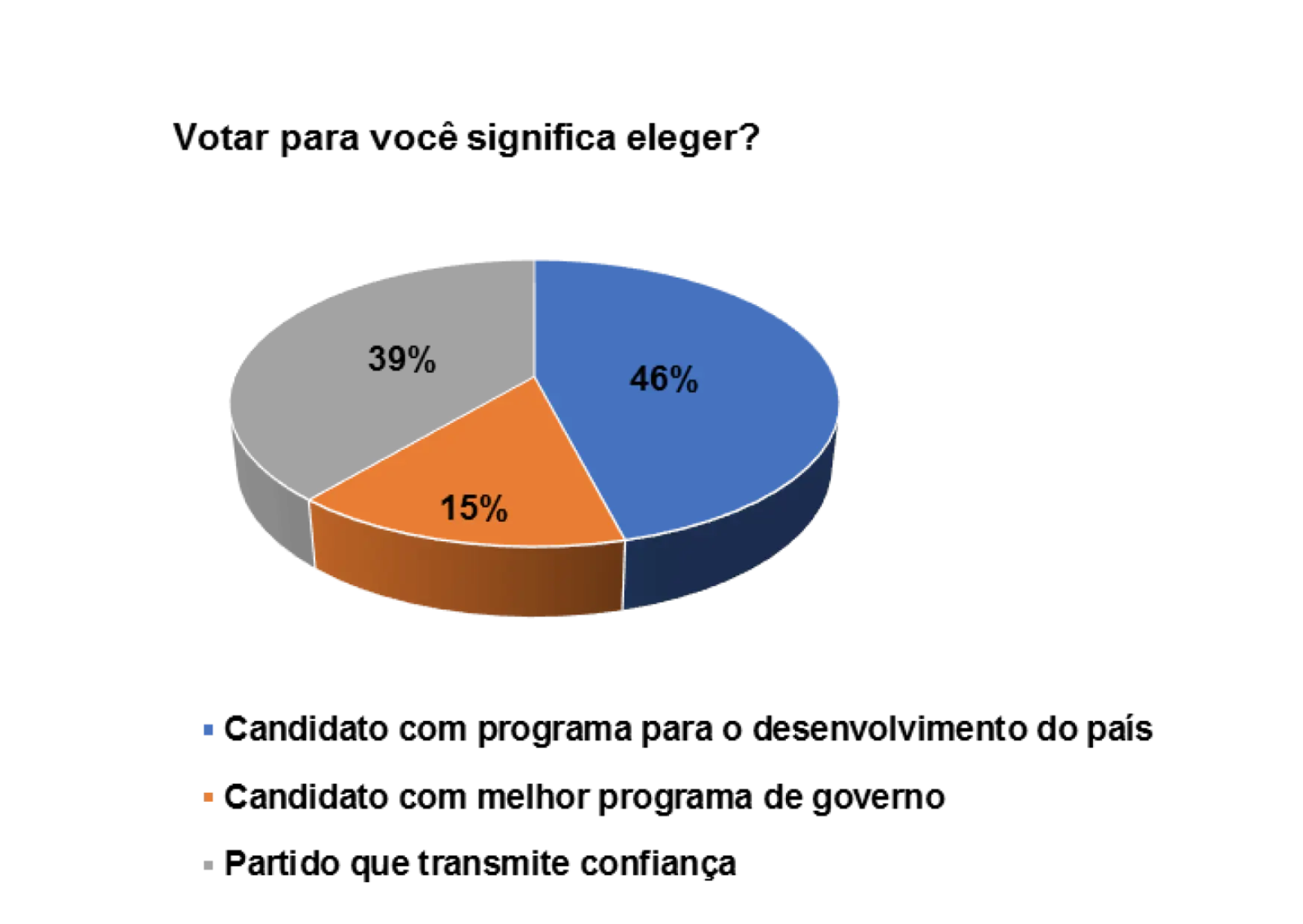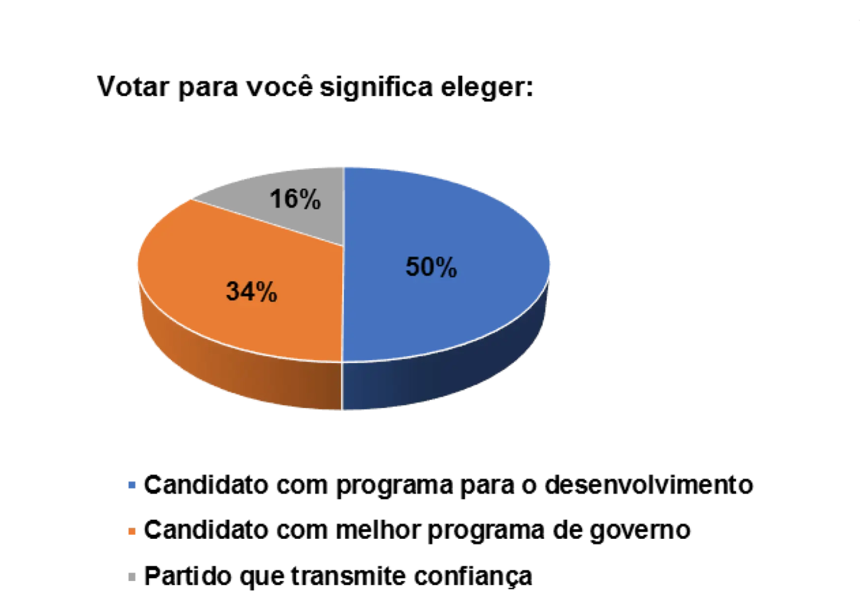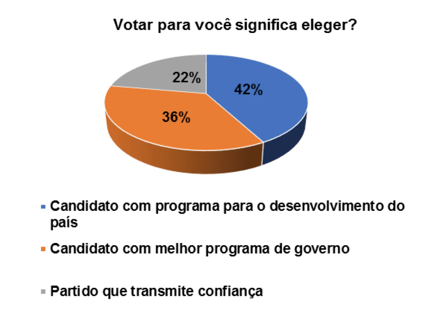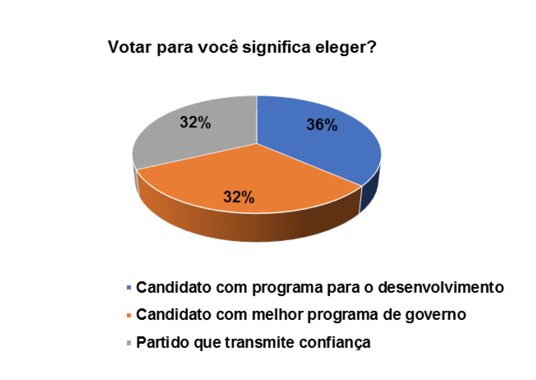 Nesse sentido, quando questionados sobre a importância do processo democrático para o pais, num universo de 152 eleitores entrevistados, 63% afirmam que a democracia serve para construir a paz e justiça social e 27% afirmam que a democracia serve para o desenvolvimento do pais. Obviamente, os eleitores demonstraram que a democracia serve para construir as duas coisas e, consequentemente, permitir que os cidadãos possam ter oportunidades para viver com dignidade.