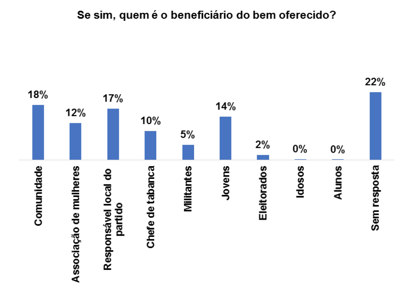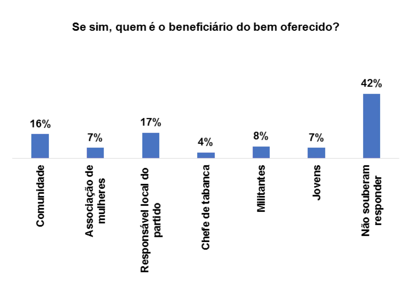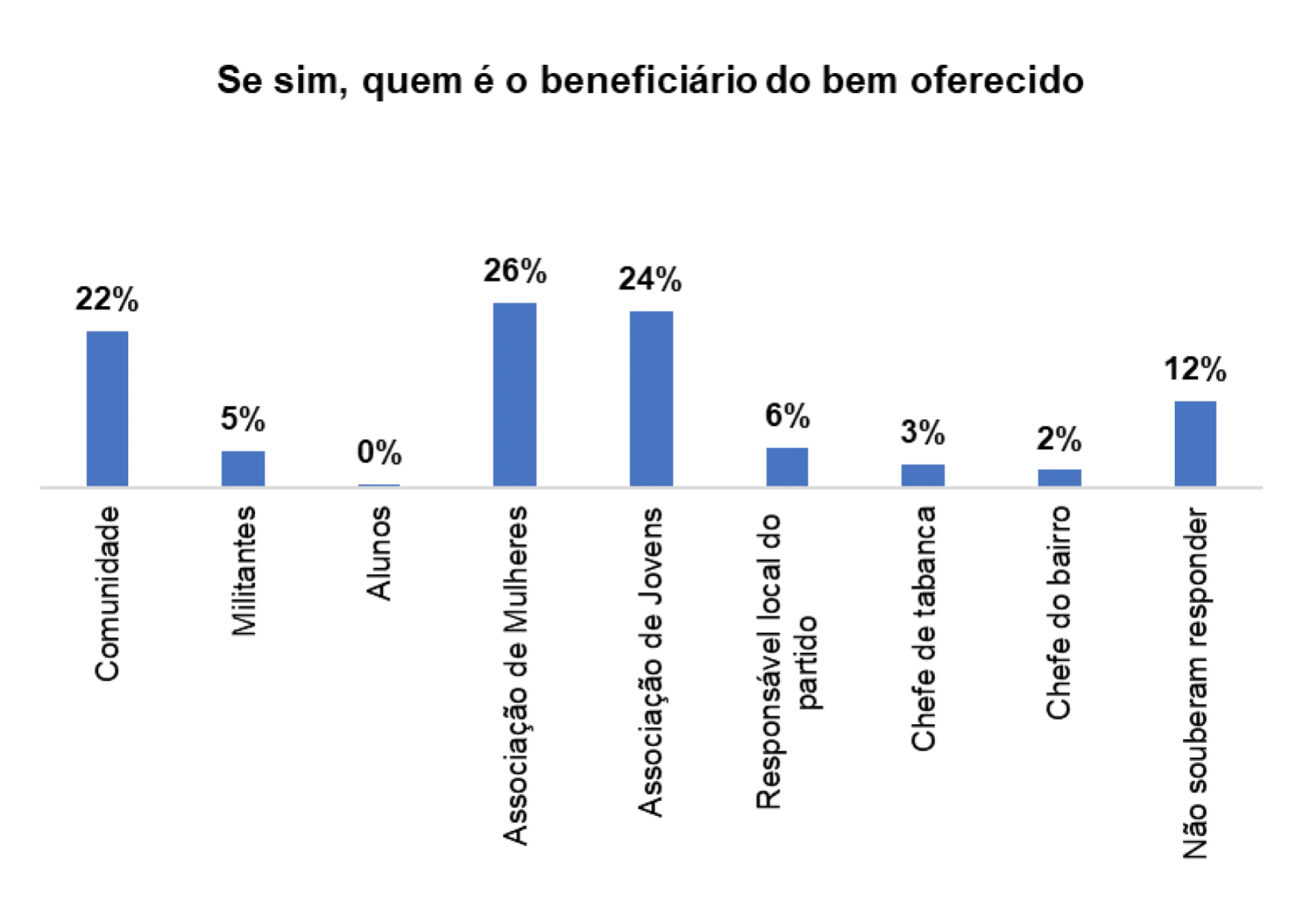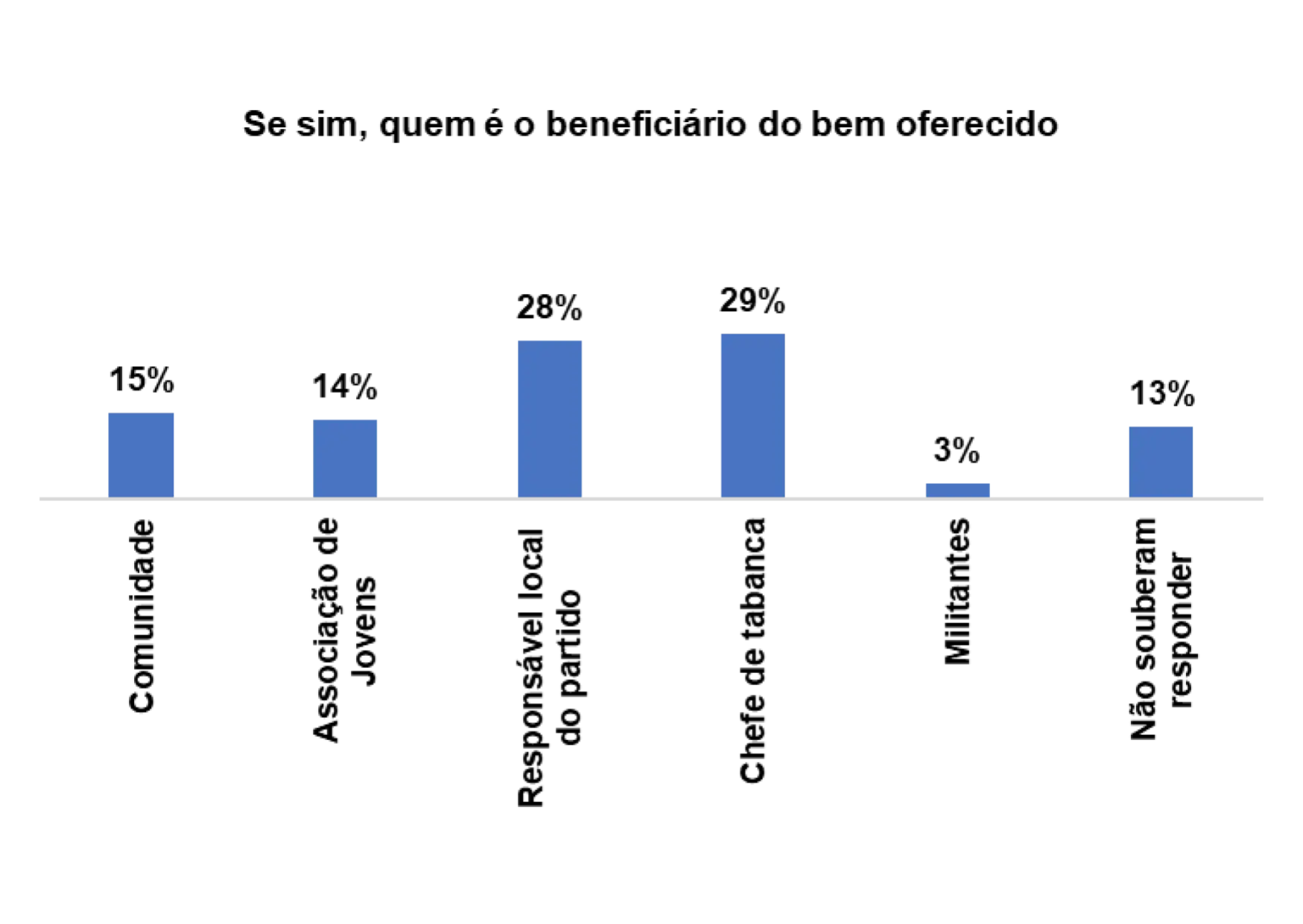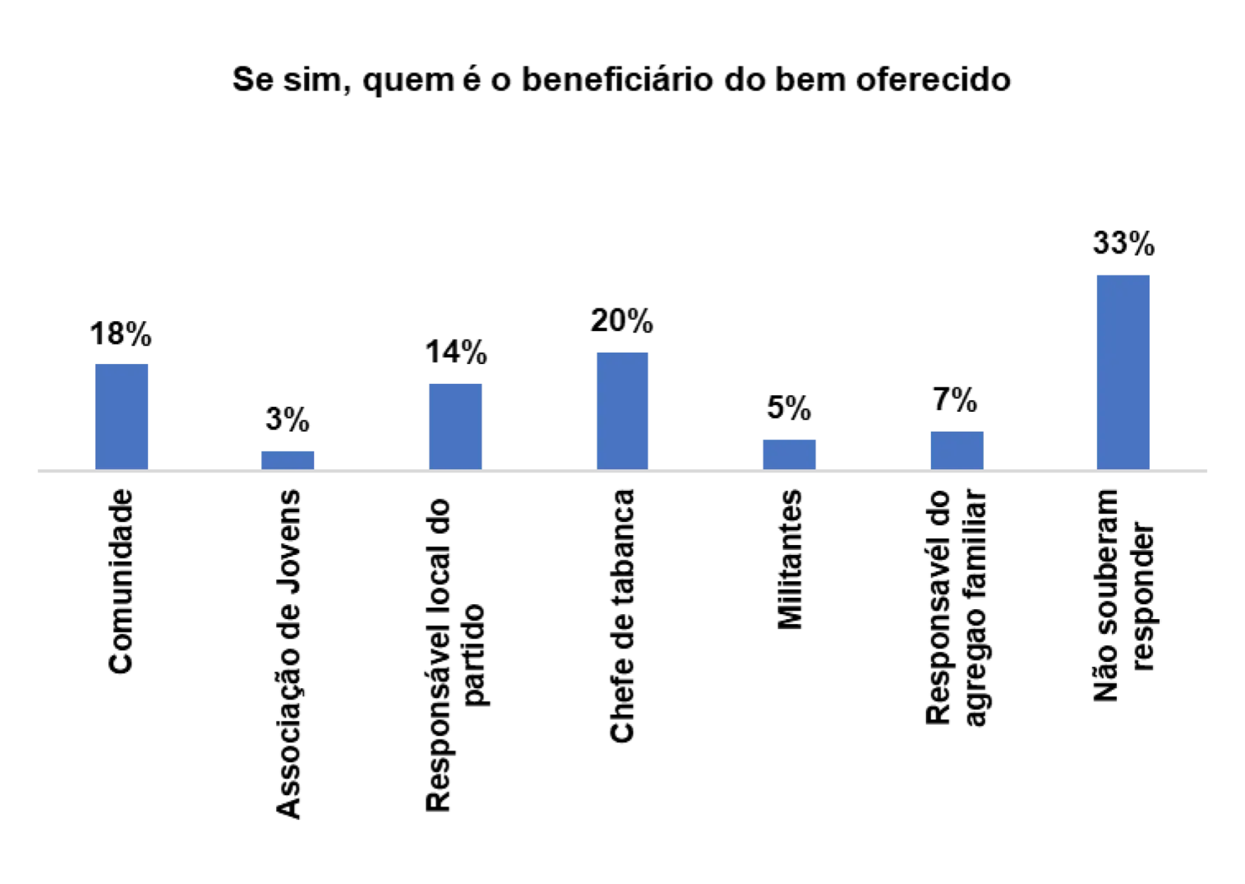 Os principais beneficiários, segundo os/as entrevistados/as são: a comunidade (18%), o responsável local do partido (14%) e ou chefe de tabanca (20%).