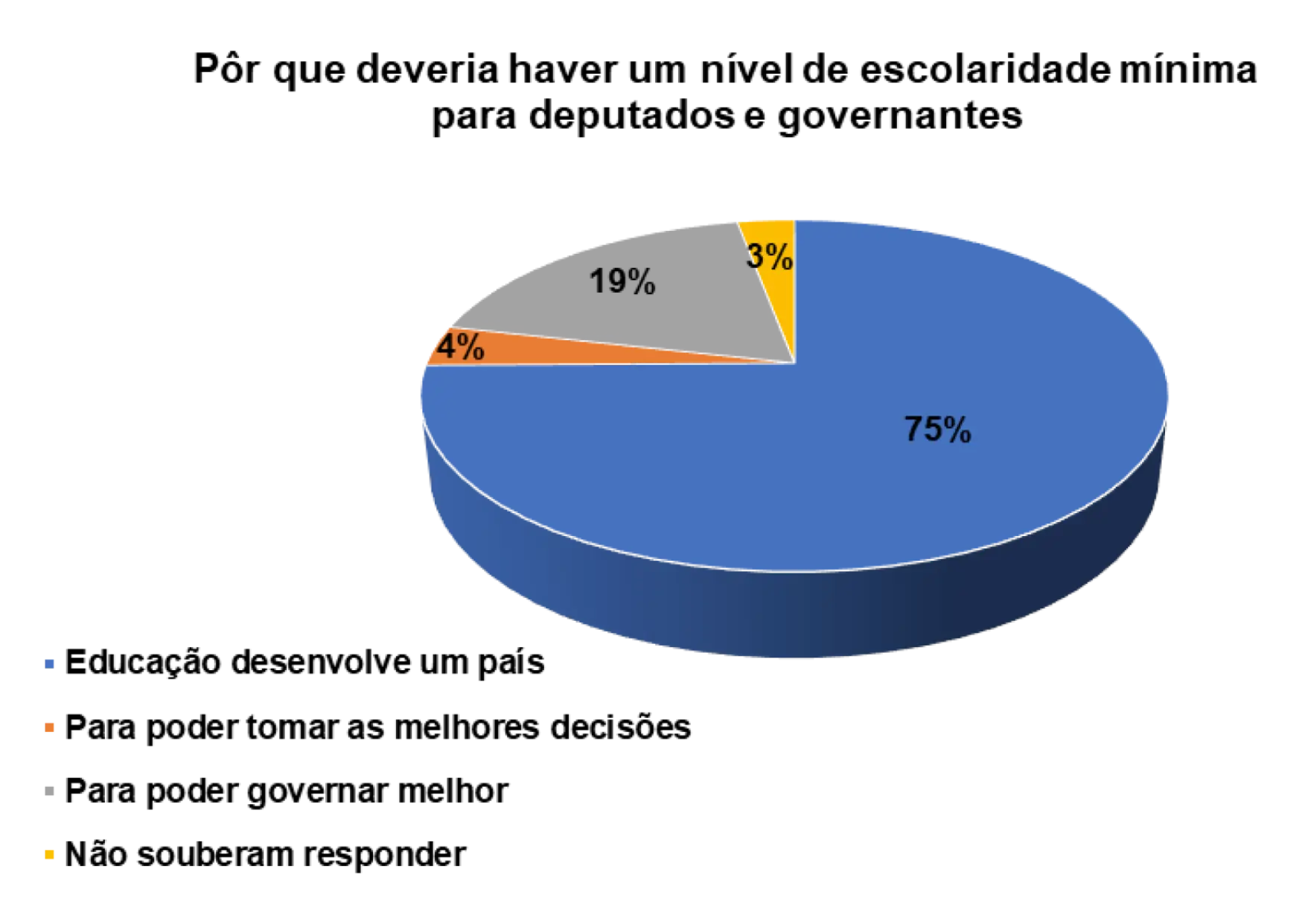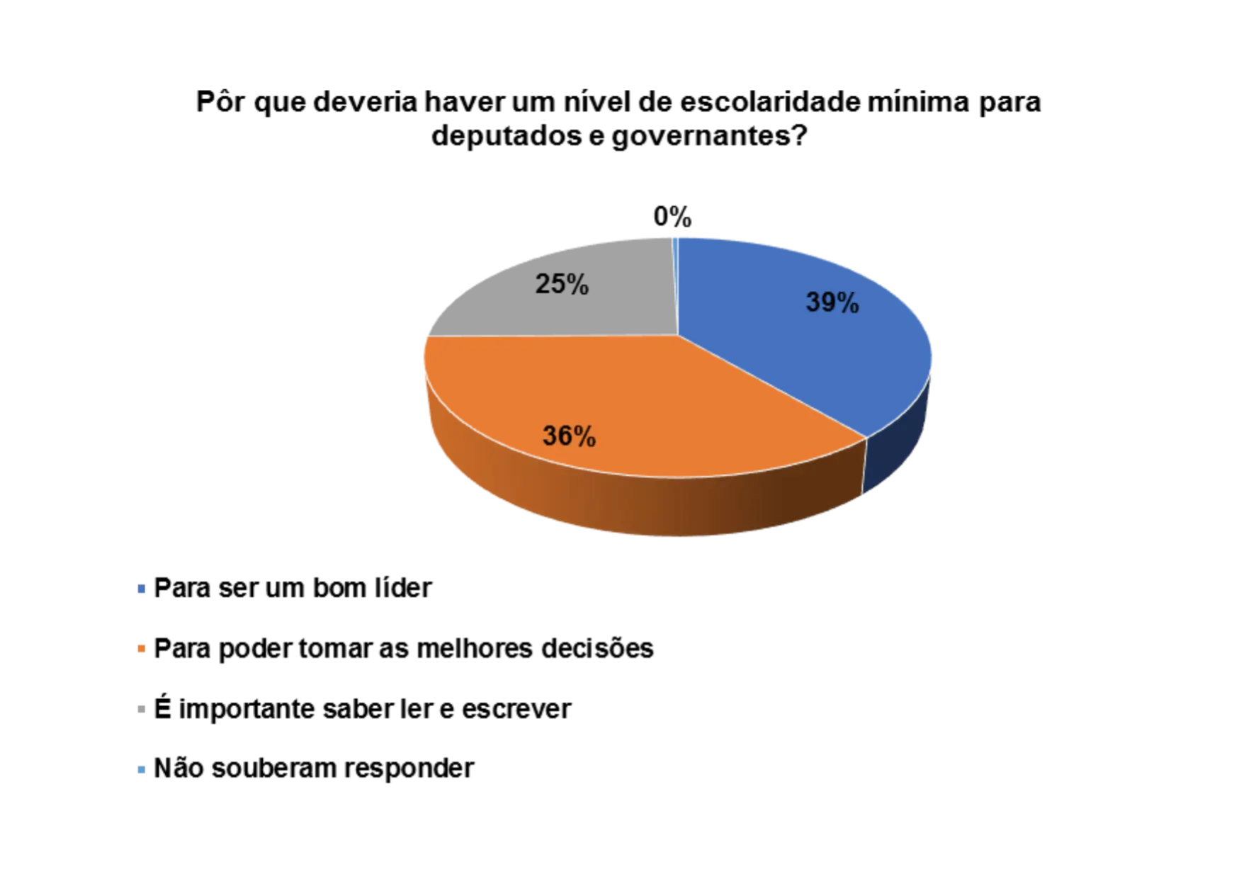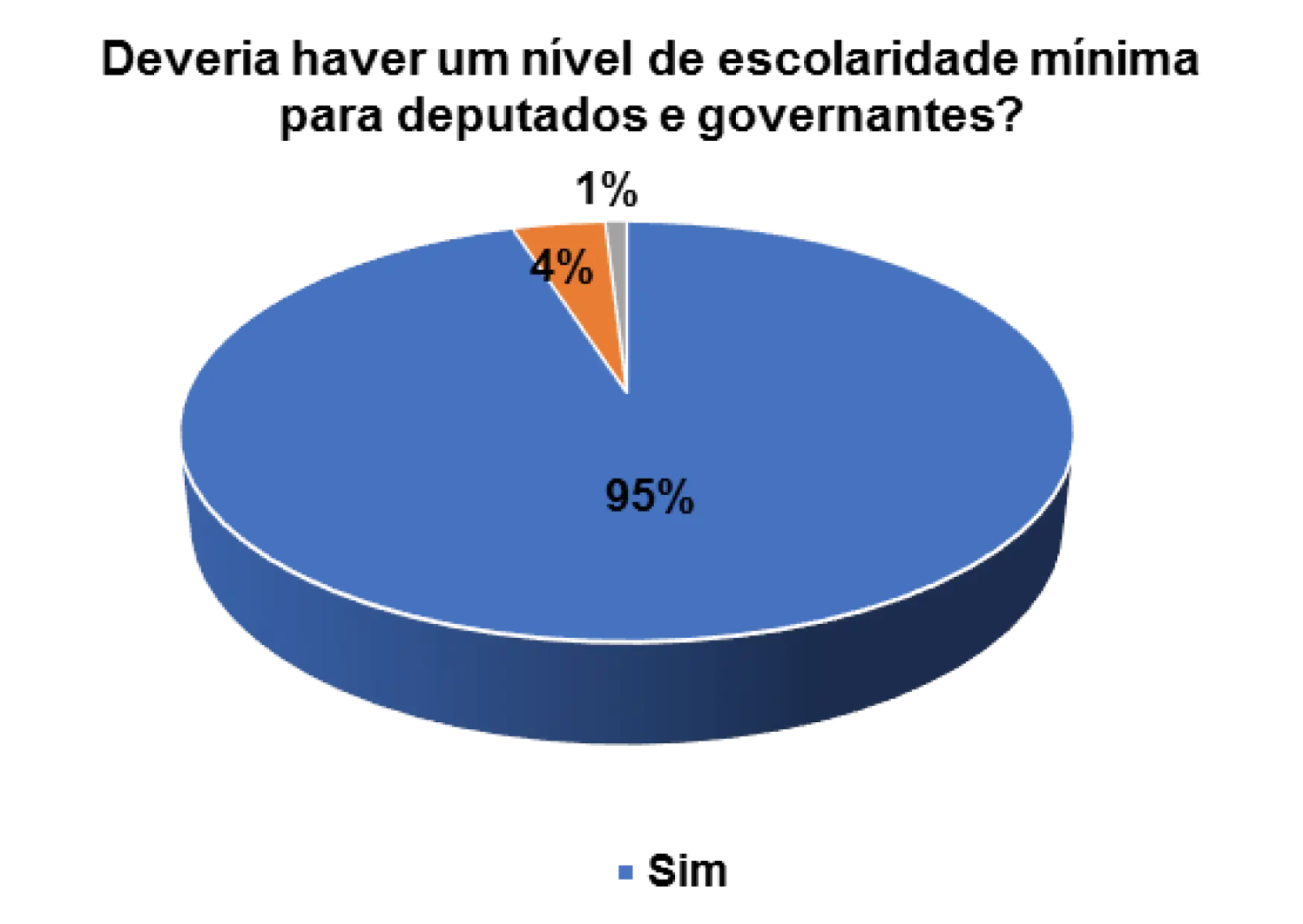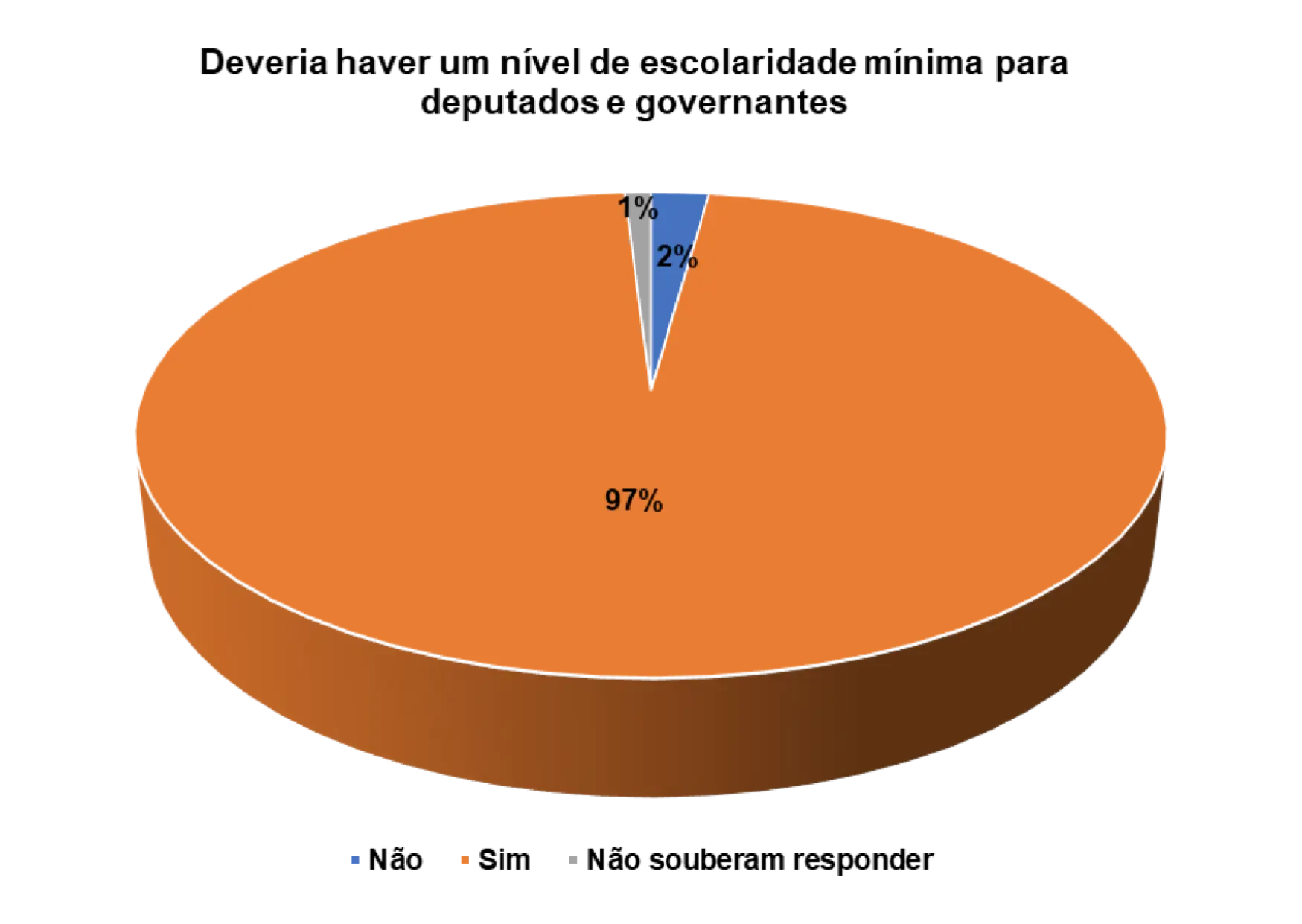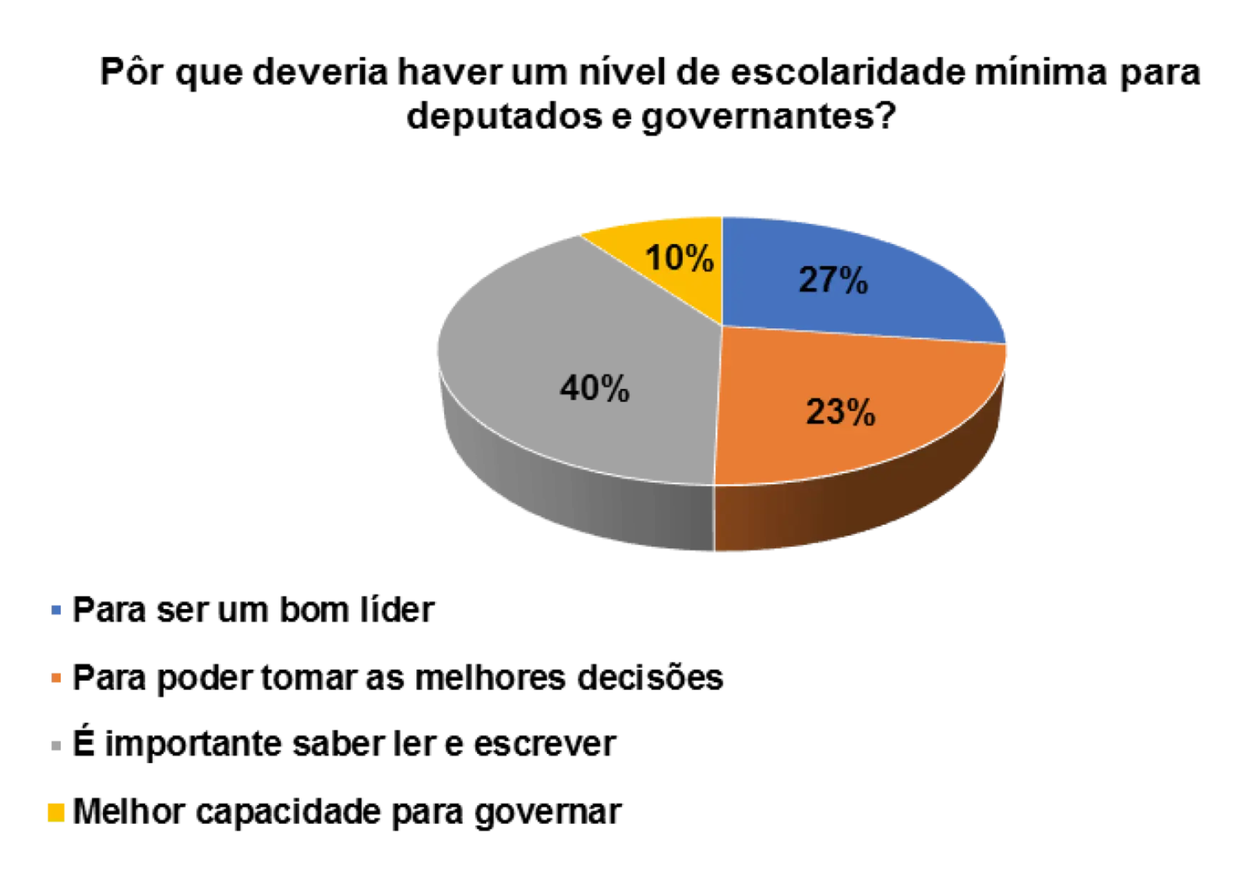 Quando questionados/as sobre a importância da escolaridade mínima para deputados e governantes, os 82% dos/as entrevistados/as afirmam que sim deveria haver um nível de escolaridade mínima para deputados e governantes.