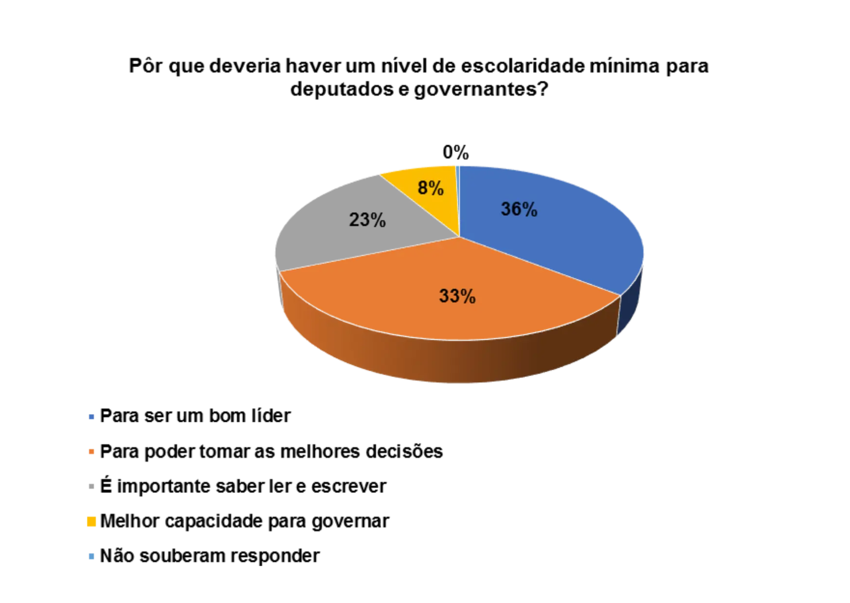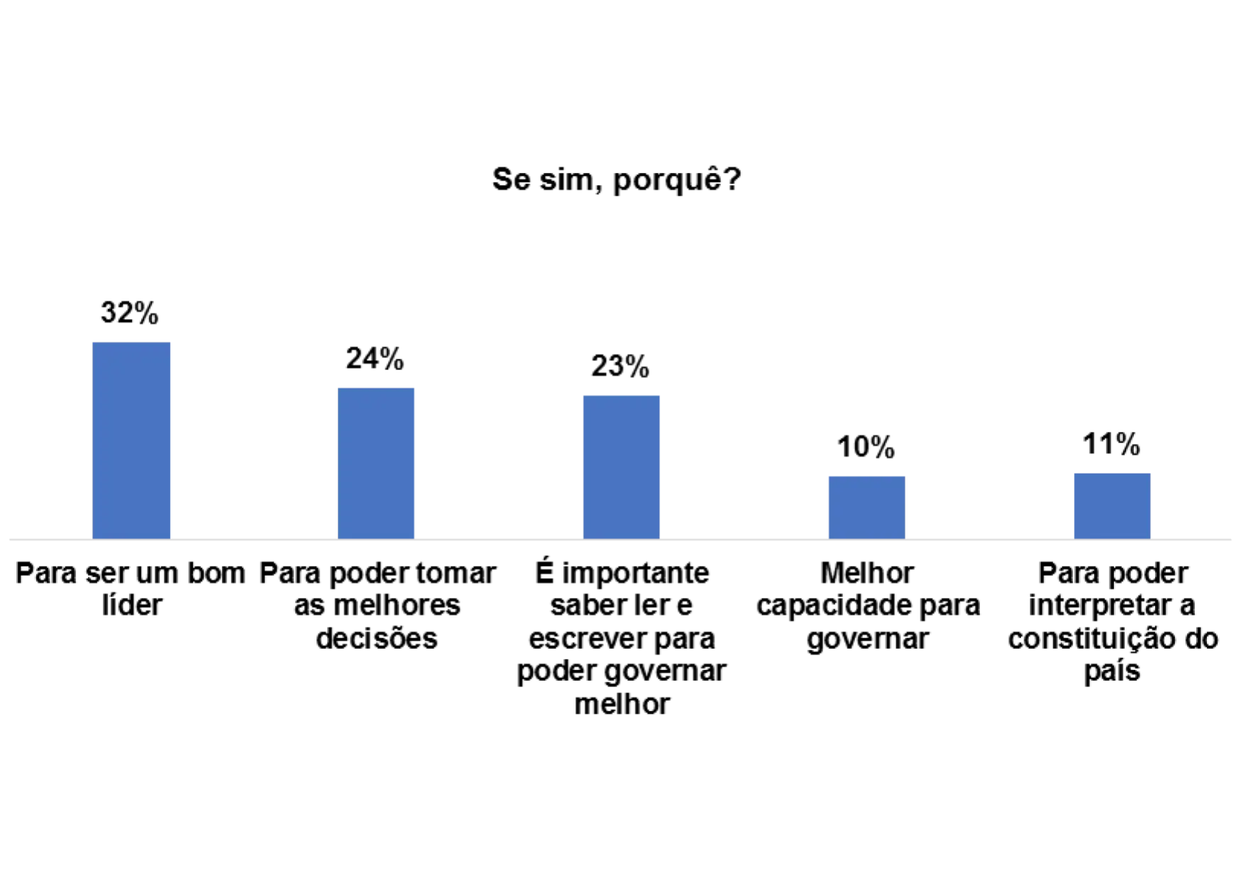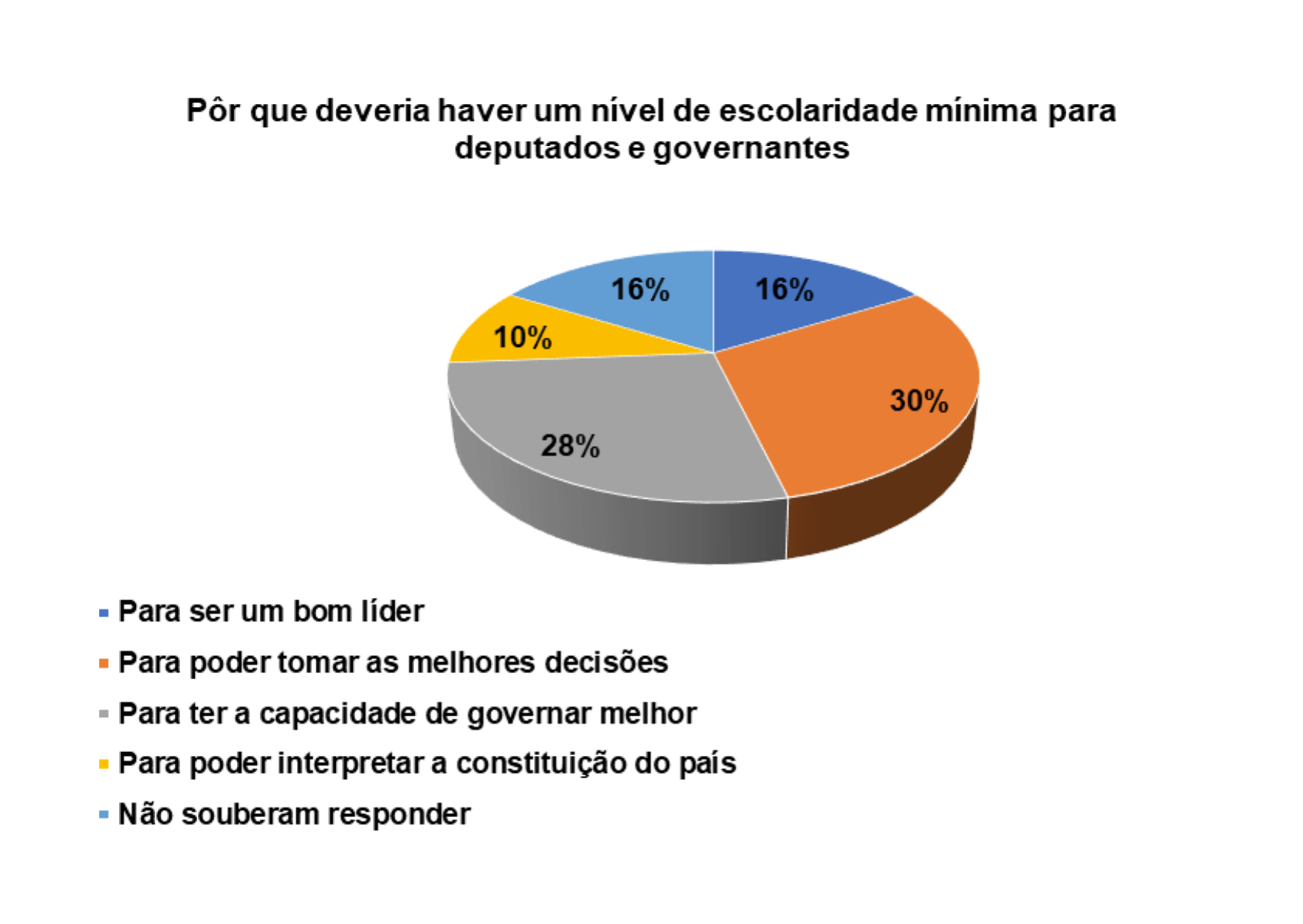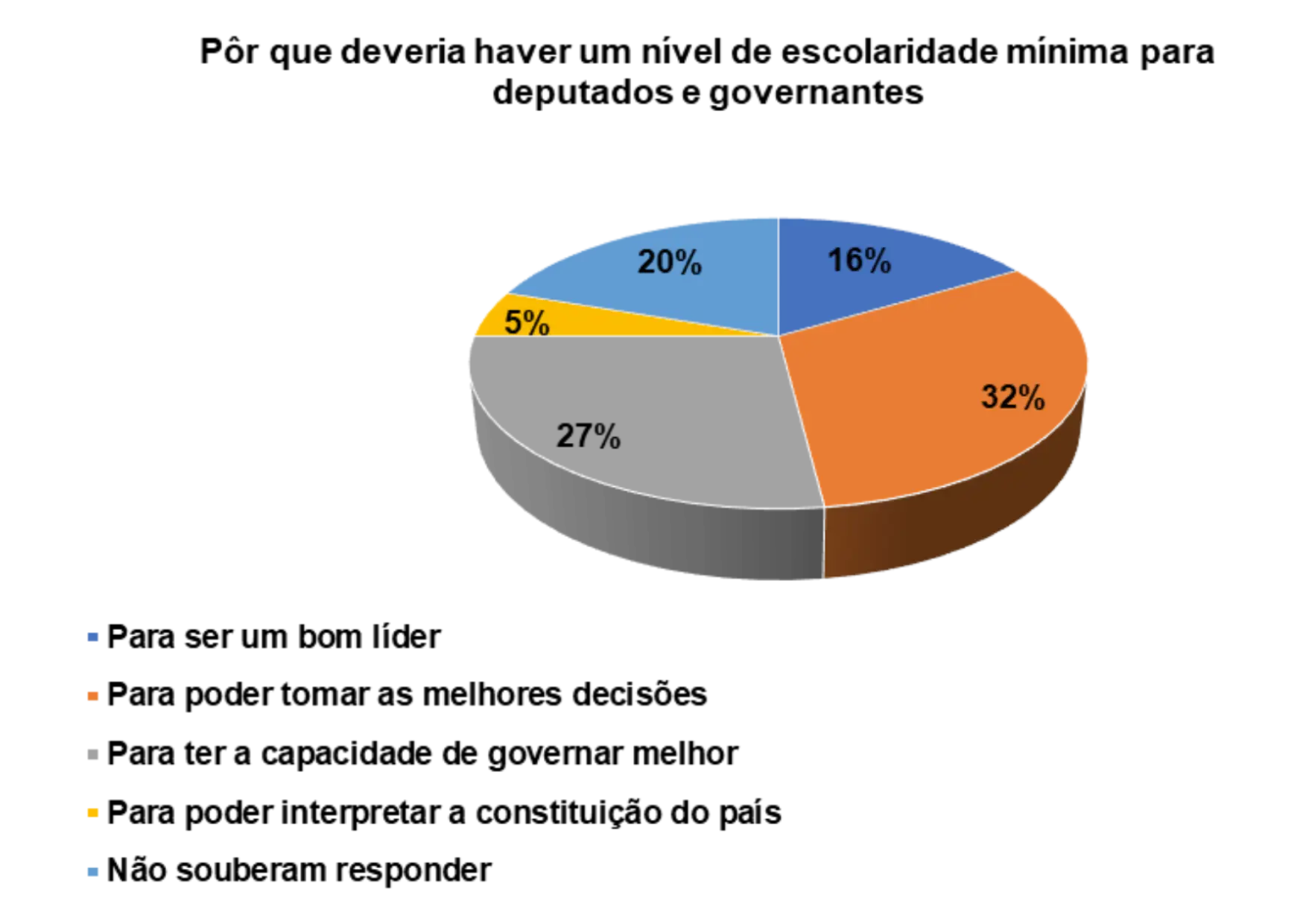 De acordo com o gráfico 31, os entrevistados/as afirmam que é importante haver um nível de escolaridade mínima para deputados e governantes pelos seguintes motivos: para ser um bom lider (16%), para poder tomar as melhores decisões (32%) e para ter a capacidade de governar melhor (27%).