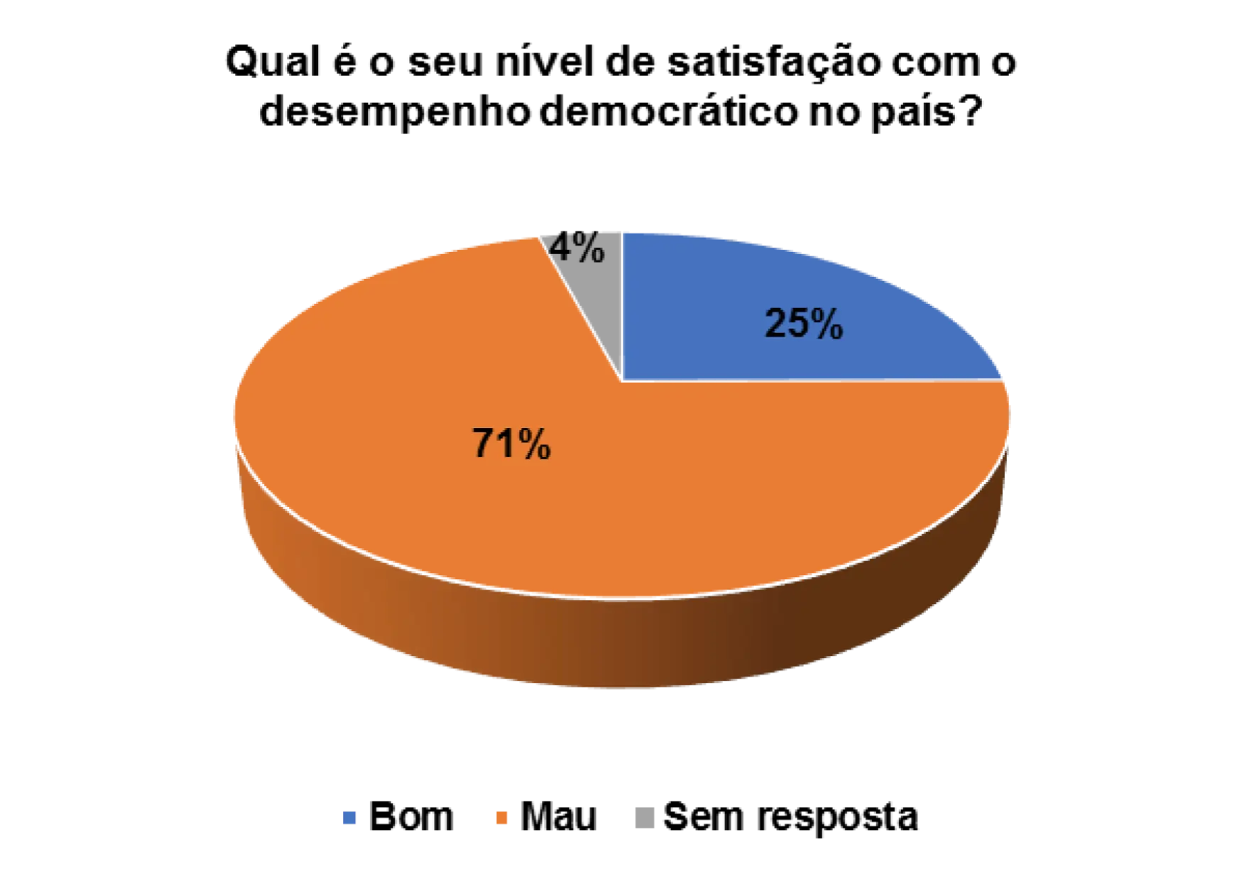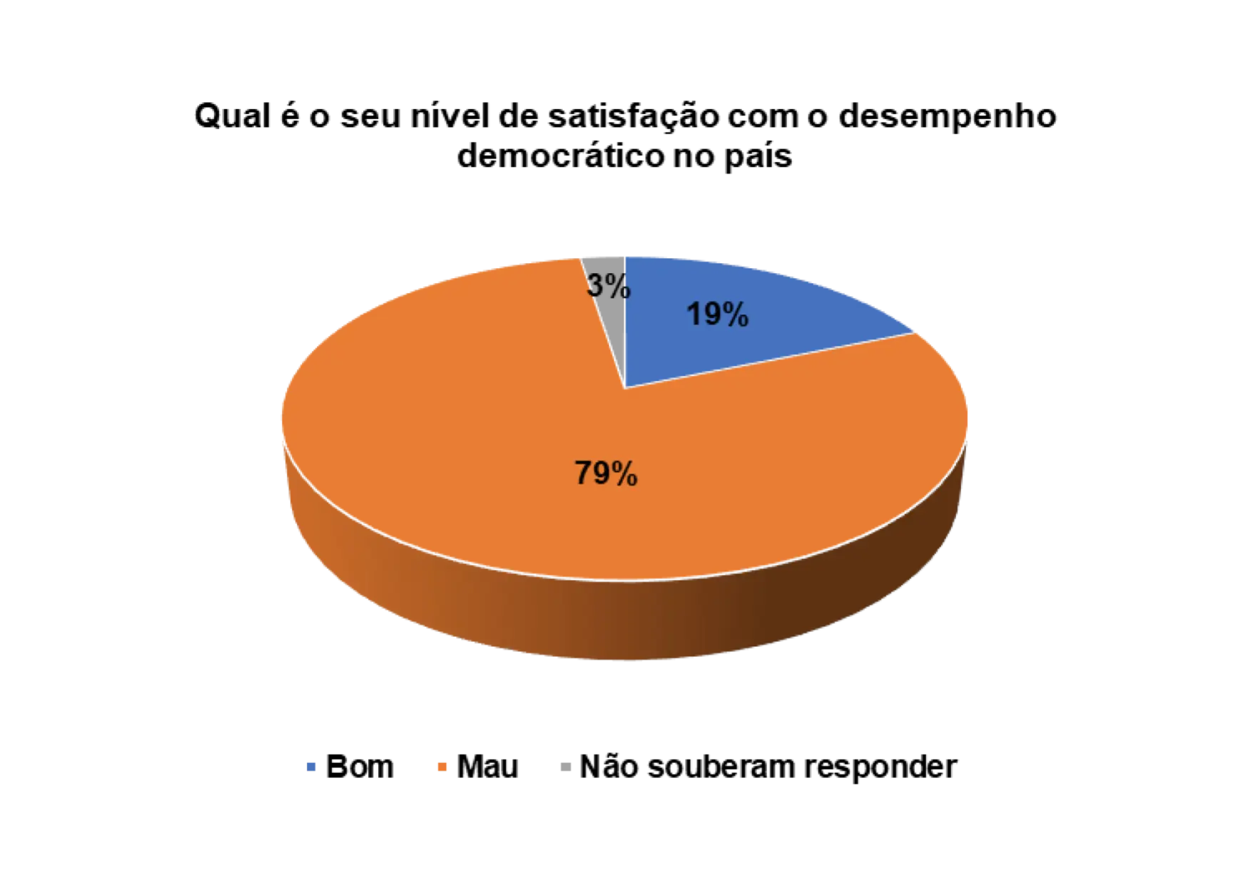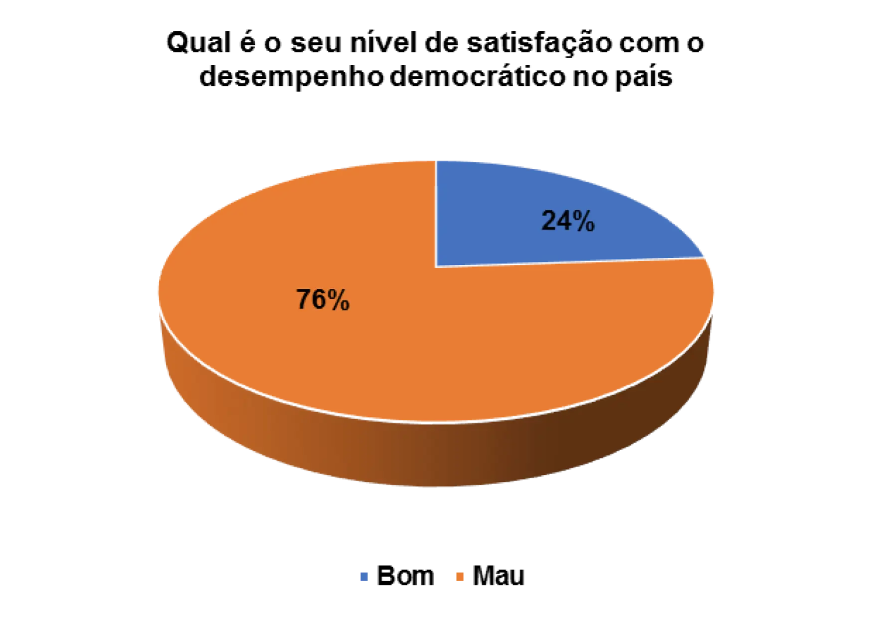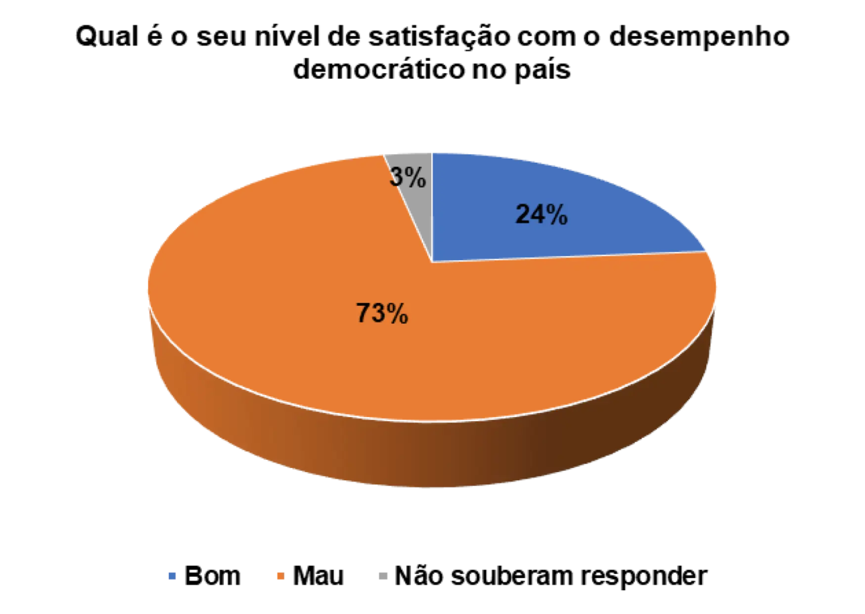 Analisando o gráfico 32, percebe que 73% dos eleitores entrevistados são de opinião que o desempenho democrático no pais é mau e 24% consideram-no de bom. A insatisfação com o desempenho da democracia é elevada e os participantes no grupo focal são de opinião de que isso acontece porque os eleitores desconhecem o verdadeiro sentido da democracia.