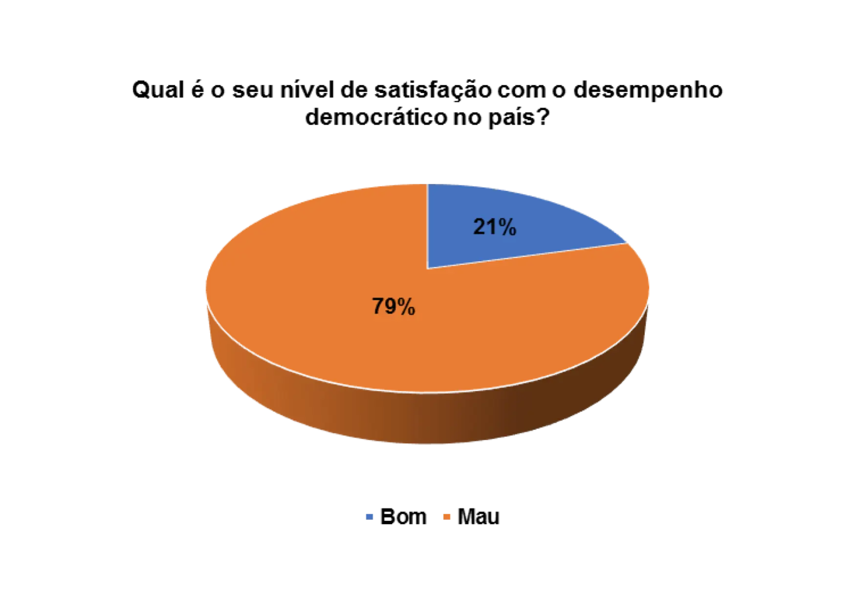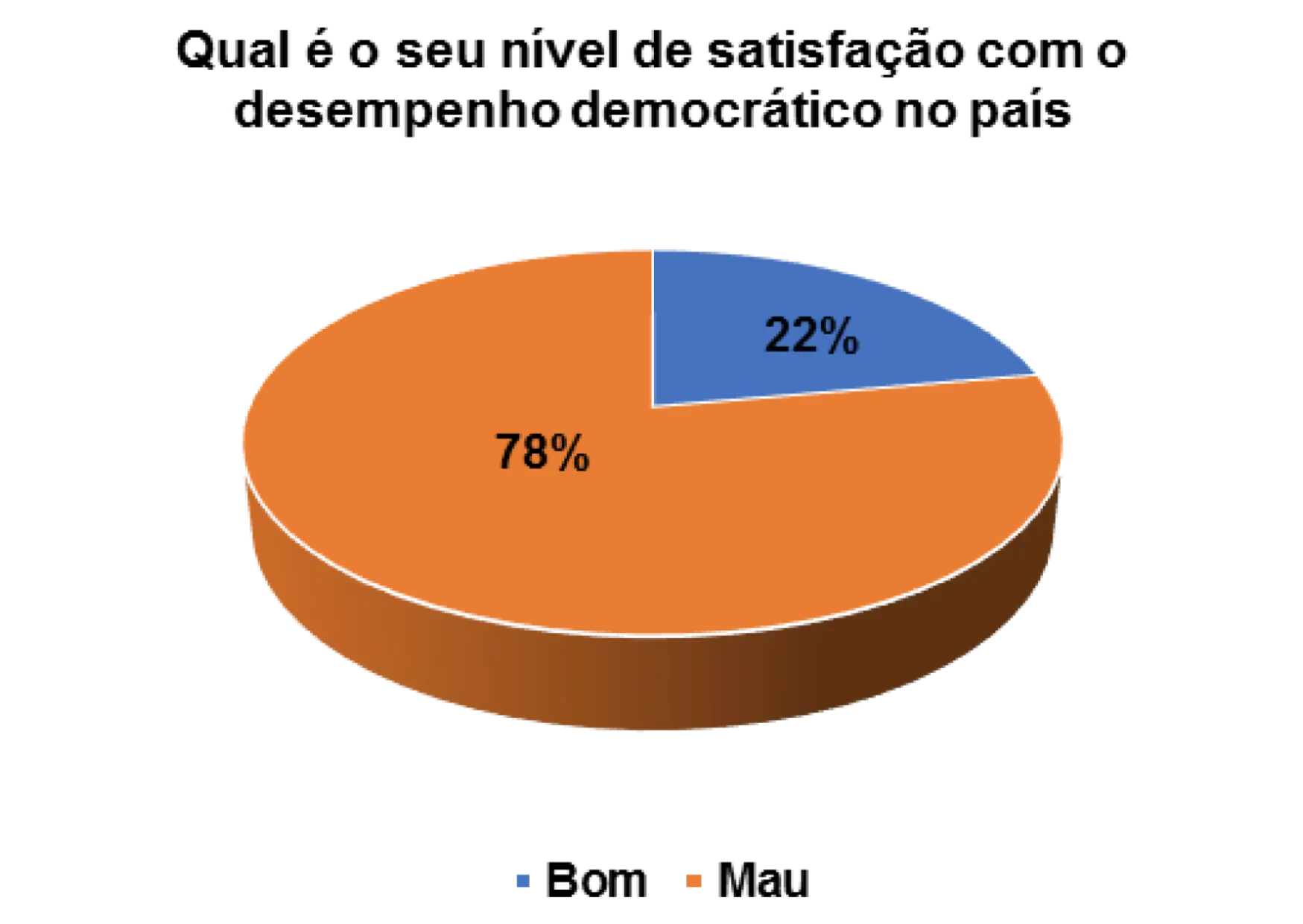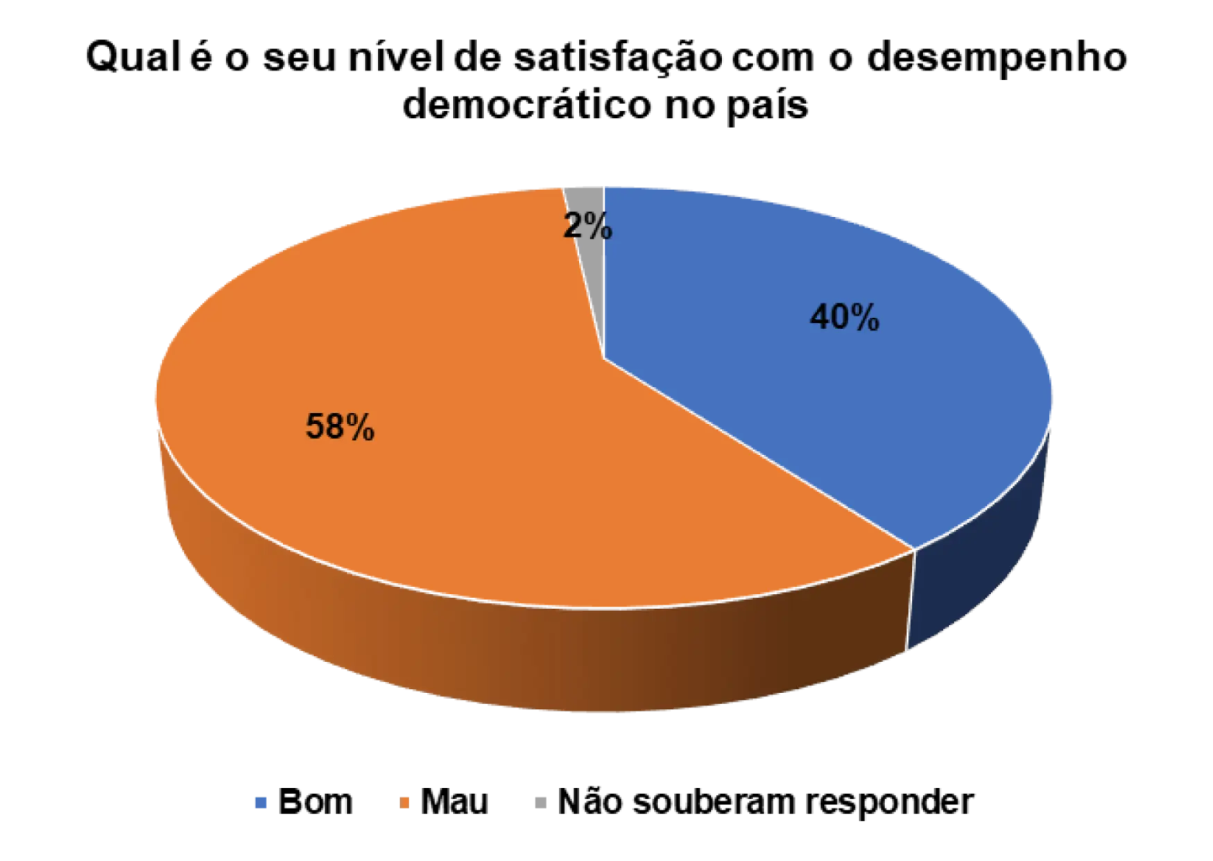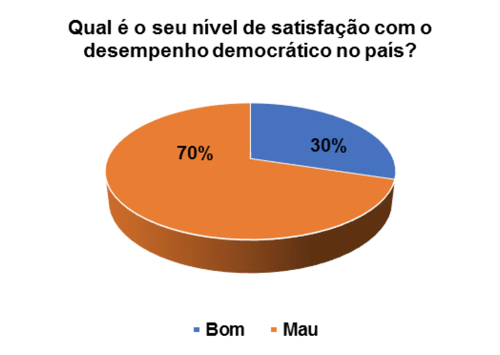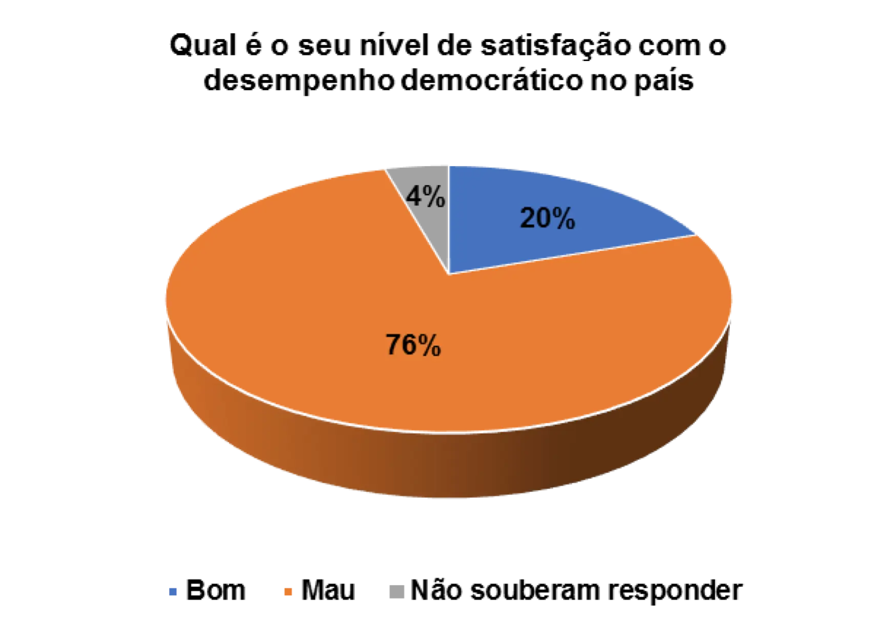 Analisando o gráfico 32, percebe que 73% dos eleitores entrevistados são de opinião que o desempenho democrático no pais é mau e 24% consideram-no de bom. A insatisfação com o desempenho da democracia é elevada e os participantes no grupo focal são de opinião de que isso acontece porque os eleitores desconhecem o verdadeiro sentido da democracia.