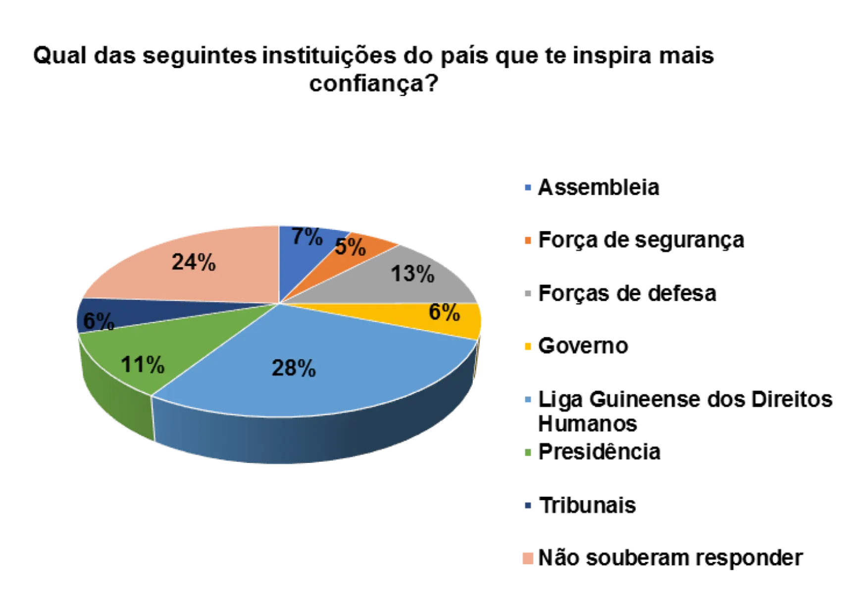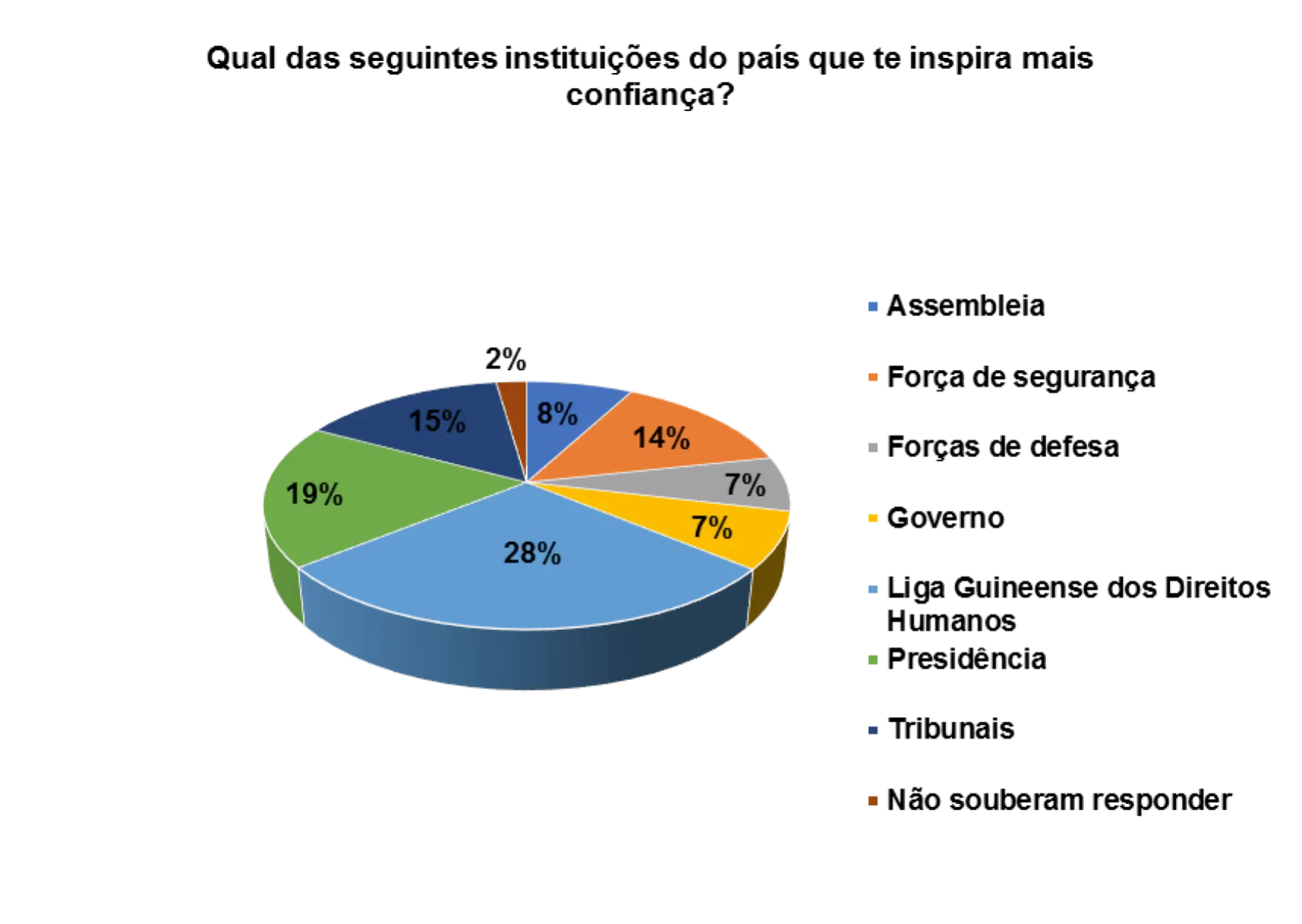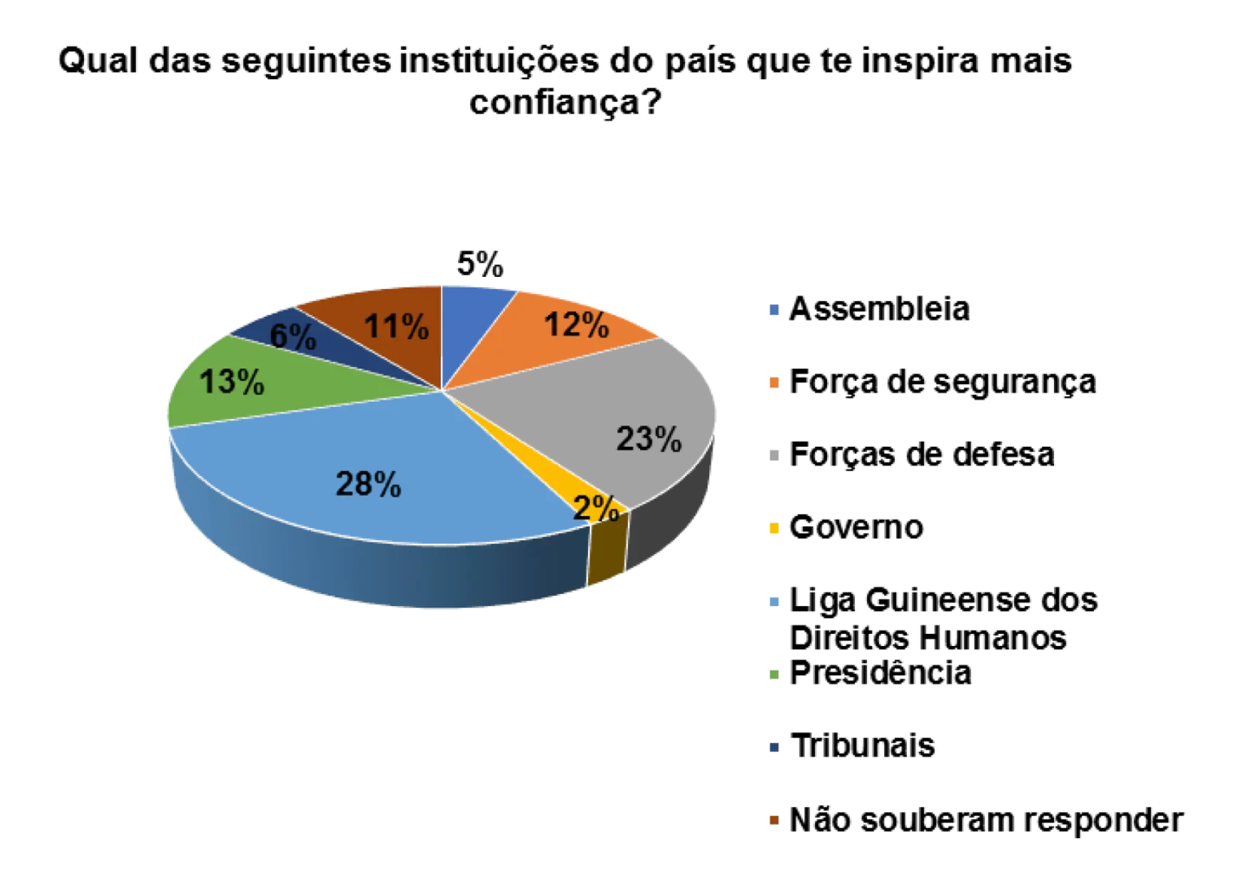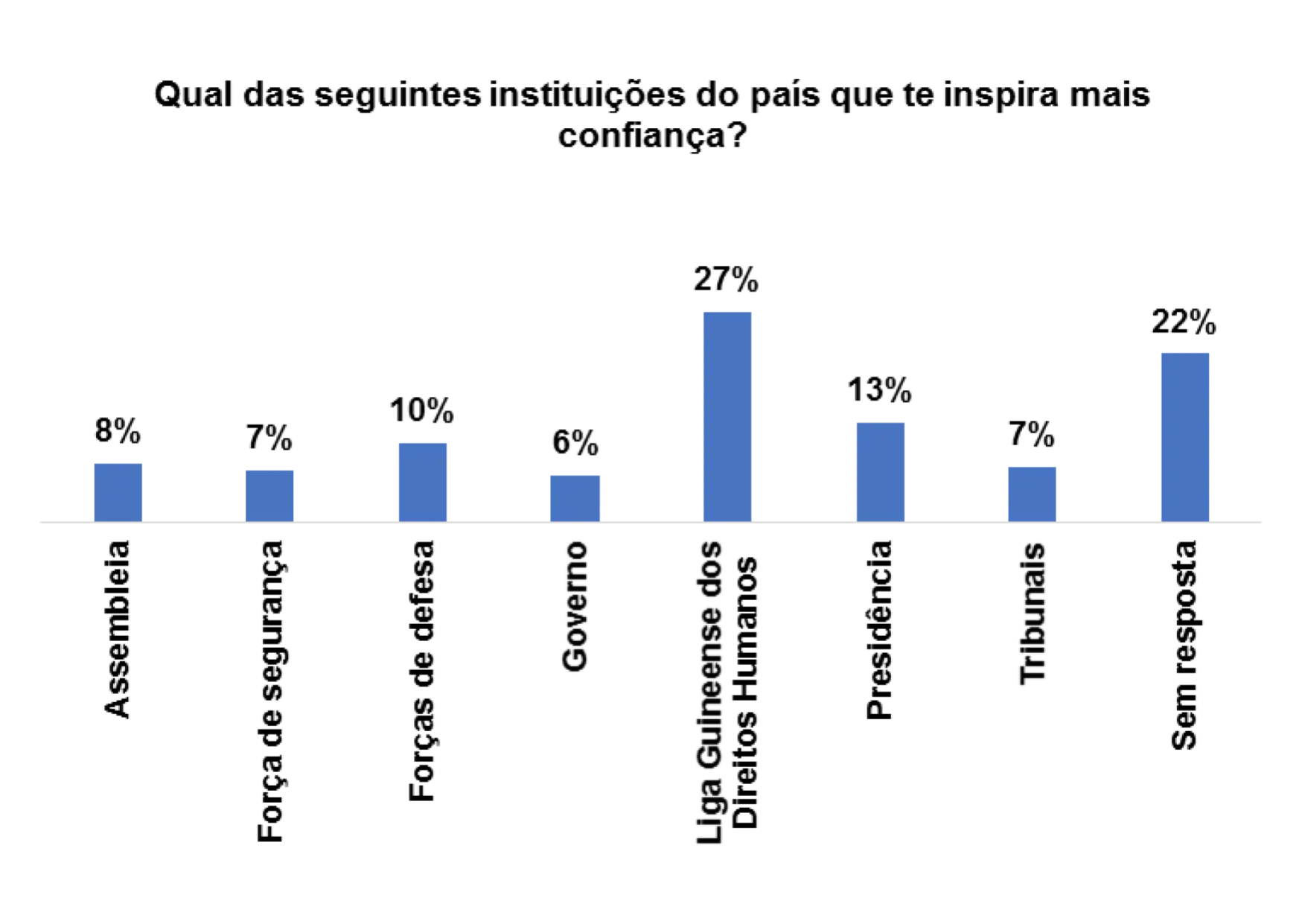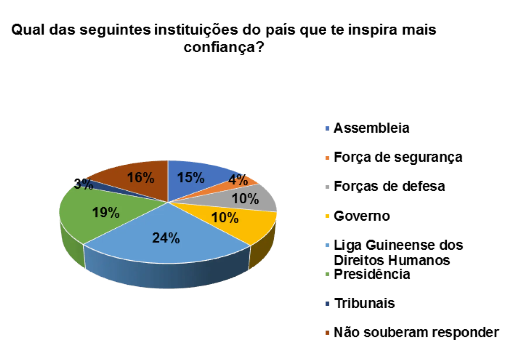 Em relação a confiança que as instituições do pais transmitem, a Liga Guineense dos Direitos Humanos aparece em primeiro lugar, representado por 24%, segundo os/as entrevistados/as. Em seguida aparece a Presidência (13%) e depois a força de defesa (5%).