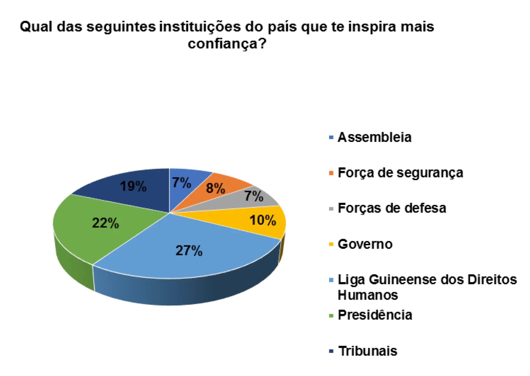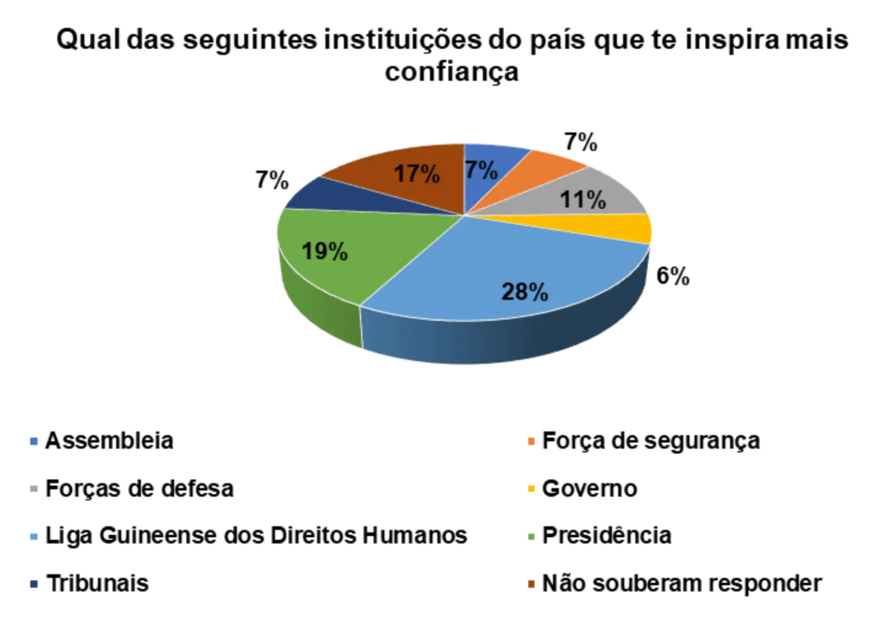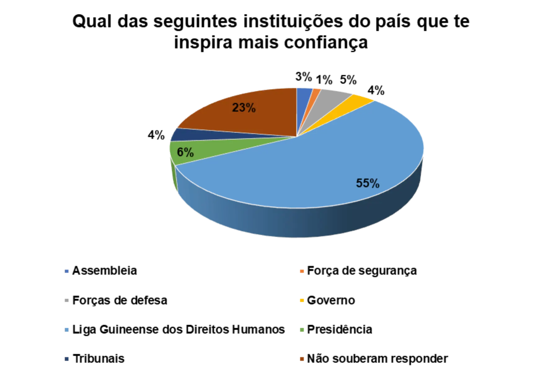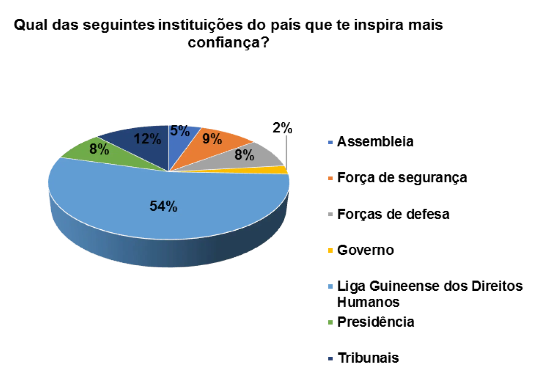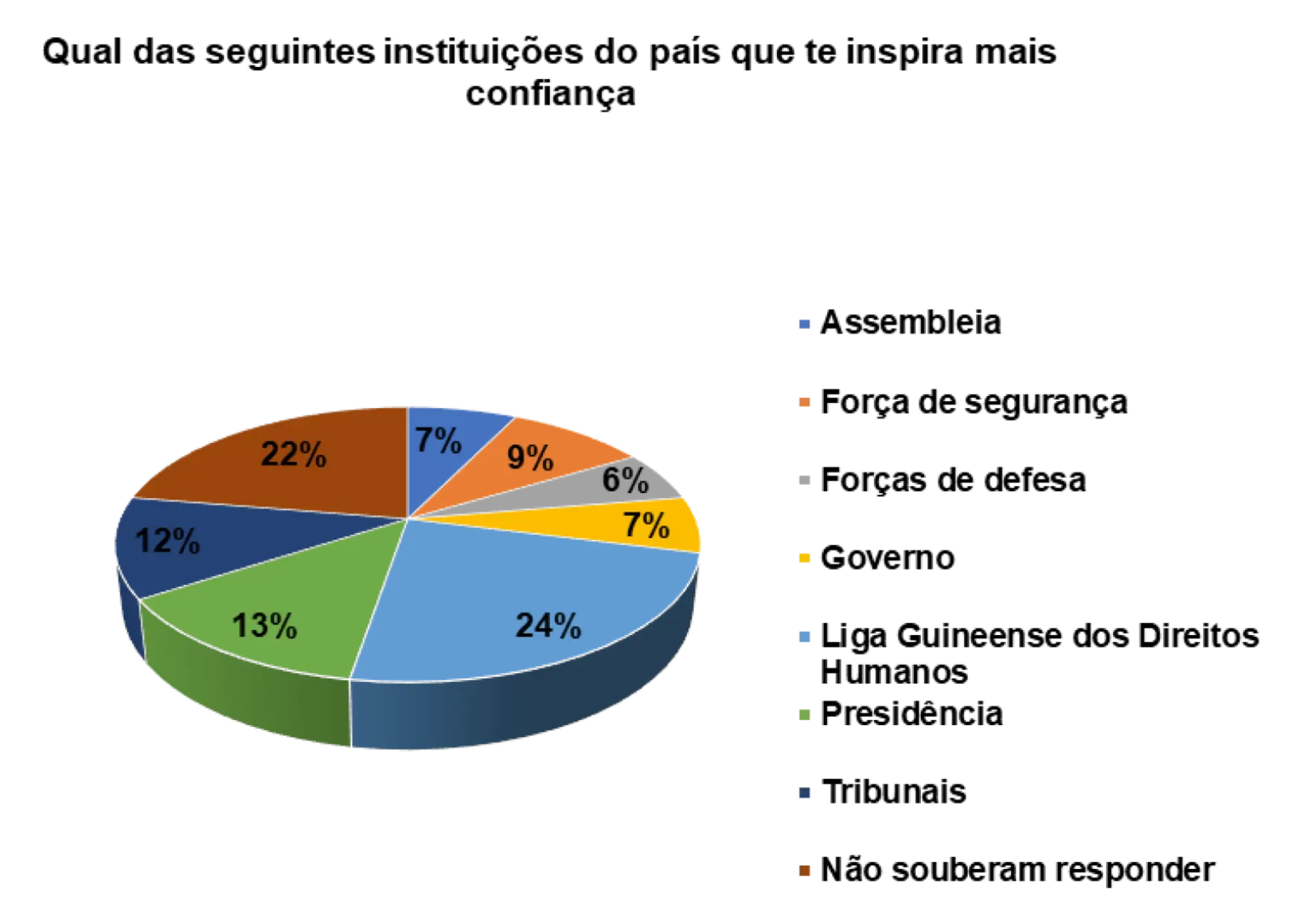 Em relação a confiança que as instituições do pais transmitem, a Liga Guineense dos Direitos Humanos aparece em primeiro lugar, representado por 24%, segundo os/as entrevistados/as. Em seguida aparece a Presidência (13%) e depois a força de defesa (5%).