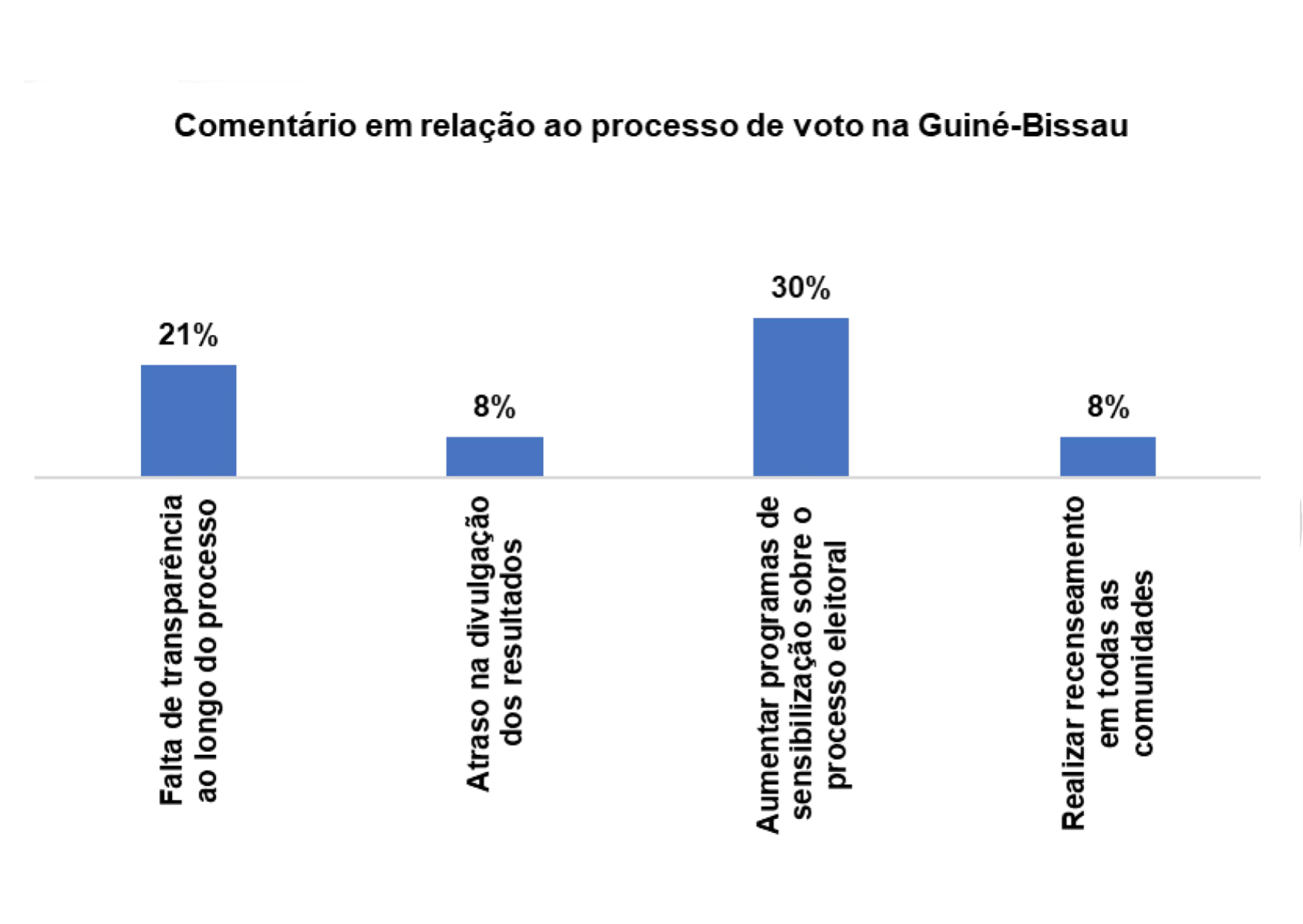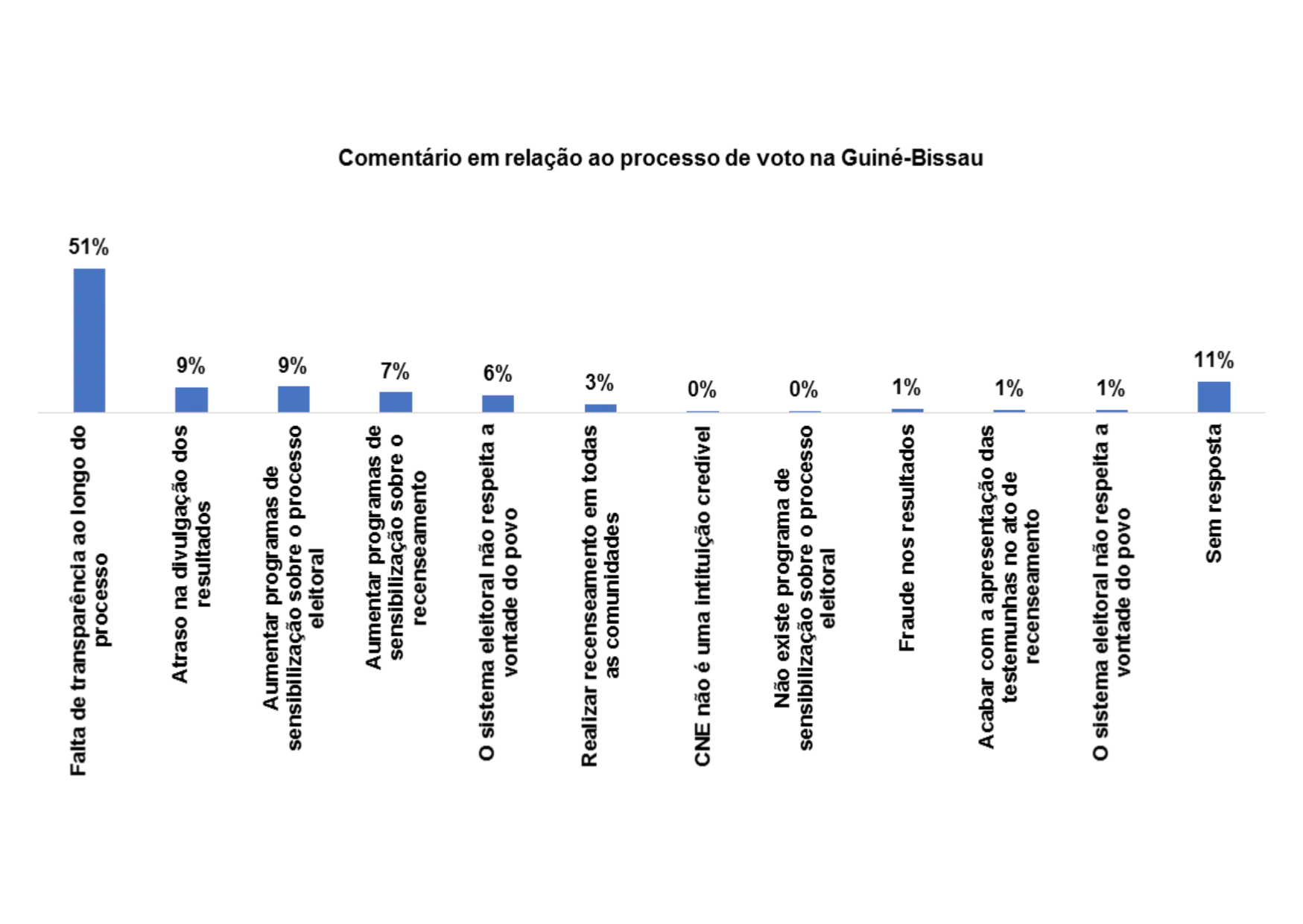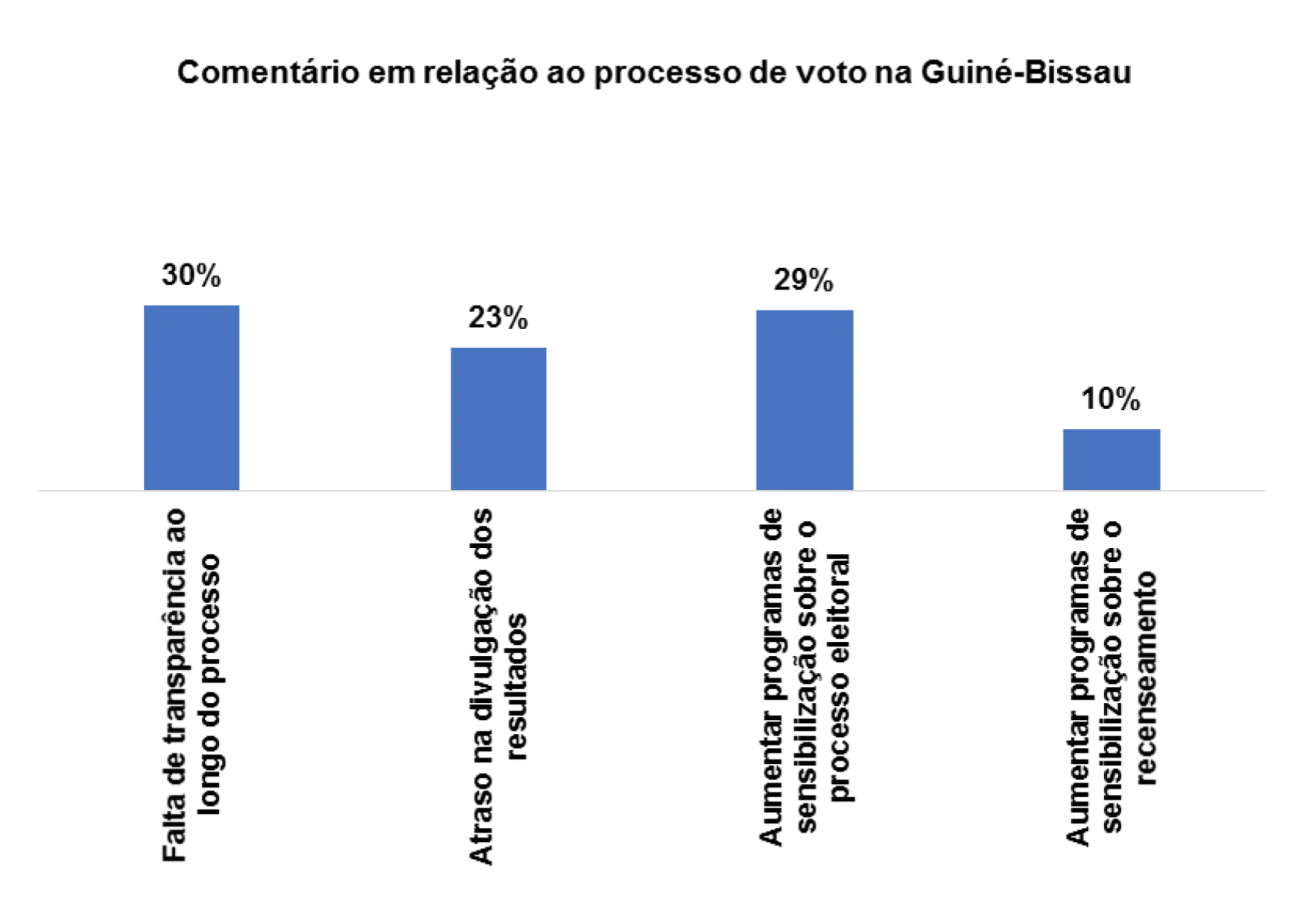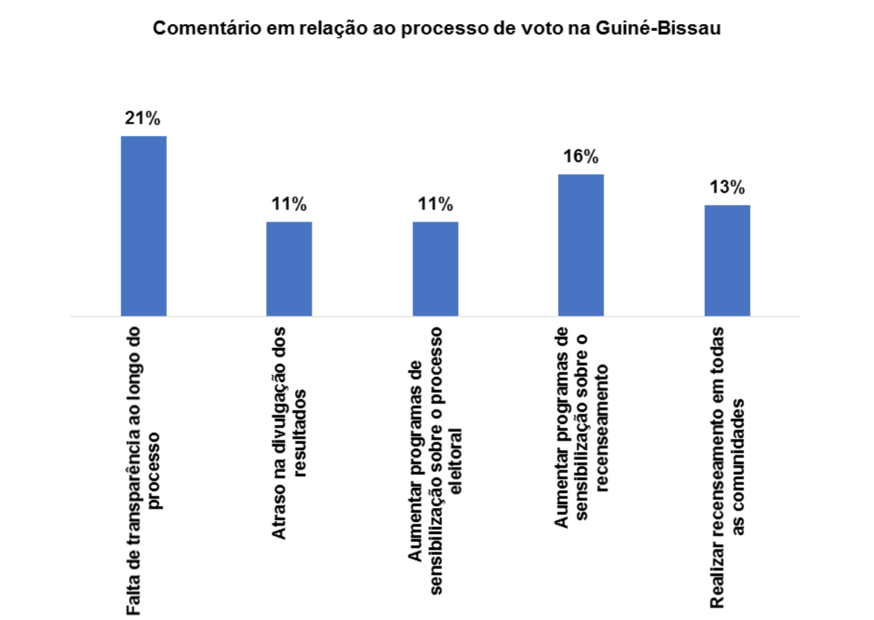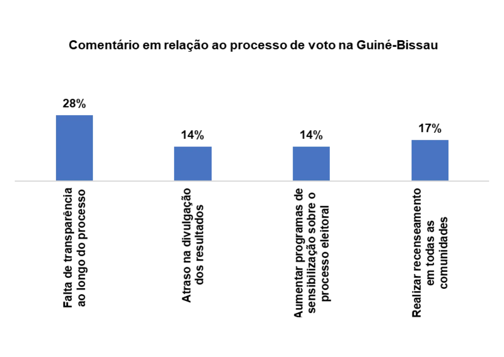 Com relação ao processo de voto no pais, 28% dos/as entrevistados/as afirmam que há falta transparência ao longo do processo, 14% afirmam que se deveria aumentar os programas de sensibilização sobre o processo eleitoral, 14% afirmam haver atraso na divulgação dos resultados e 17% afirmam que se deveria realizar recenseamento em todas as comunidades.