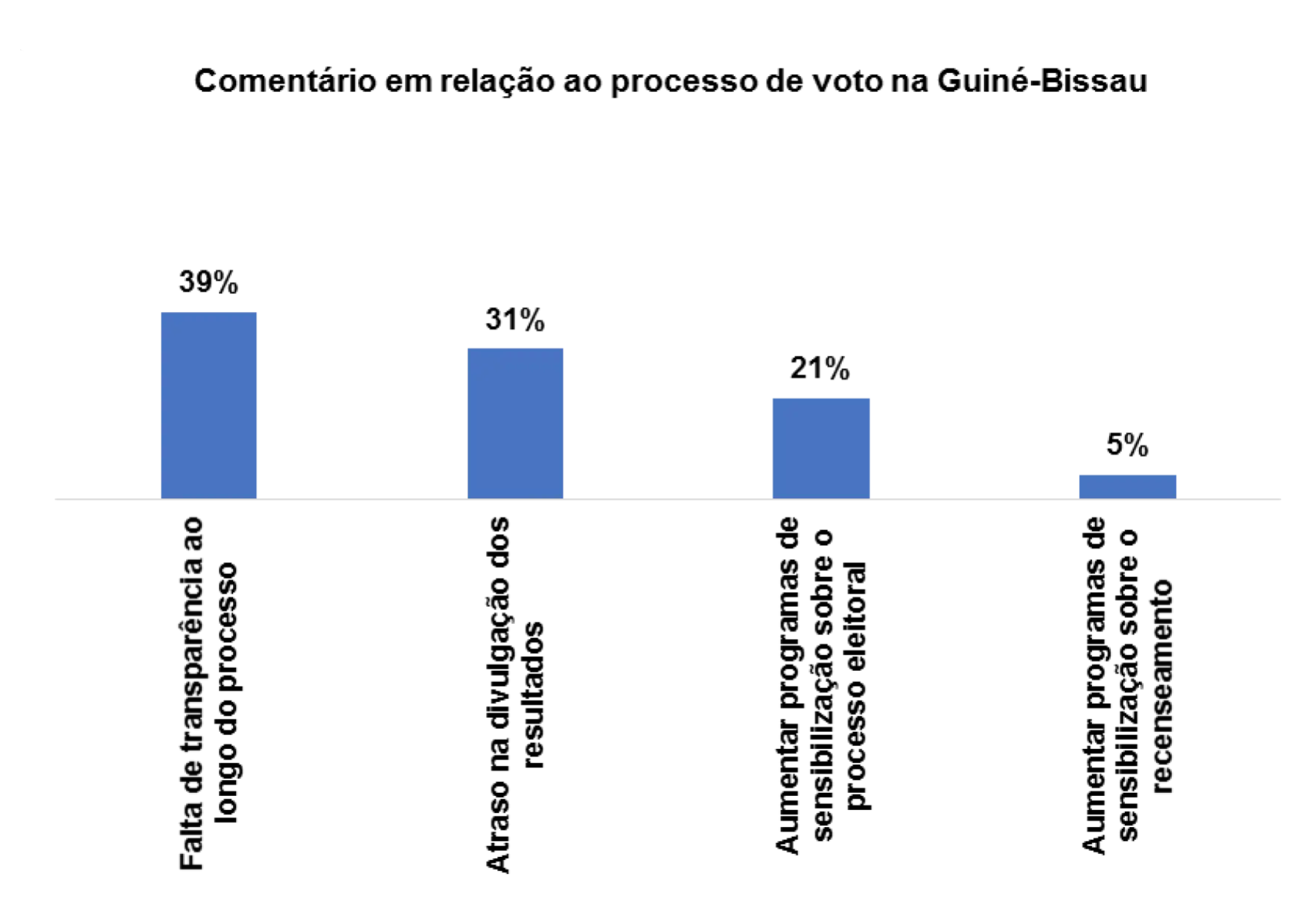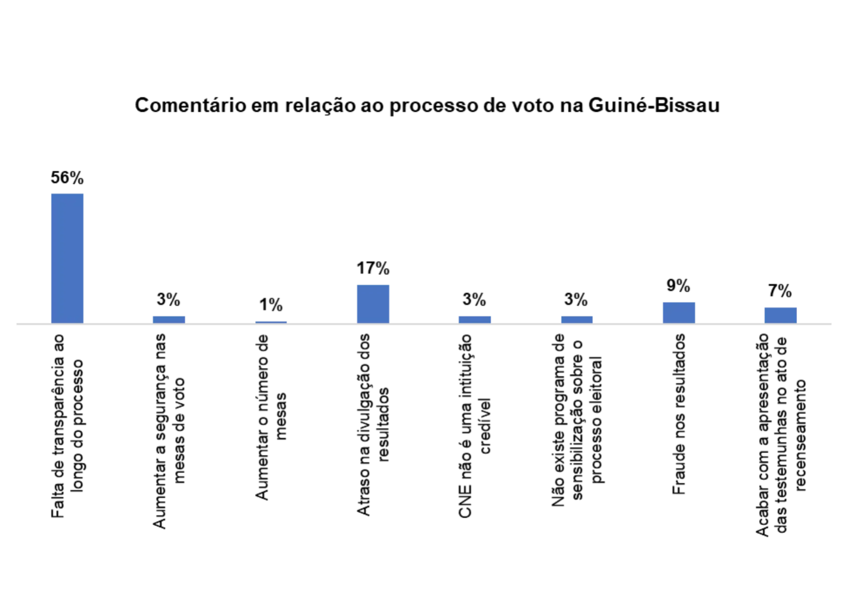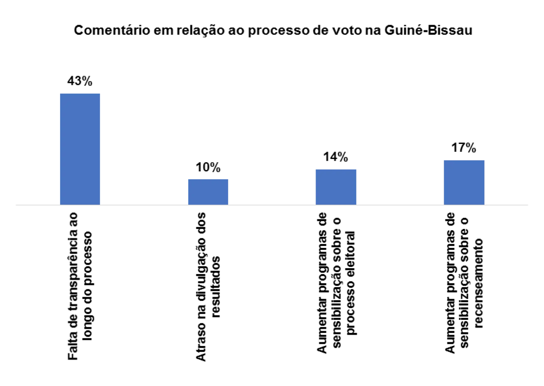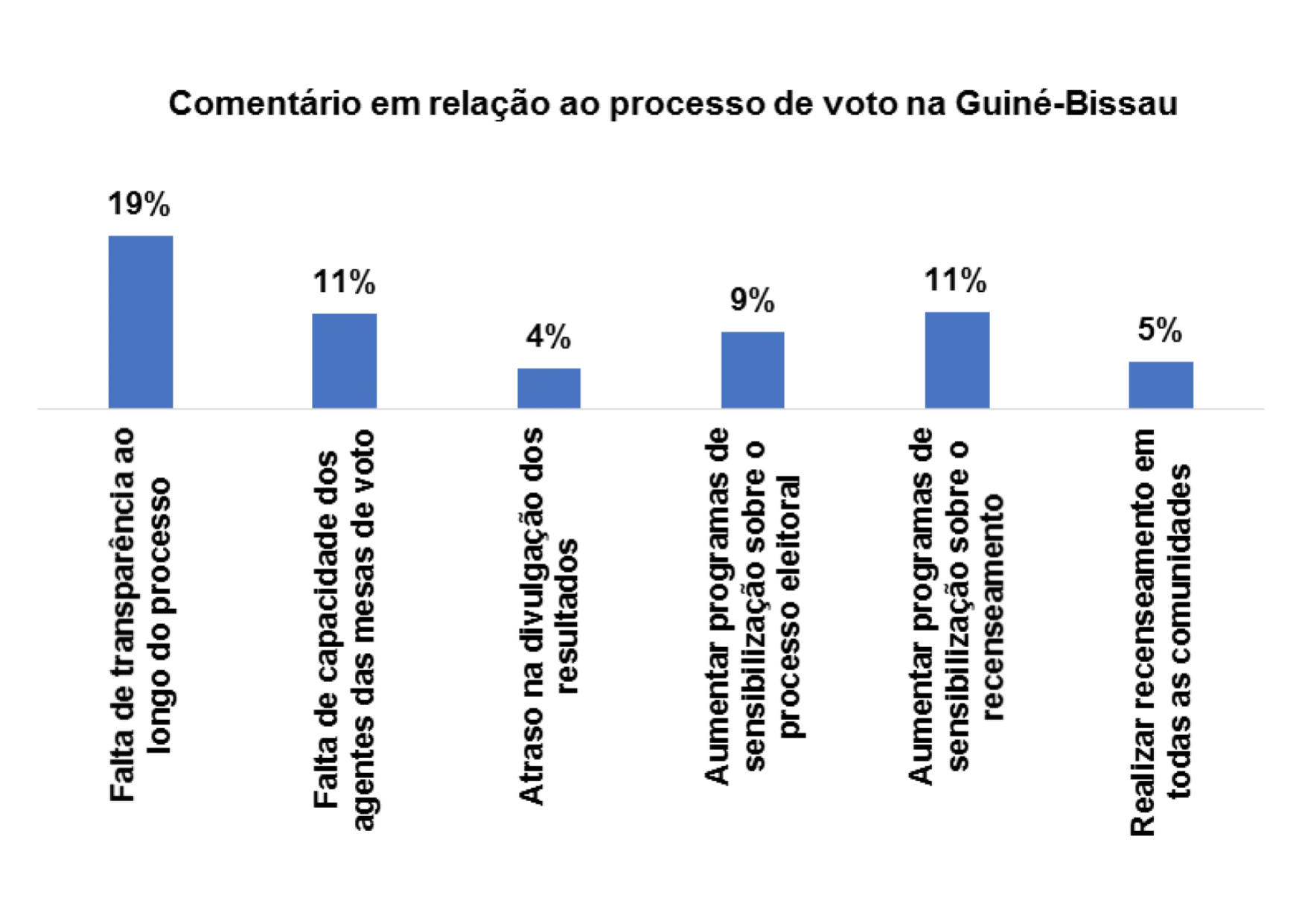 Com relação ao processo de voto no pais, 28% dos/as entrevistados/as afirmam que há falta transparência ao longo do processo, 14% afirmam que se deveria aumentar os programas de sensibilização sobre o processo eleitoral, 14% afirmam haver atraso na divulgação dos resultados e 17% afirmam que se deveria realizar recenseamento em todas as comunidades.