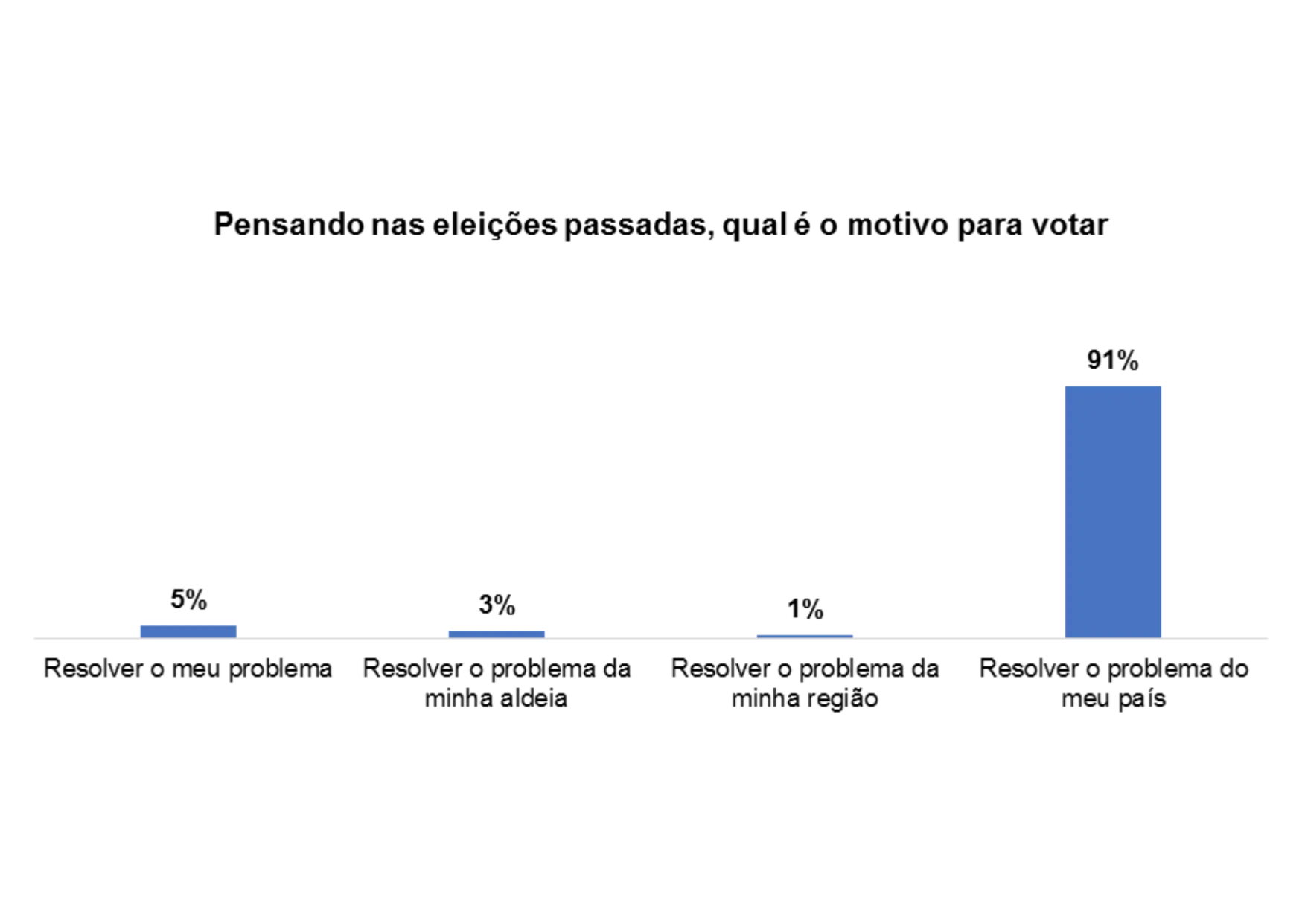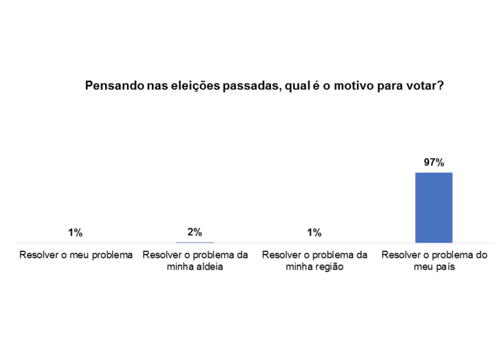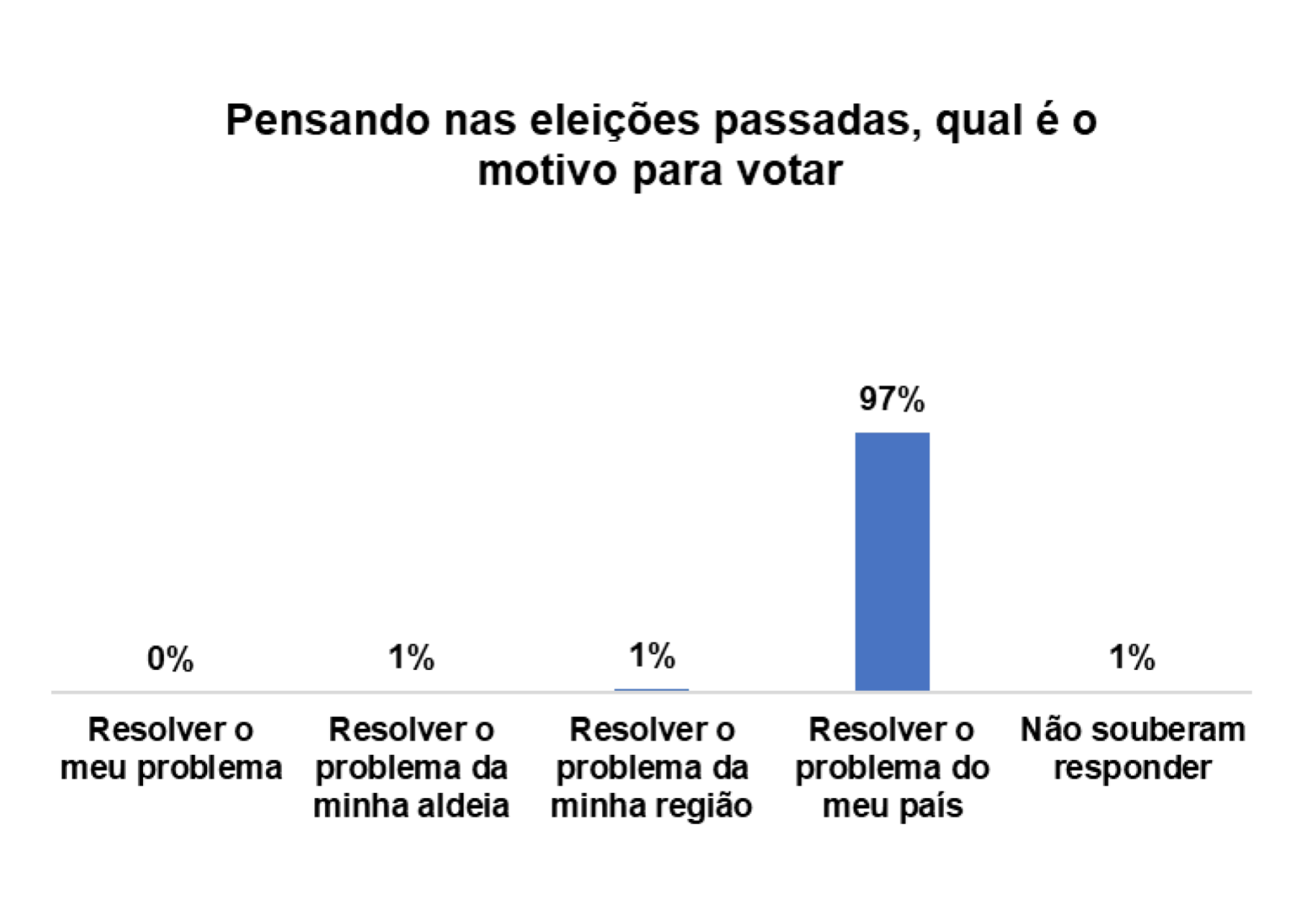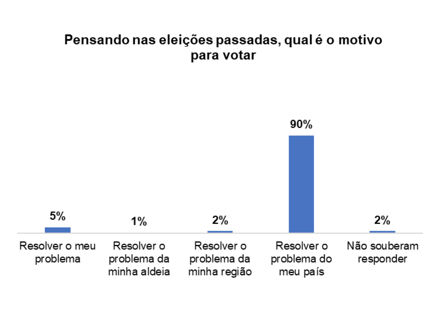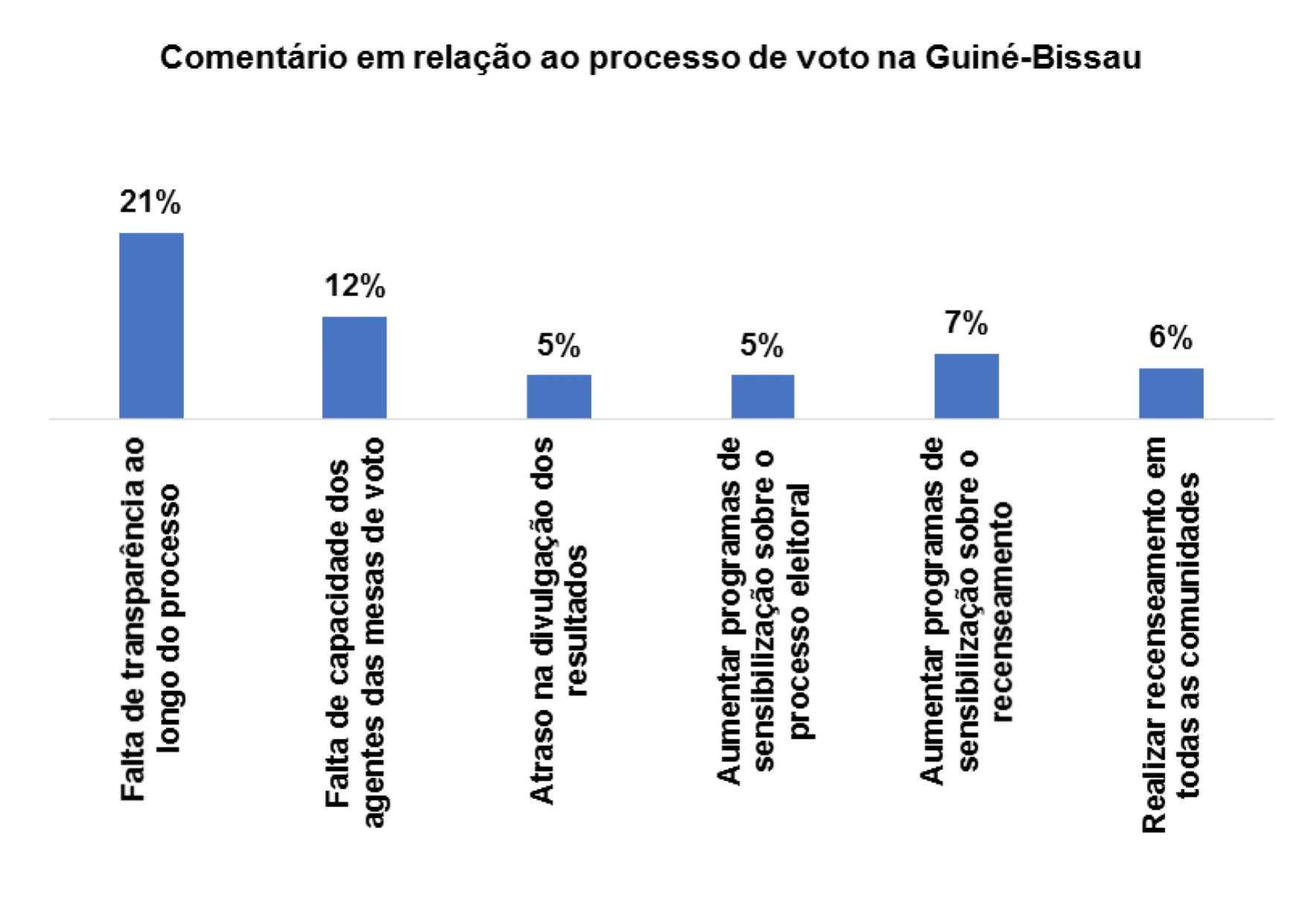 Com relação ao processo de voto no pais, 28% dos/as entrevistados/as afirmam que há falta transparência ao longo do processo, 14% afirmam que se deveria aumentar os programas de sensibilização sobre o processo eleitoral, 14% afirmam haver atraso na divulgação dos resultados e 17% afirmam que se deveria realizar recenseamento em todas as comunidades.