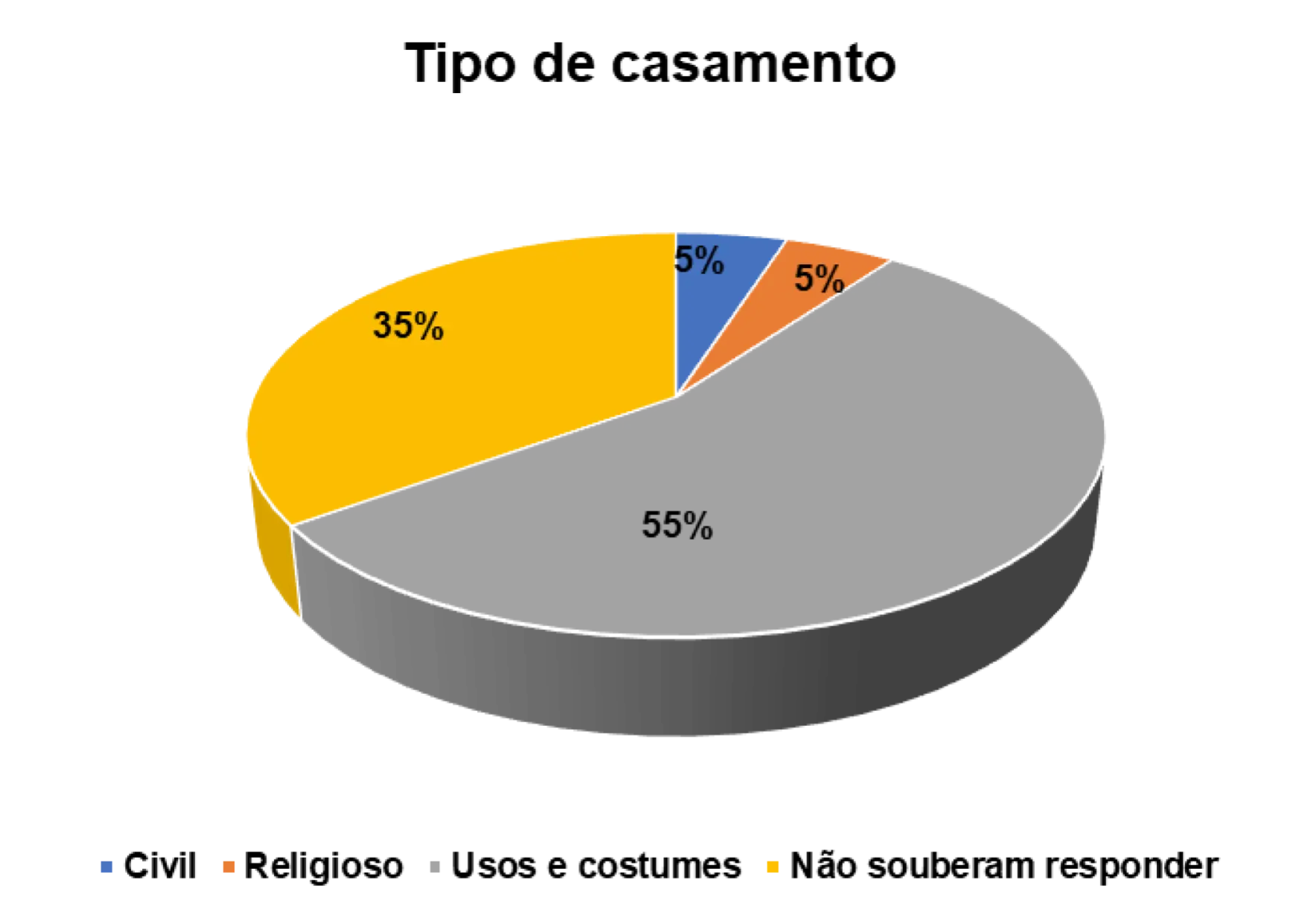 Entre os casados, o tipo de casamento predominante é o casamento de usos e costumes, representado por 55%.