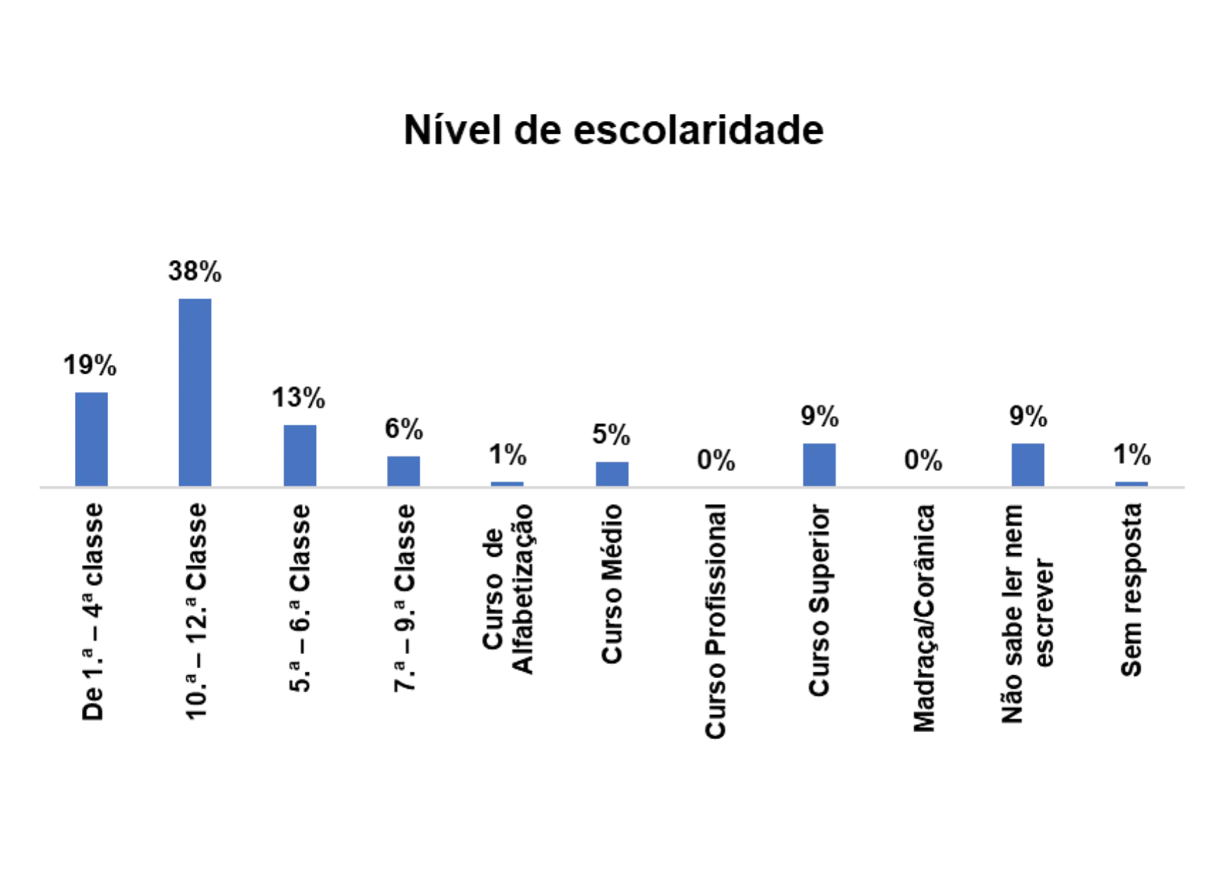 Já no gráfico 8, o propósito é apresentar o nível de escolaridade predominante entre os eleitores entrevistados nessa região. Conforme se pode observar, o nível de 10ª – 12ª classe, é dominante e representa 38%, em seguida o de 1.ª – 4ª classe afigura com 19%. Basicamente, pode-se concluir que quase a metade dos entrevistados, além de suas vivências e experiências de vida, chegaram a frequentar a escola formal e, supostamente, possuem algum conhecimento sobre o processo eleitoral.