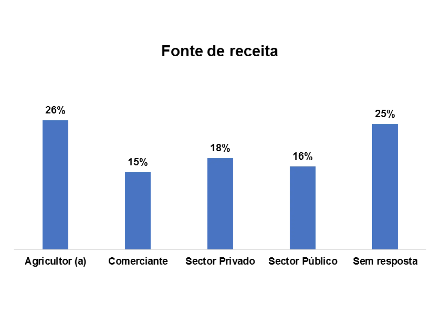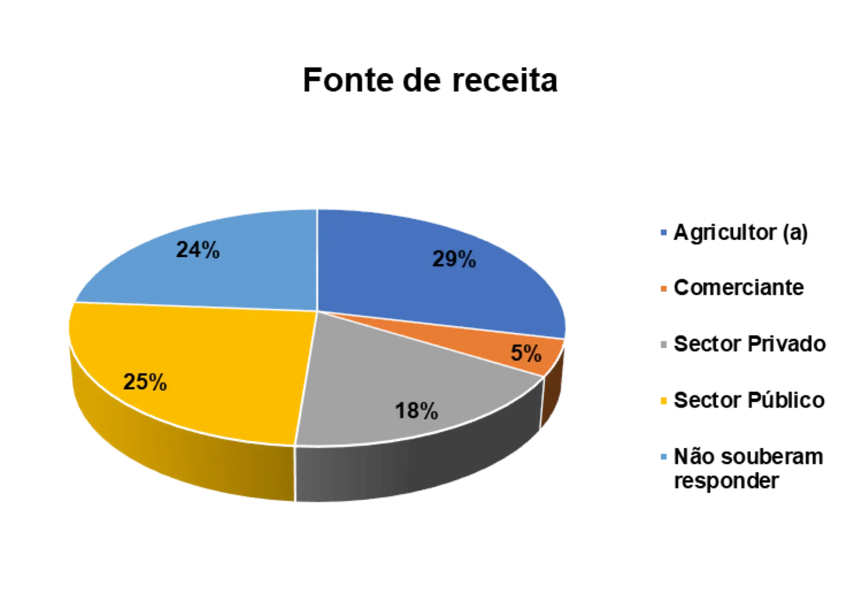 Outro aspeto relevante que o estudo buscou ilucidar são dominios de atividades laborais dos/as entrevistados/as. Num universo de 80 entrevistados/as, 29% são agricultores/as, 18% trabalham no setor privado, 25% no setor público e 5% são comerciantes.