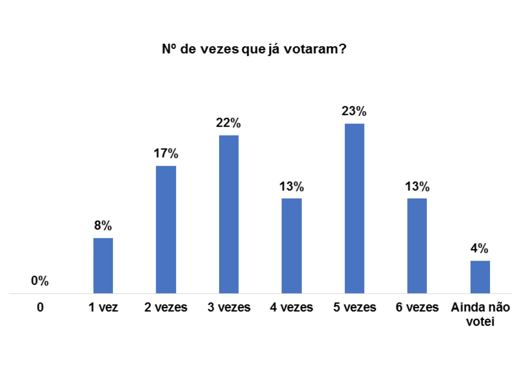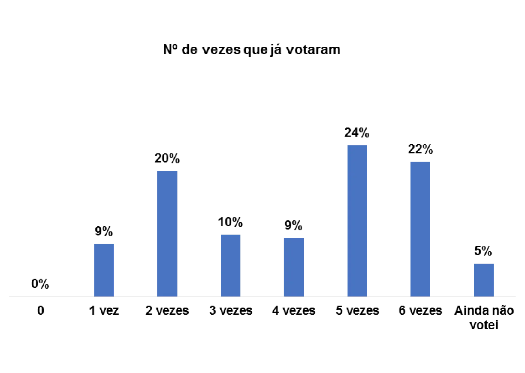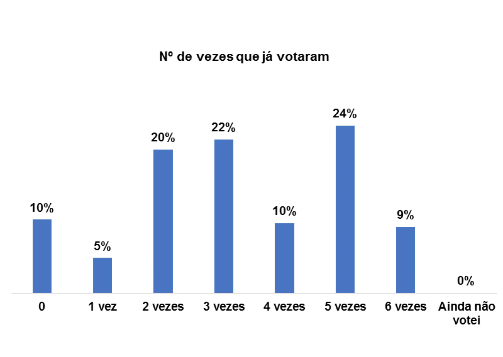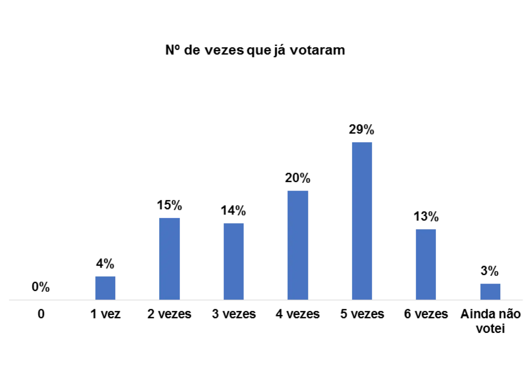 Quando questionadas/os quantas vezes já votaram, percebe-se que num universo de 152 entrevistadas/os, 21% assumem que já votaram pelo menos 4 vezes e 20% pelo menos 5 vezes.
