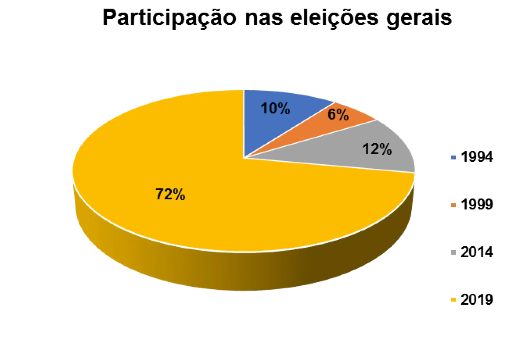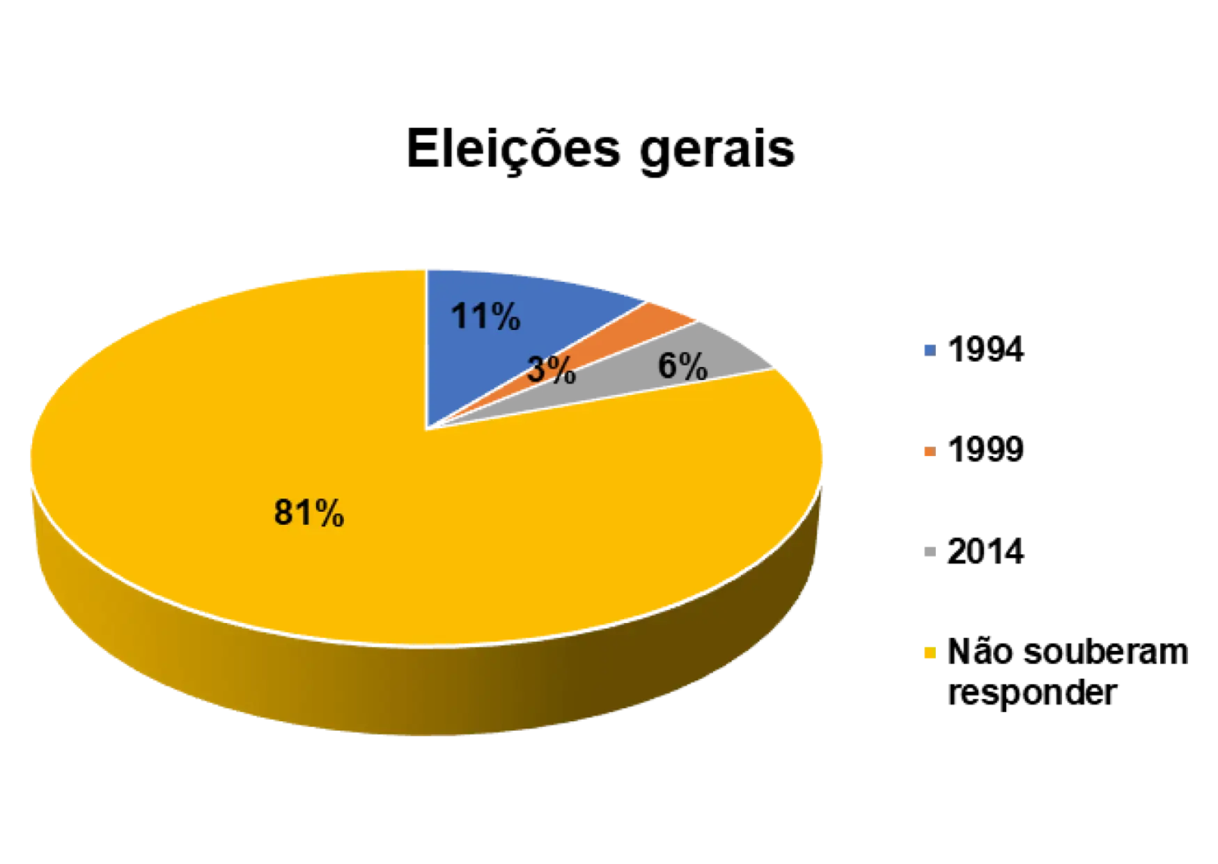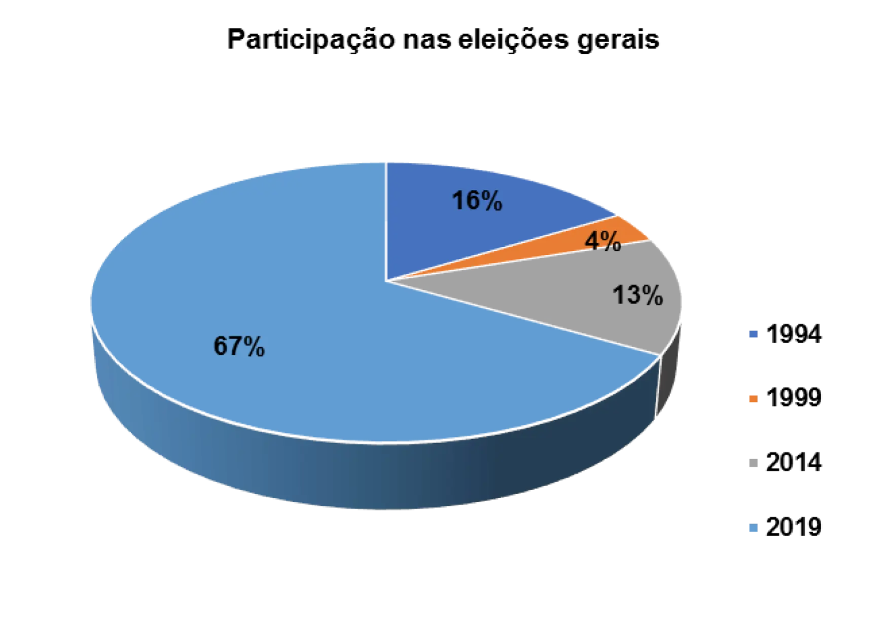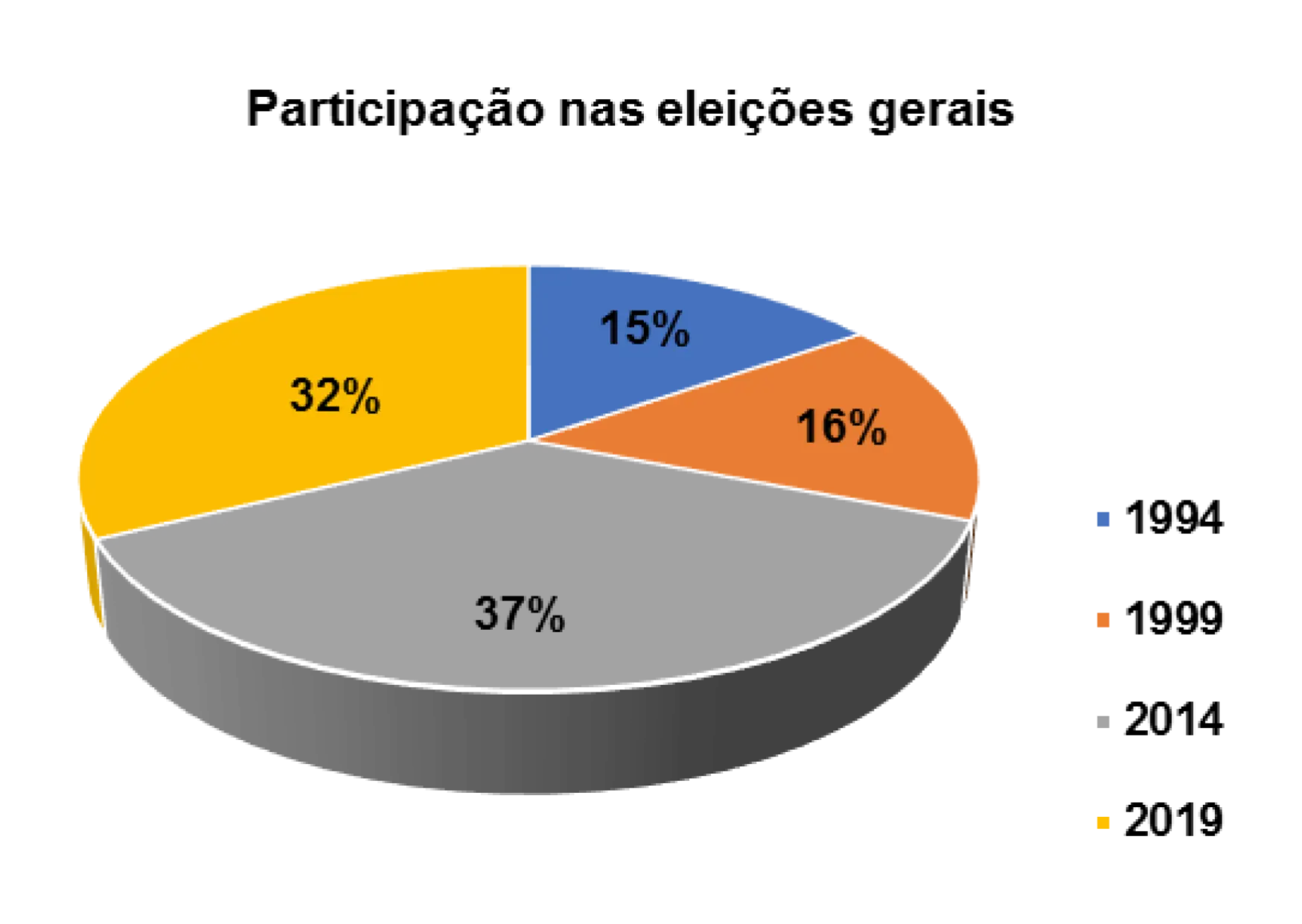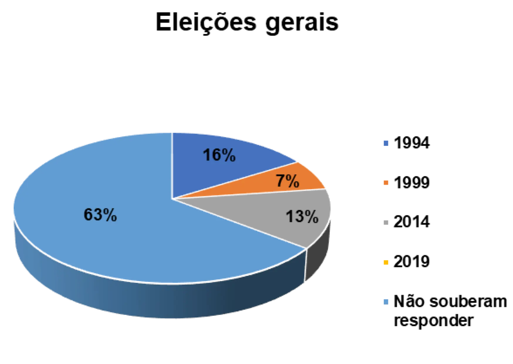 Em relação a participação nas eleições realizadas no pais, percebe-se que 16% afirmam ter votado nas eleições gerais em 1994, 7% nas eleições de 1999, 13 % nas eleições gerais de 2014 e 2% nas eleições gerais de 2019. 63% não souberam responder essa questão.