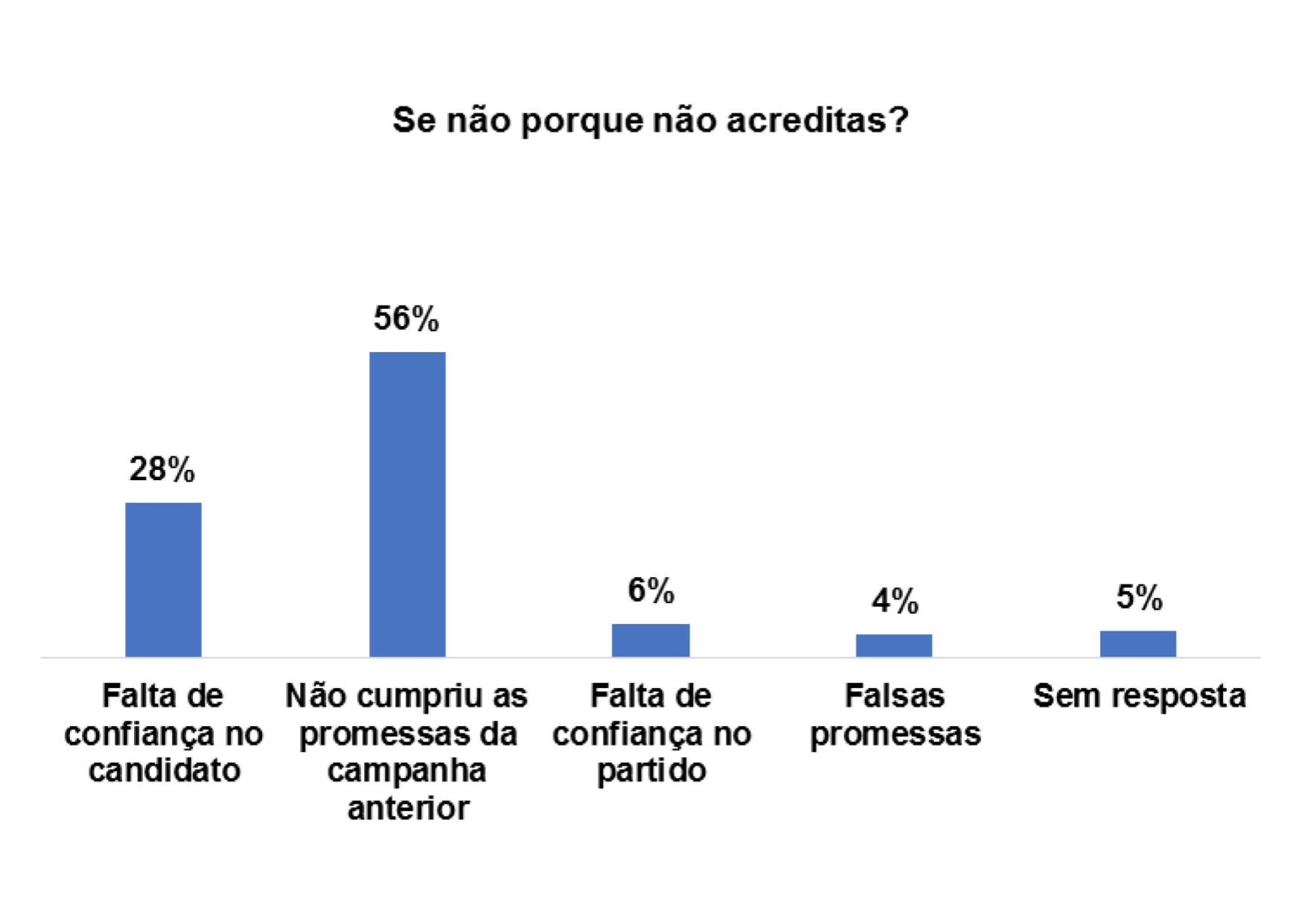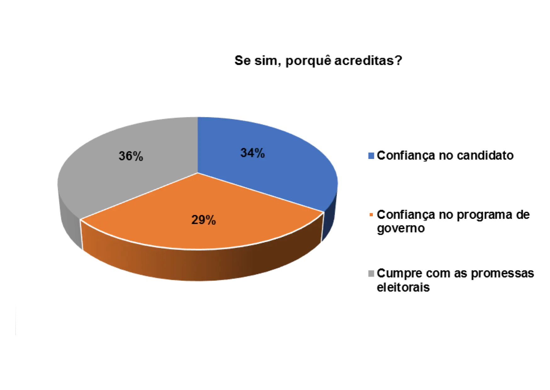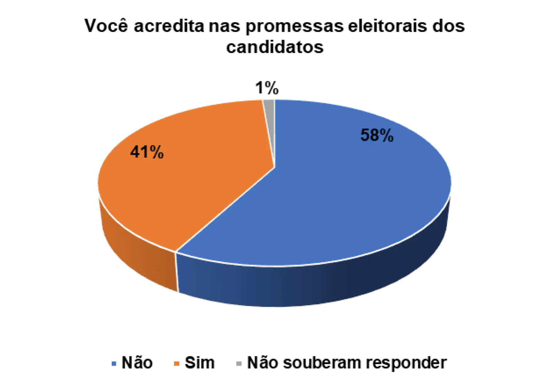 Além de tentar observar os principais motivos que influenciaram os eleitores a votarem ou não em determinados partidos ou candidatos nas eleições, procurou-se também compreender o nível de confiança que têm nas promessas eleitorais que são feitas pelos partidos e candidatos. Num universo de 152 eleitores entrevistados, 58% afirmam que não acreditaram nas promessas eleitorais dos candidatos e 41% afirmam acreditarem nas promessas.