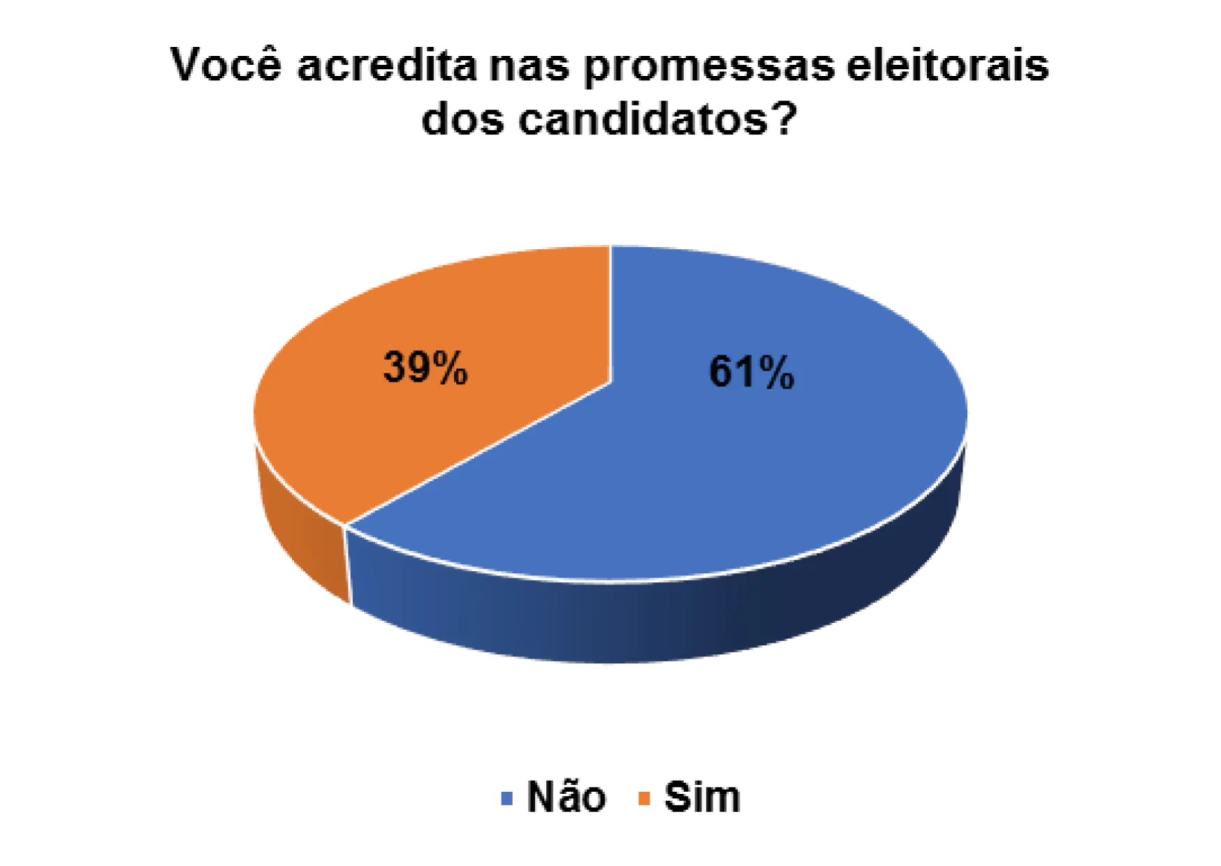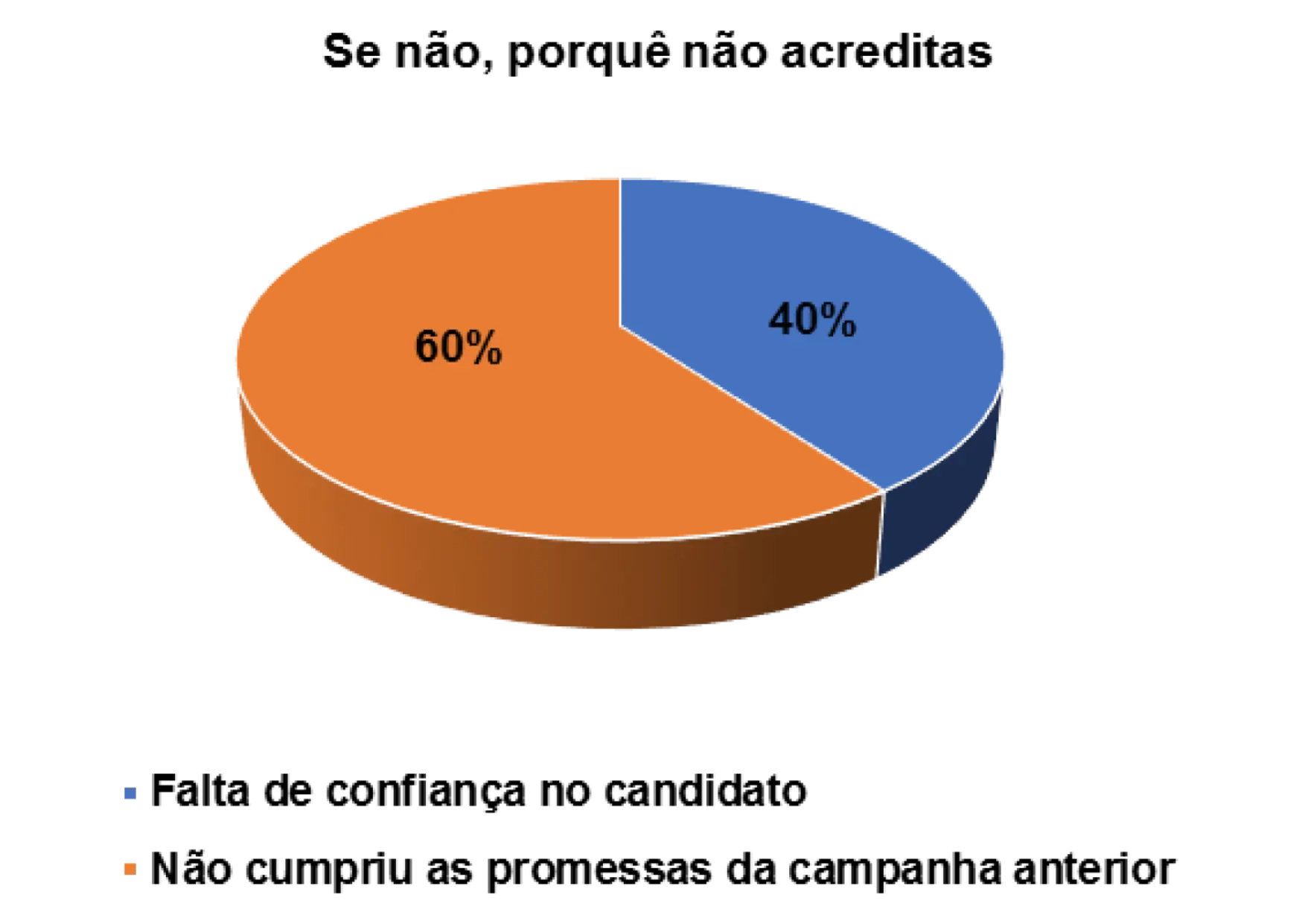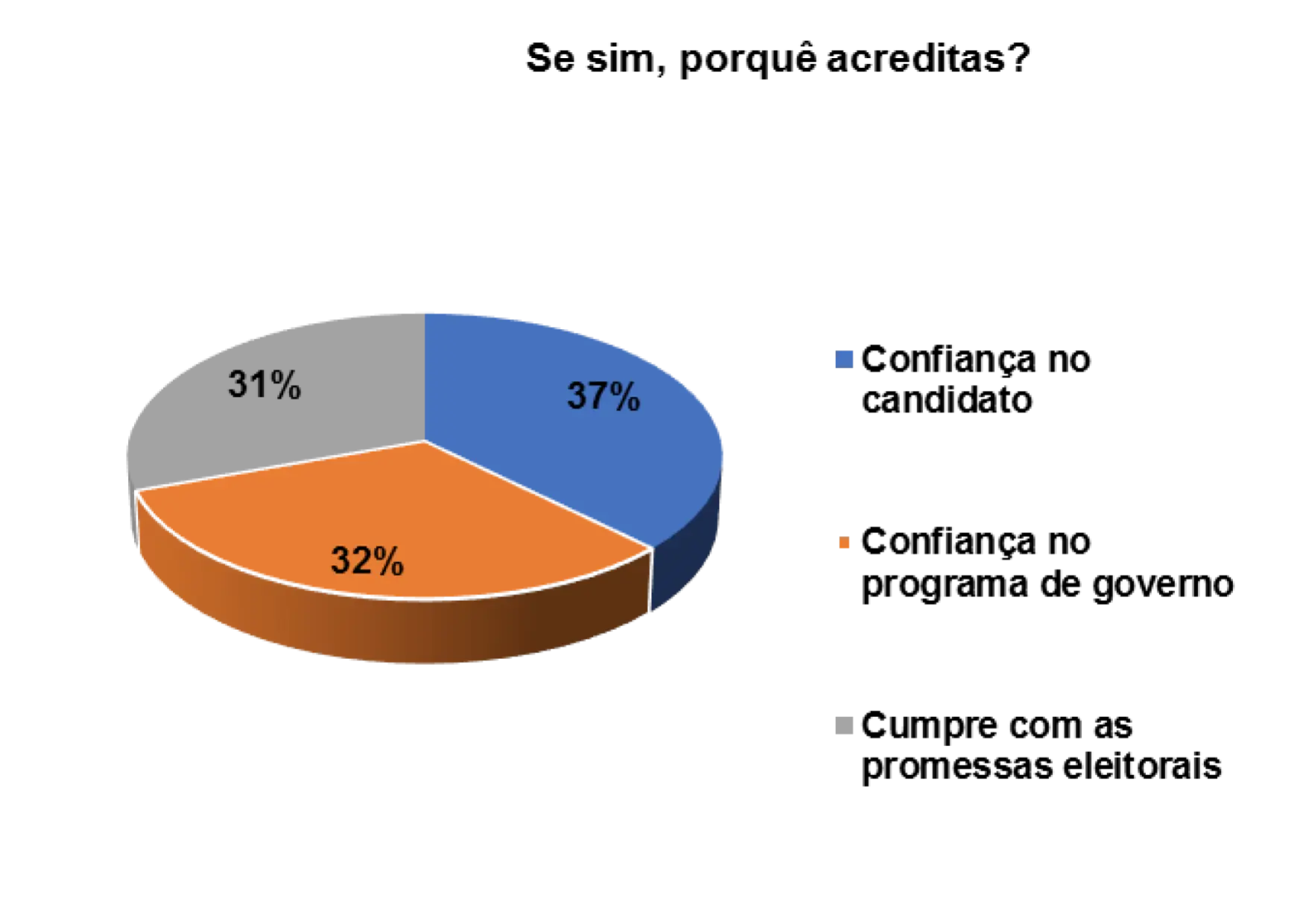 Além de tentar observar os principais motivos que influenciaram os eleitores a votarem ou não em determinados partidos ou candidatos nas eleições, procurou-se também compreender o nível de confiança que têm nas promessas eleitorais que são feitas pelos partidos e candidatos. Num universo de 152 eleitores entrevistados, 58% afirmam que não acreditaram nas promessas eleitorais dos candidatos e 41% afirmam acreditarem nas promessas.