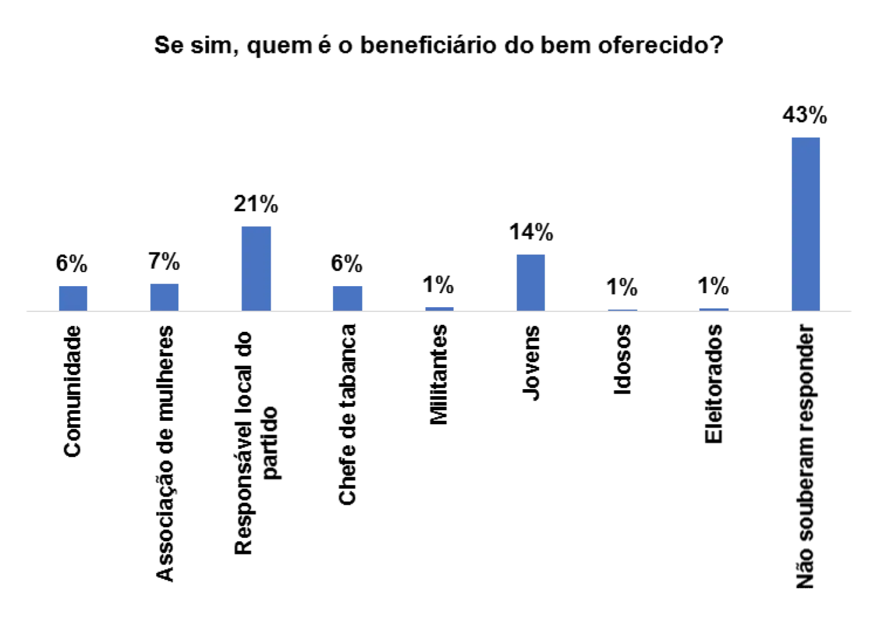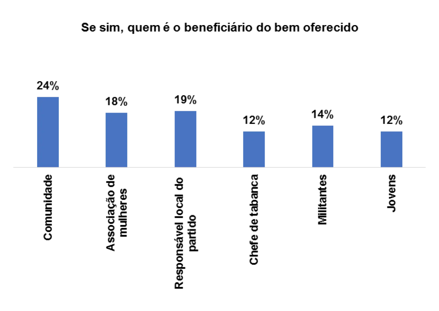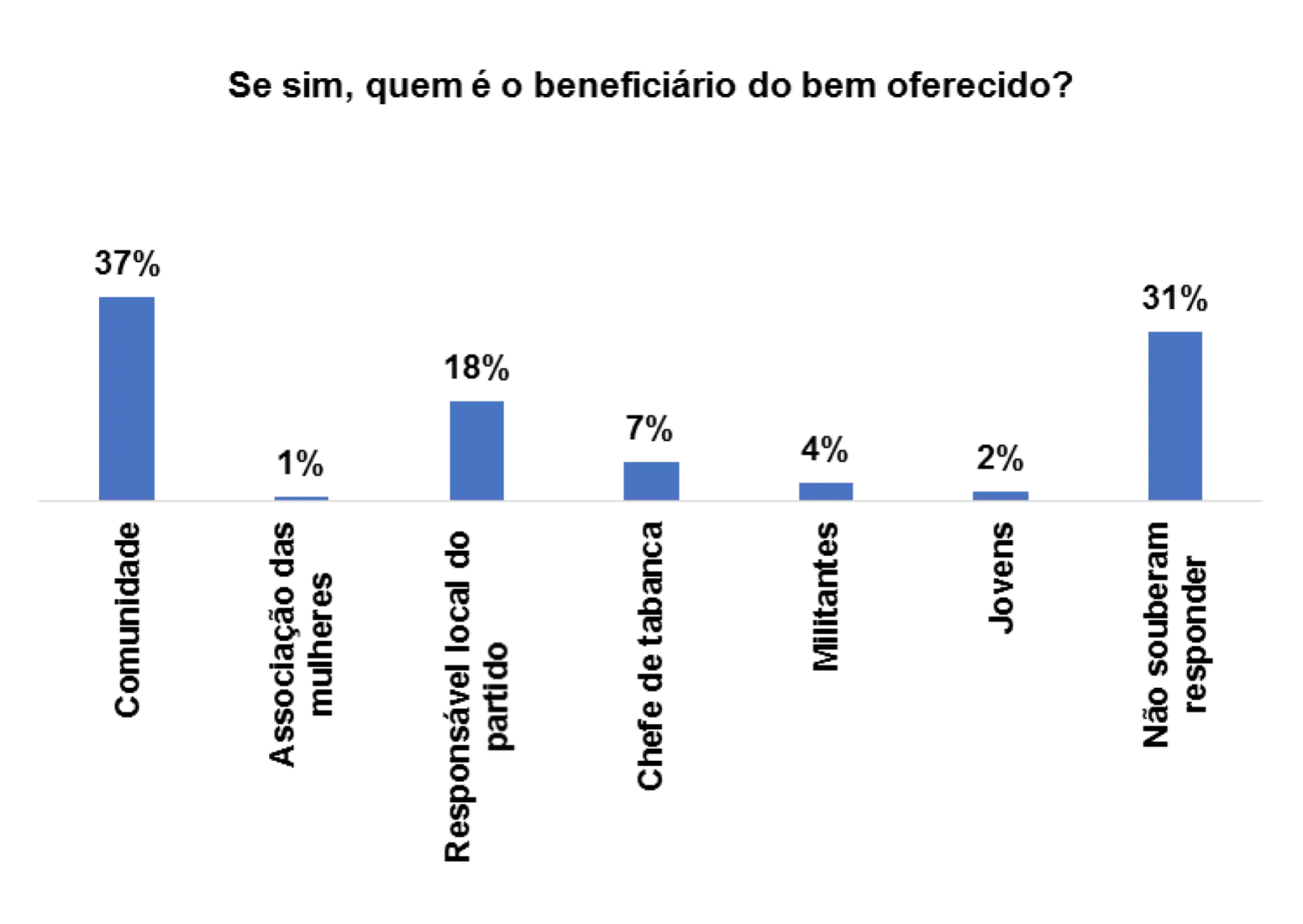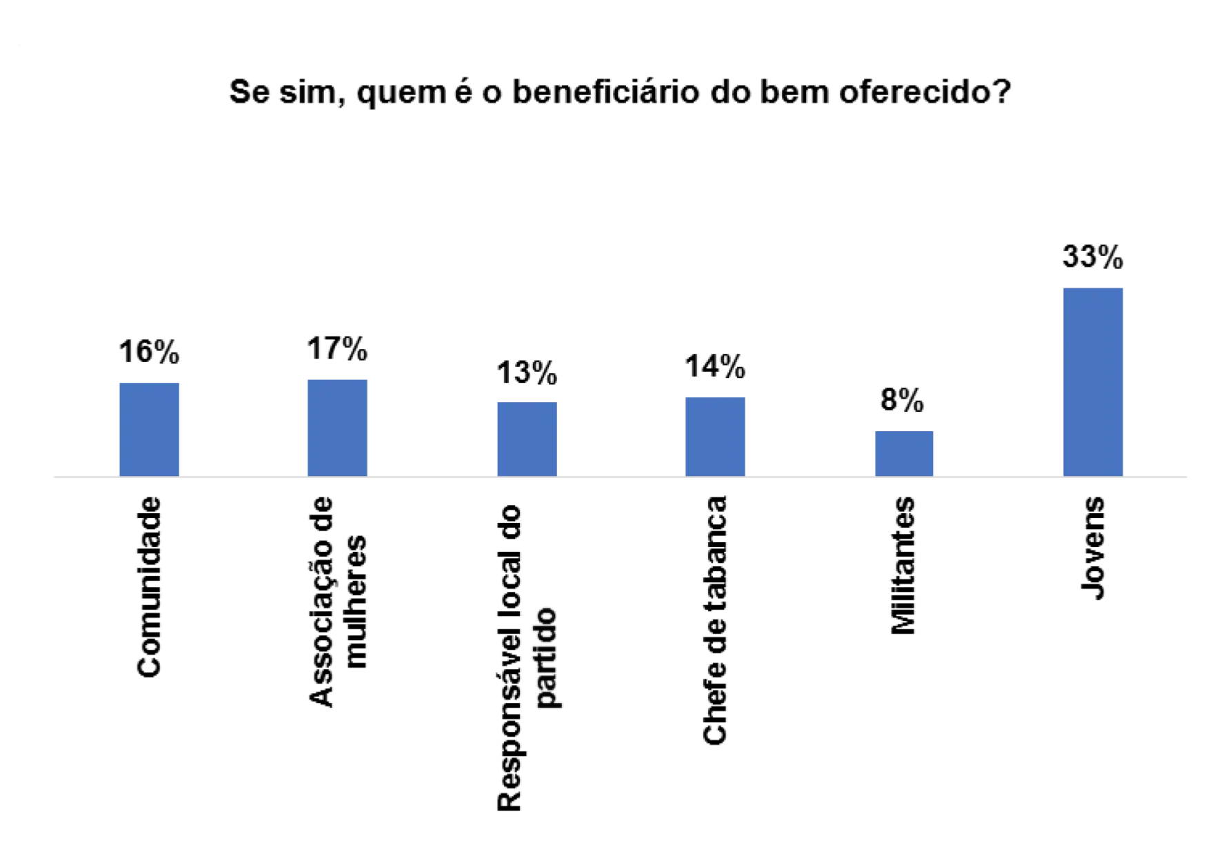 Entre os principais beneficiários, segundo os eleitores entrevistados afiguram estruturas sociocomunitárias e lideranças. E em suas respostas, 18% apontam a comunidade como um dos beneficiários, 14% acreditam que é o responsável local do partido e 20% consideram o chefe de tabanca. Conforme as indicações supramencionadas, os bens são distribuídos a partir de estruturas comunitárias existentes e líderes de opiniões, e cada grupo em função de sua capacidade de organização e densidade de seus membros pode alocar mais benefícios.