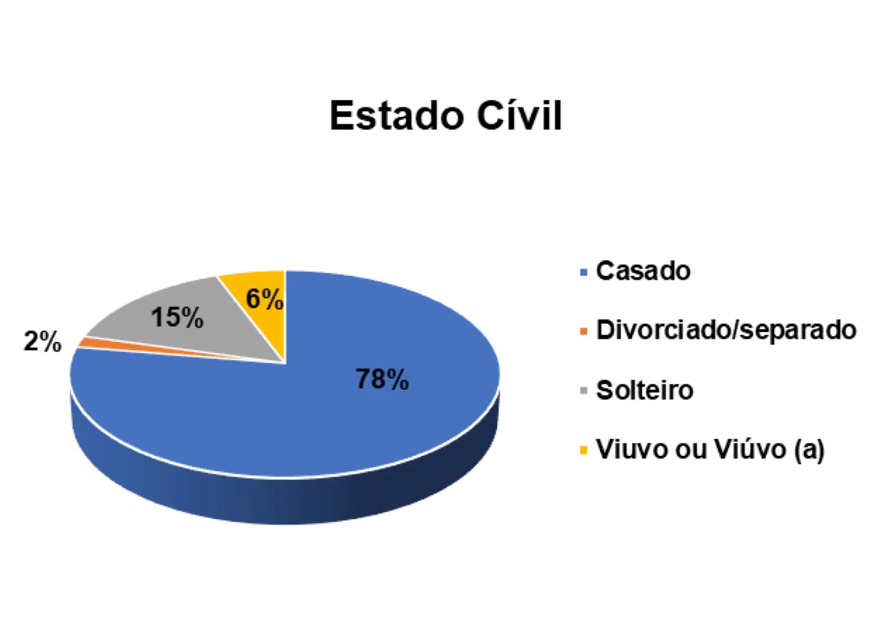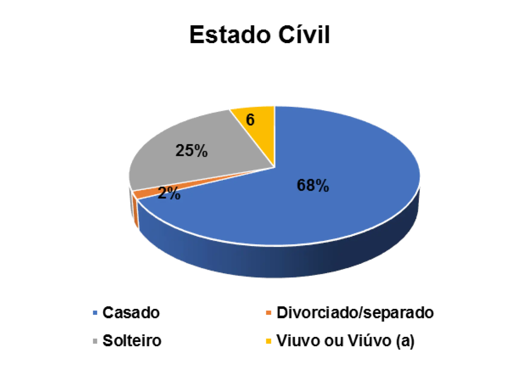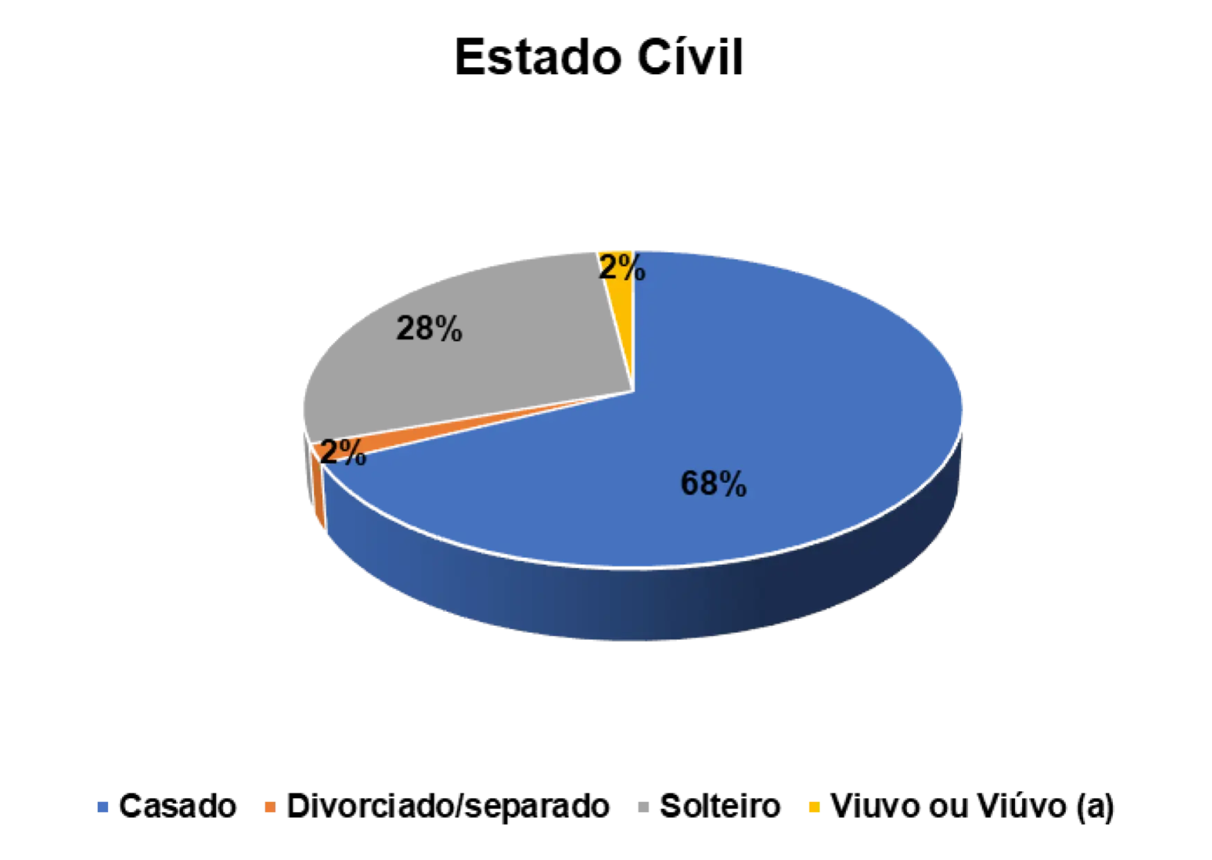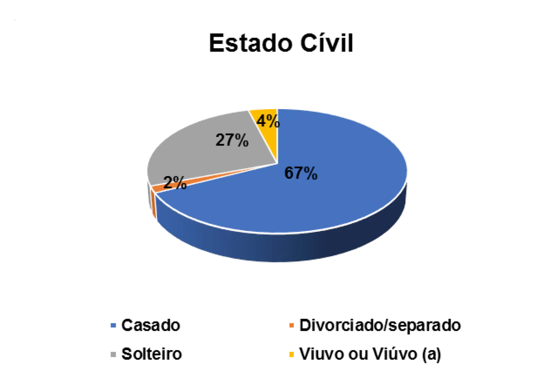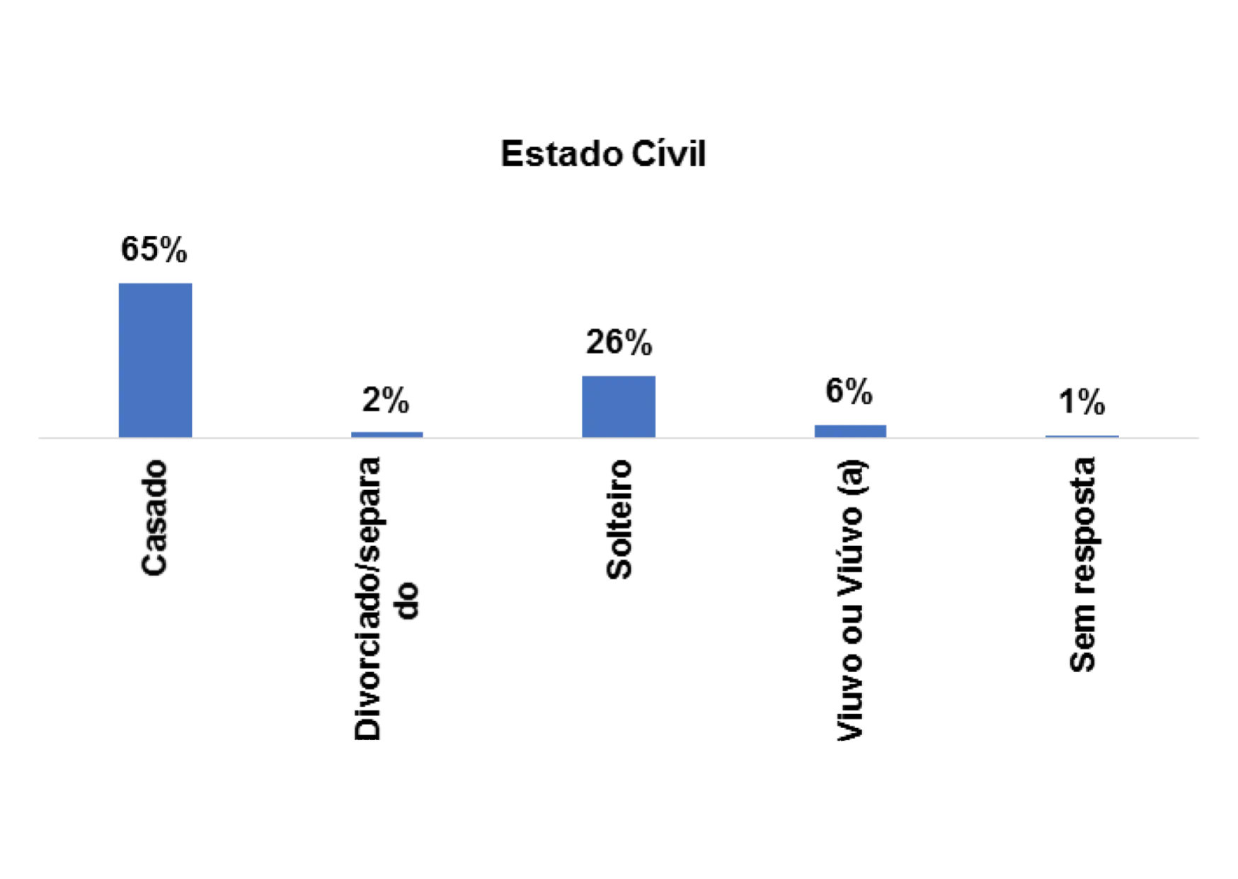 No que diz respeito ao estado civil dos/as entrevistados/as, constatou-se que 65% são casados (as), 26% são solteiros (as), 2% são divorciados (as) e 6% são viúvos (as).
