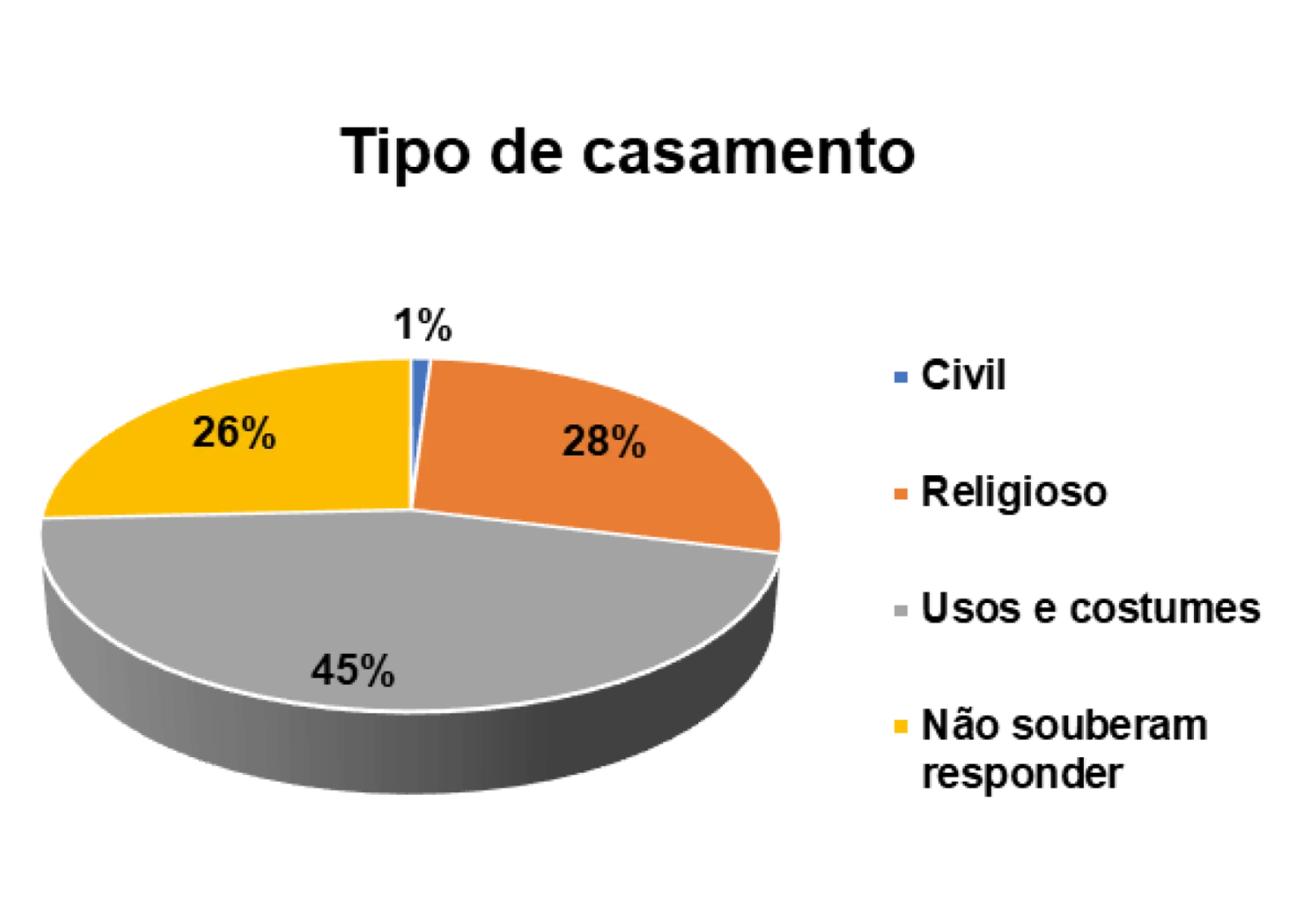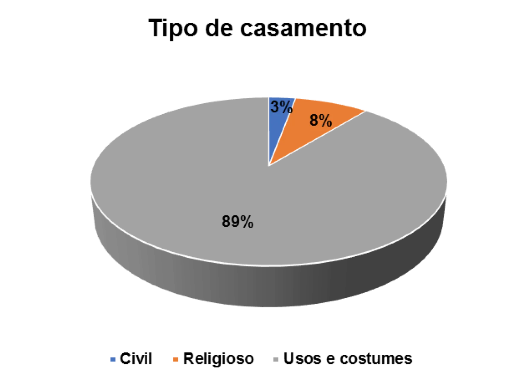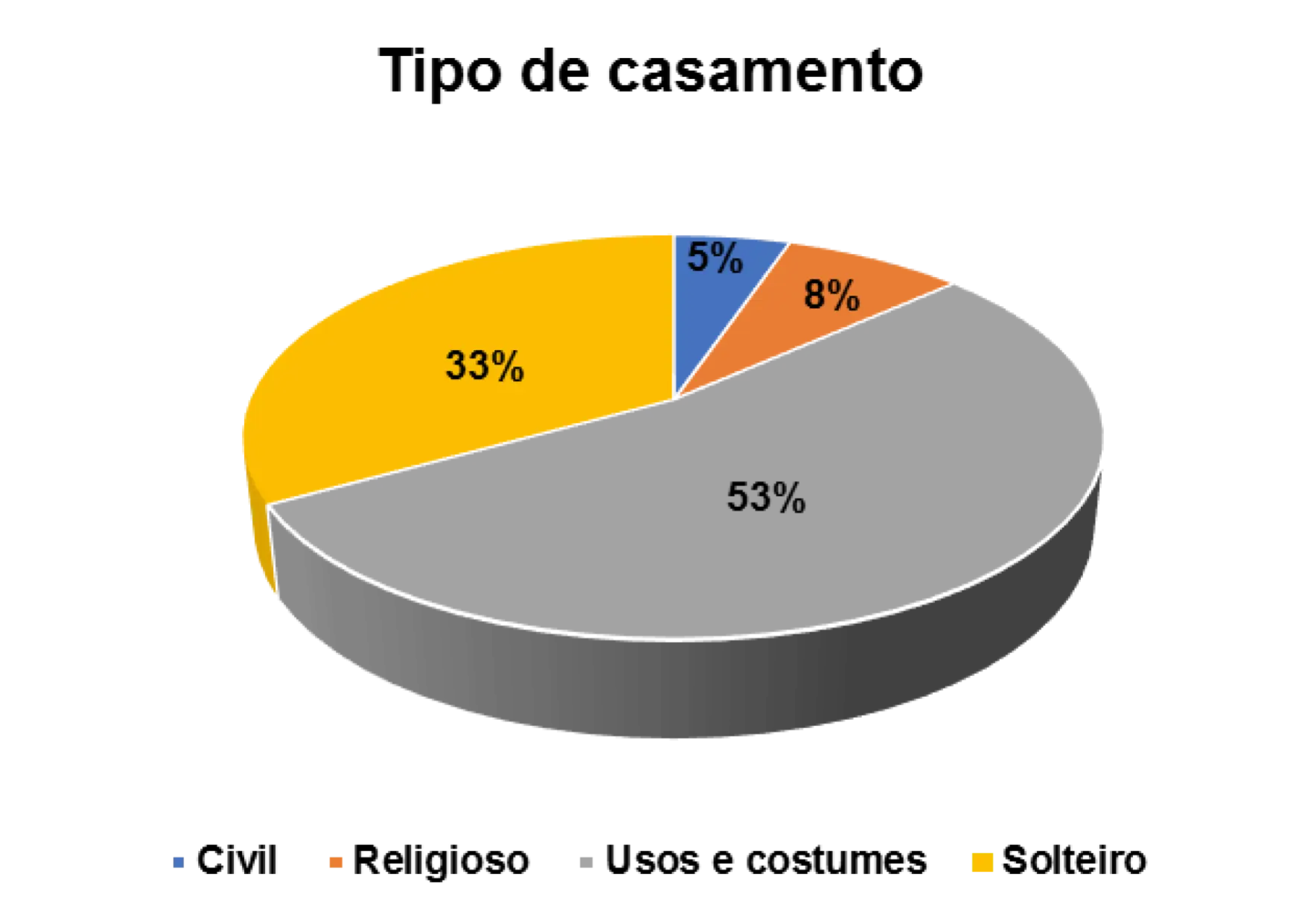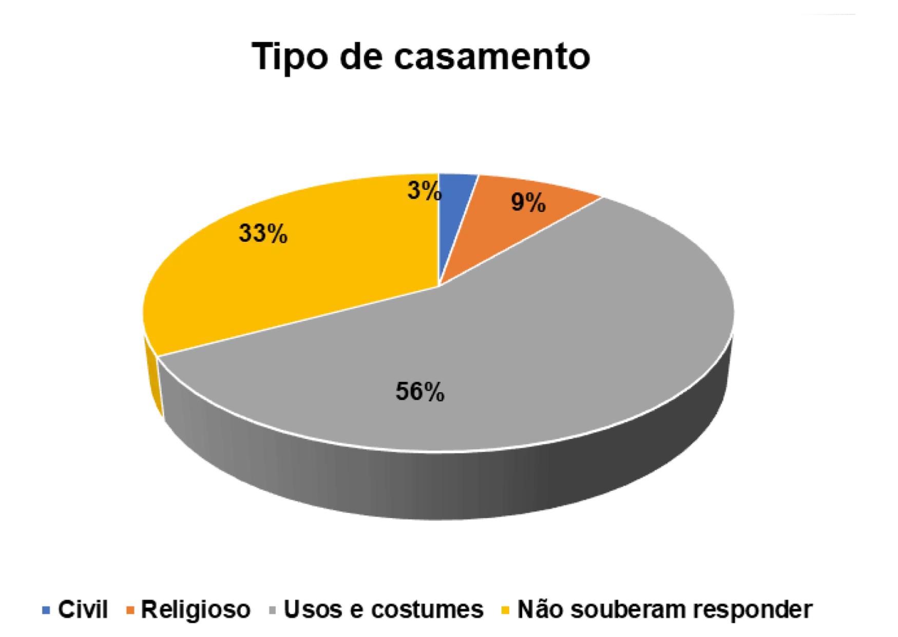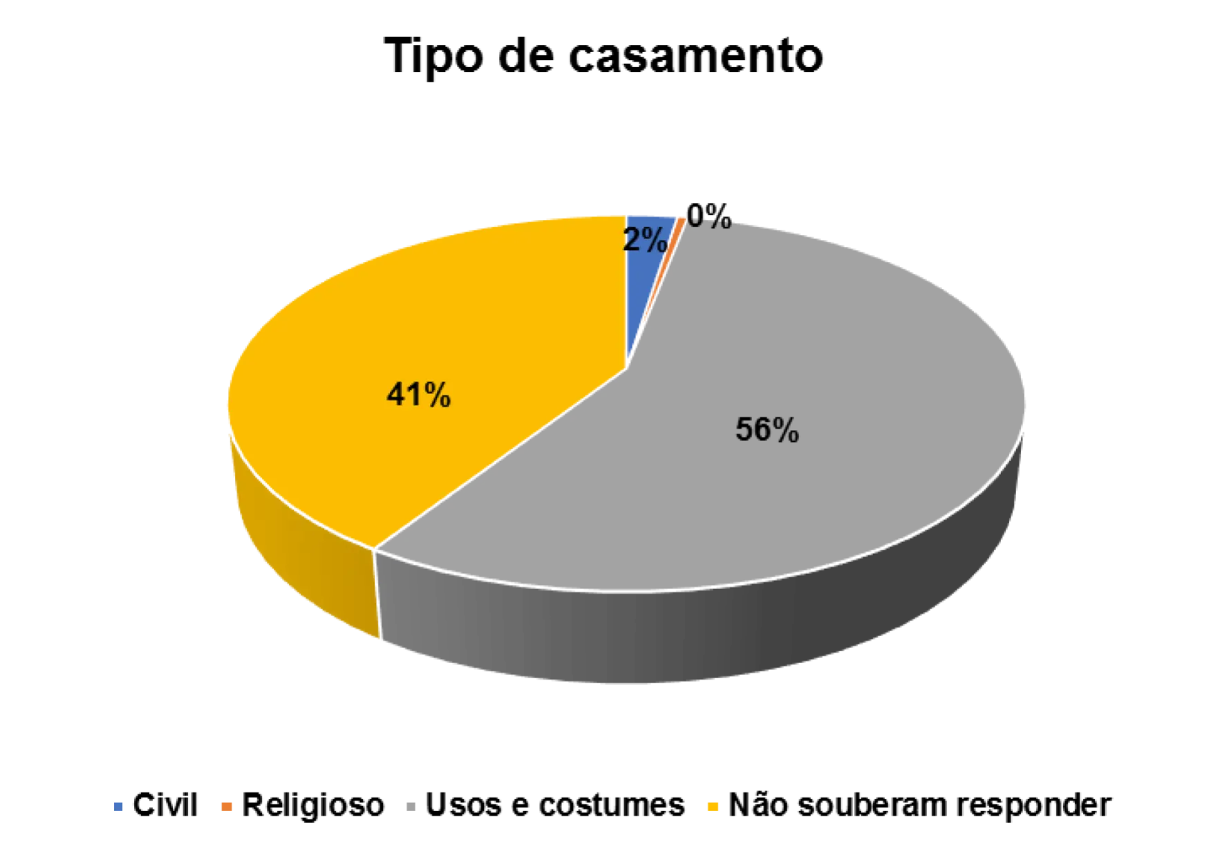 Entre os casados, a forma de união predominante é a baseada em usos e costumes de cada grupo. Esse tipo de celebração representa 55% dos entrevistados e é característico em quase todas as regiões.