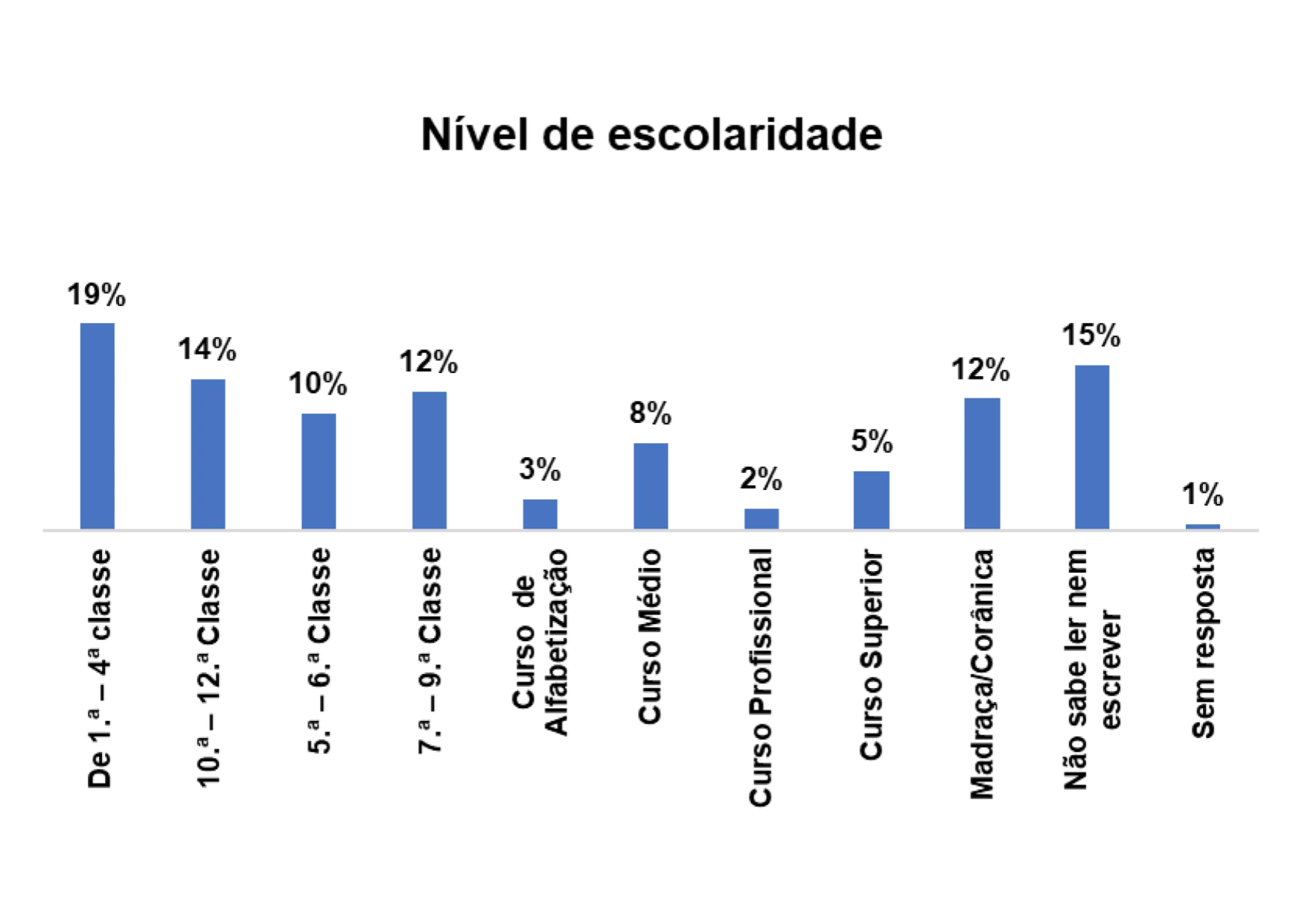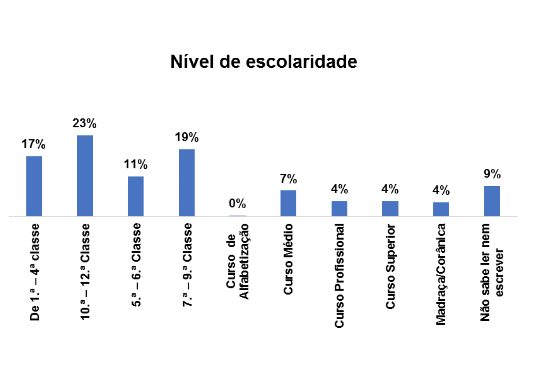 De acordo com o gráfico 8, o nível de escolaridade predominante entre os/as entrevistados/as nessa região é o nível de escolaridade de 10ª – 12ª classe, representado por 38% em seguida o nível de 1.ª – 4ª classe, representado por 19%.