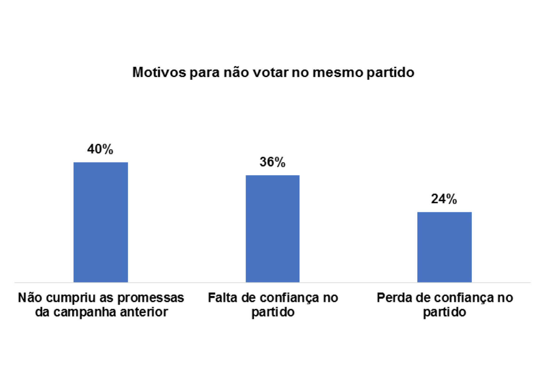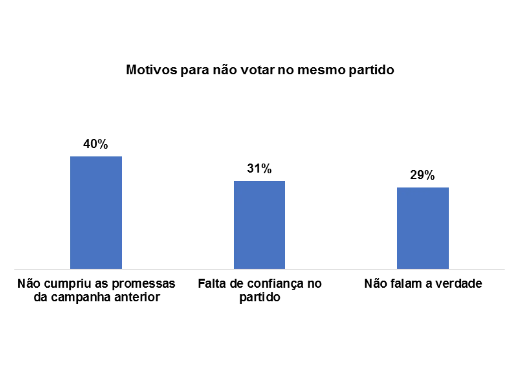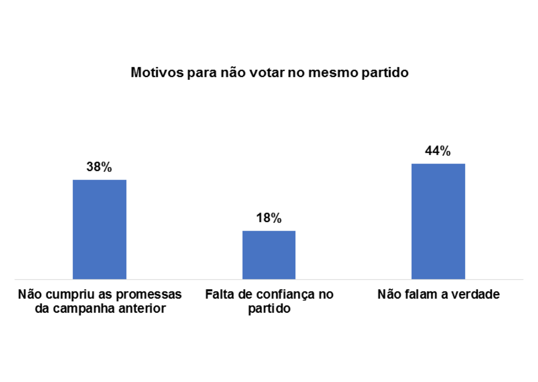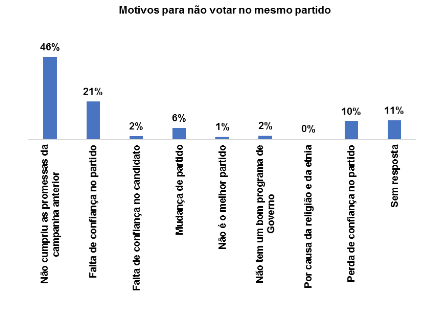 E os/as entrevistados/as que afirmam que não votaram no mesmo partido nas últimas eleições pelos seguintes motivos: não cumpriu as promessas da campanha anterior (46%), falta de confiança no partido (21%) e perda de confiança no partido (10%).