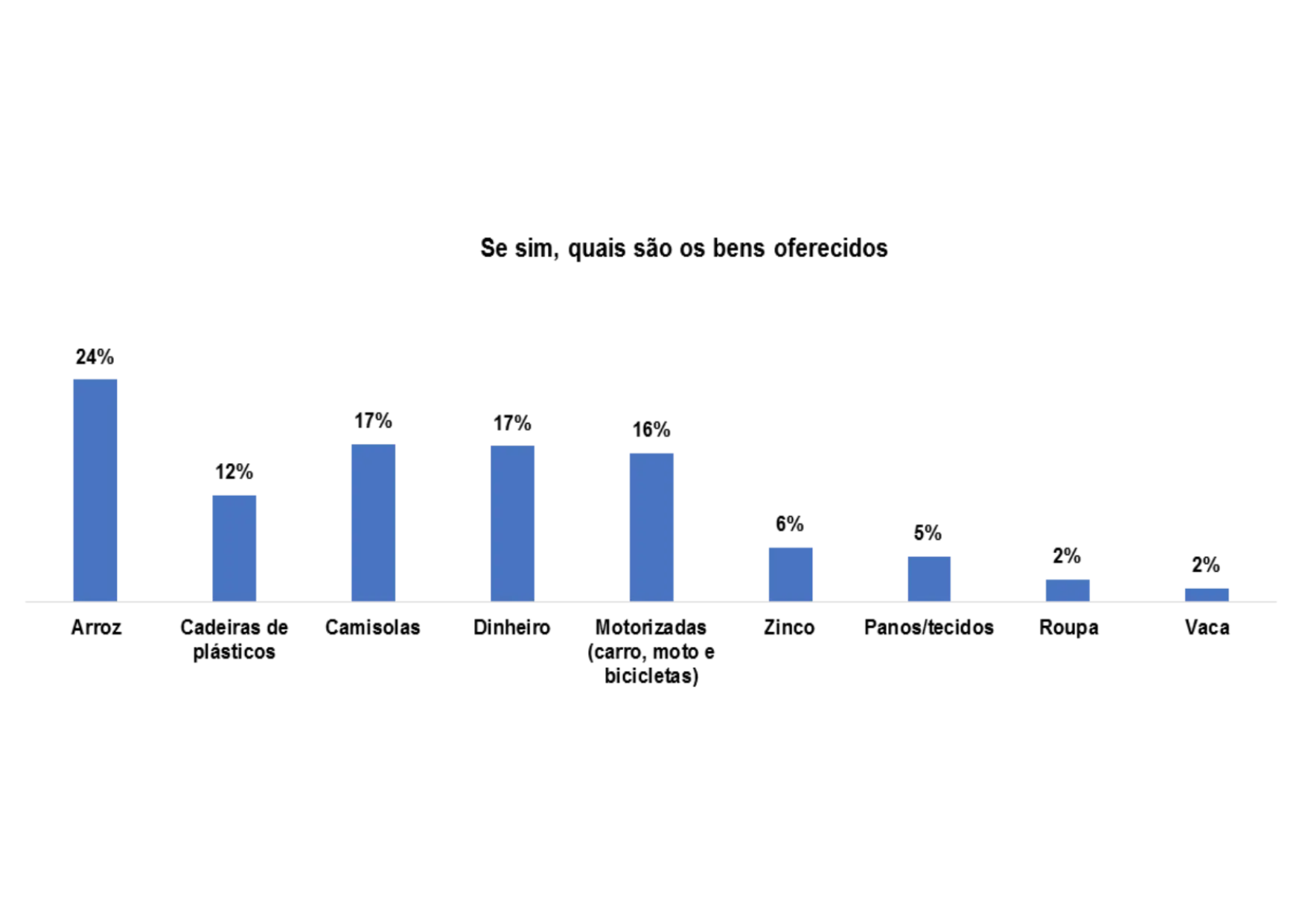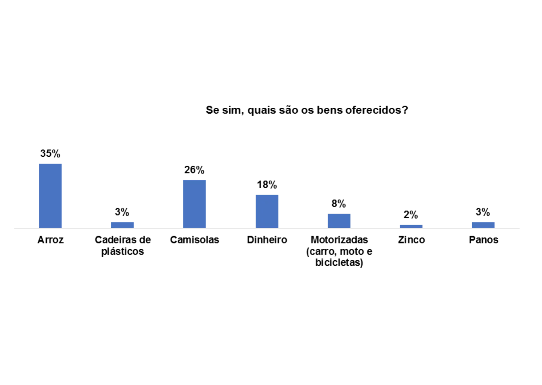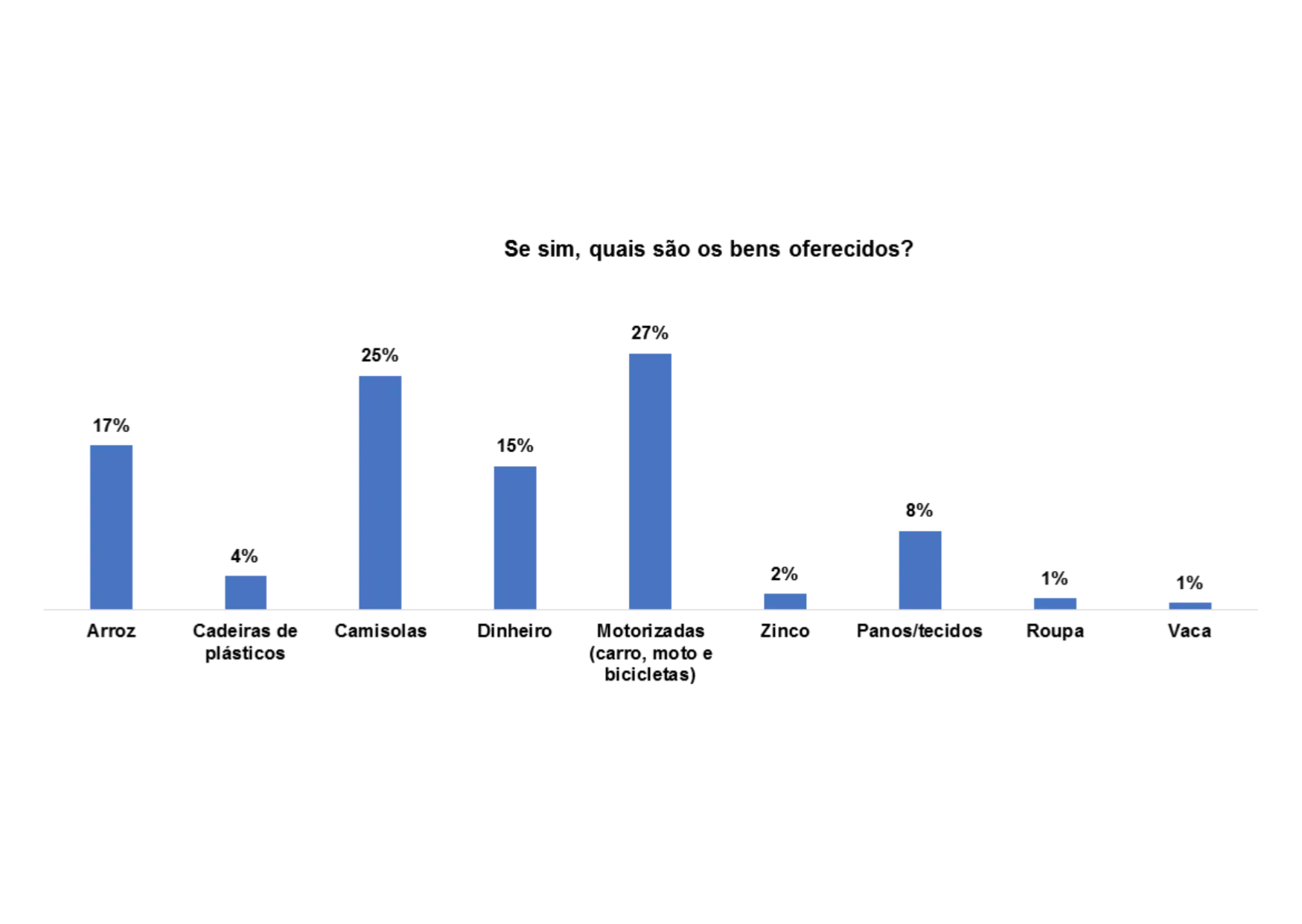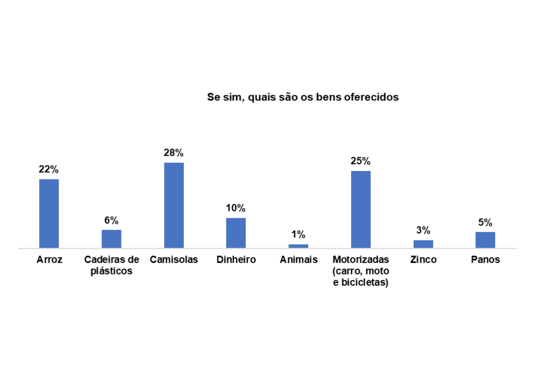 Segundo o gráfico 28, os bens oferecidos para angariar votos nas comunidades são: motorizado (25%), camisolas (28%), arroz (22%) e dinheiro (10%).