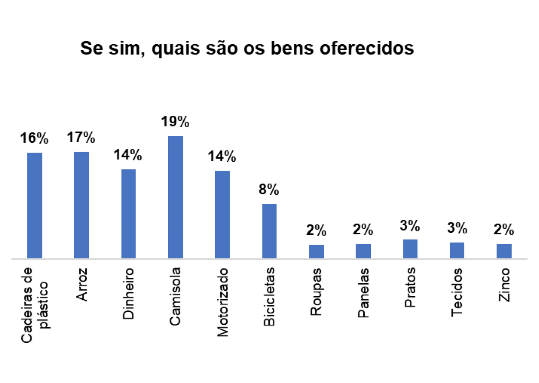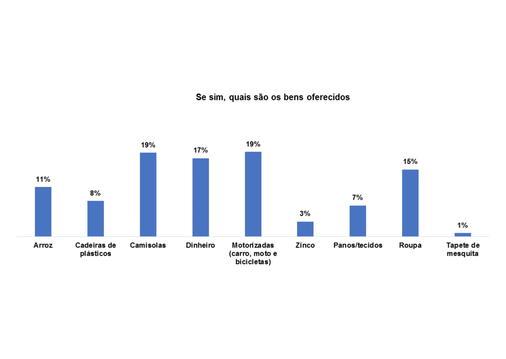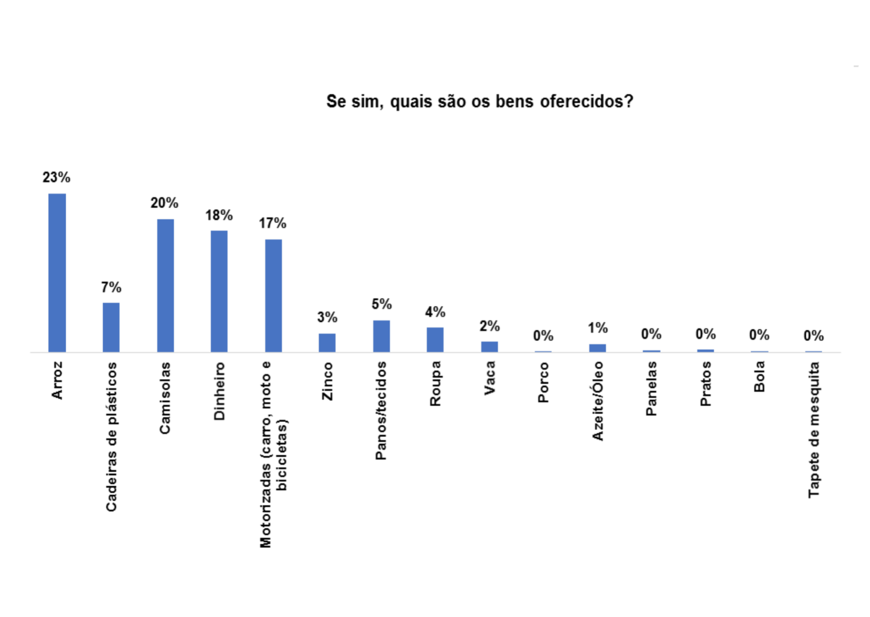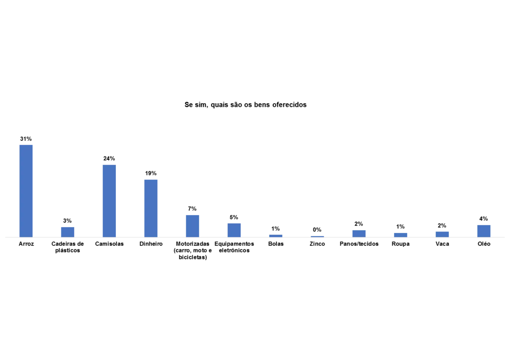 Segundo o gráfico 28, os bens oferecidos para angariar votos nas comunidades são: motorizado (25%), camisolas (28%), arroz (22%) e dinheiro (10%).