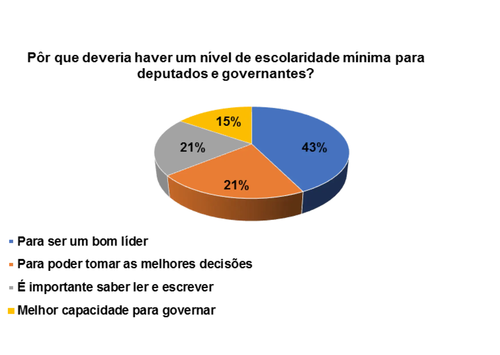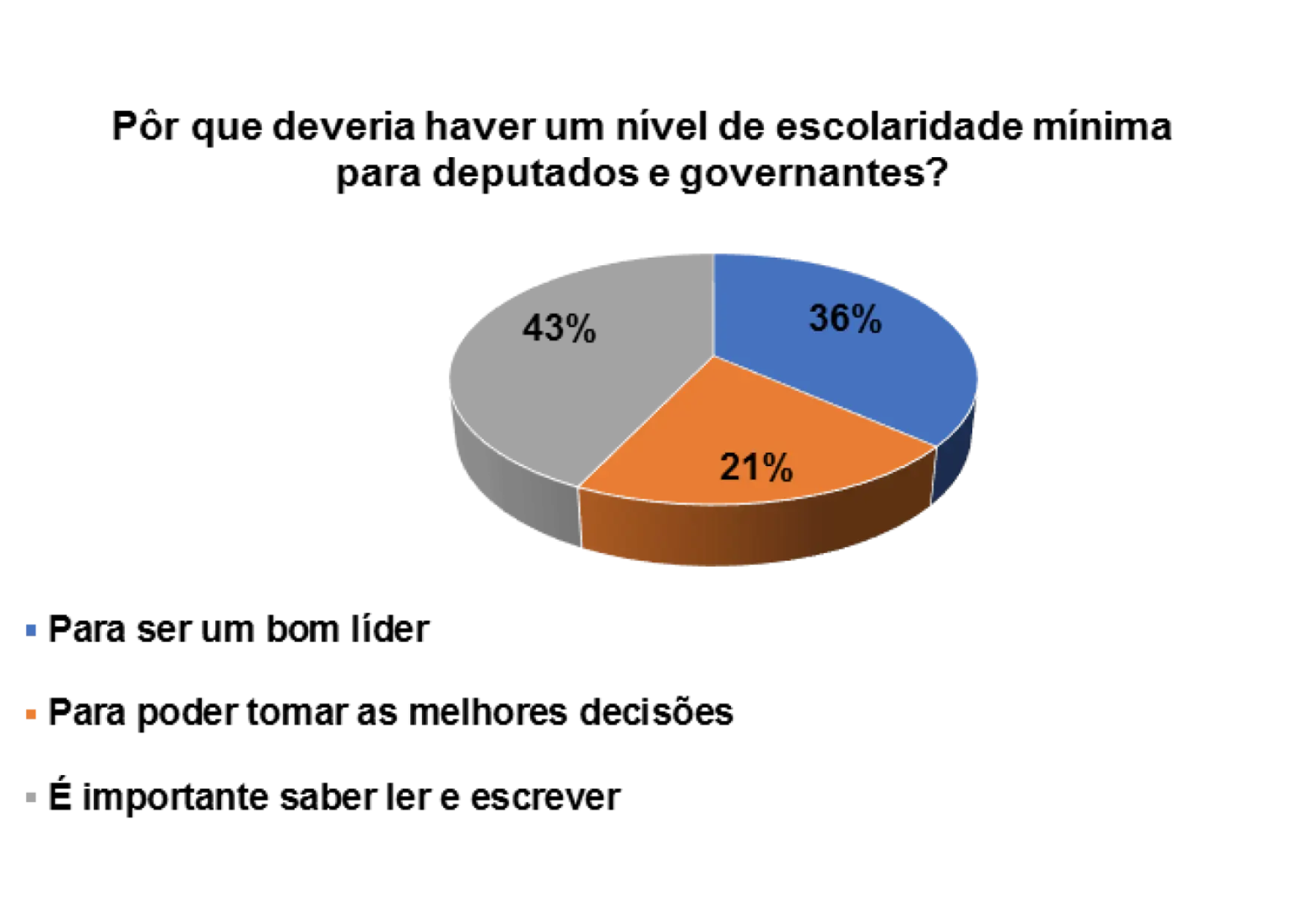 De acordo com o gráfico 31, os eleitores entrevistados afirmam que é importante haver um nível de escolaridade mínimo para deputados e membro do governo pelos seguintes motivos: 16% consideram que é fundamental para se poder ser um bom líder, 32% são de opinião que é necessário para se poder tomar as melhores decisões e 27% justificam que é a base para se ter a capacidade de governar melhor.