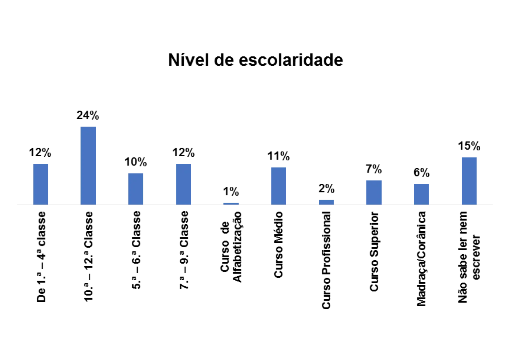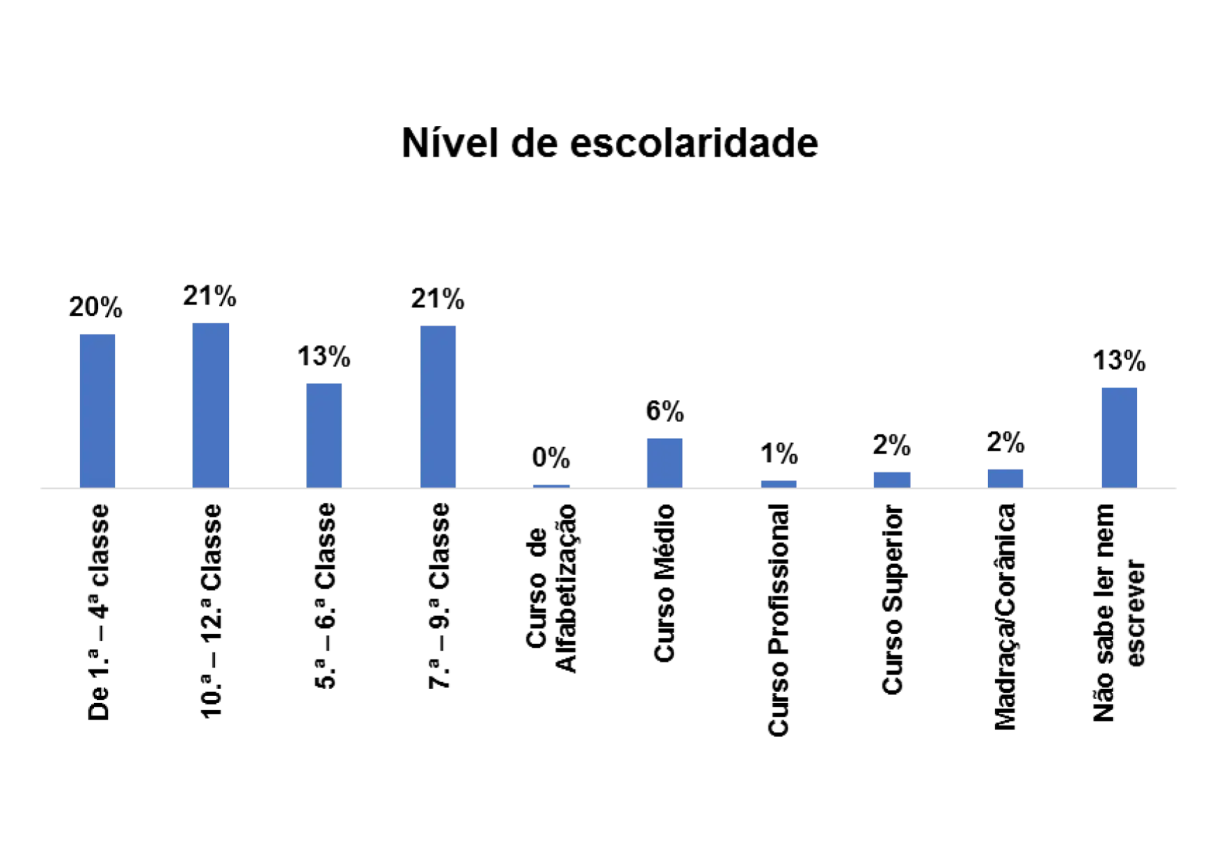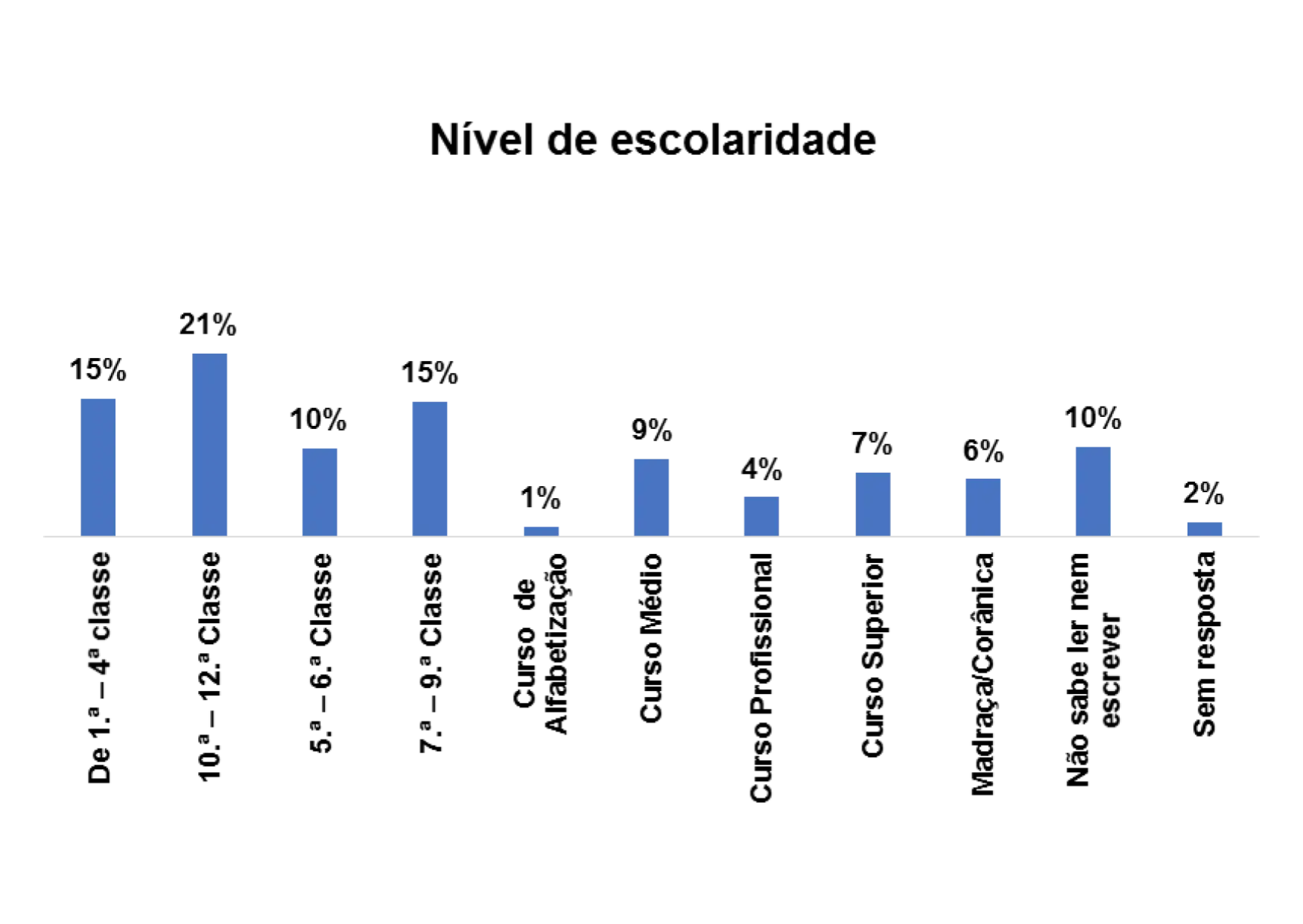De acordo com o gráfico 8, o nível de escolaridade predominante entre os/as entrevistados/as no estudo é o nível de escolaridade entre 10ª – 12ª classe, representado por 21% em seguida o nível entre 7.ª – 9ª classe, representado por 15%. E ainda se nota que 10% dos entrevistados/as não sabem ler e nem escrever.