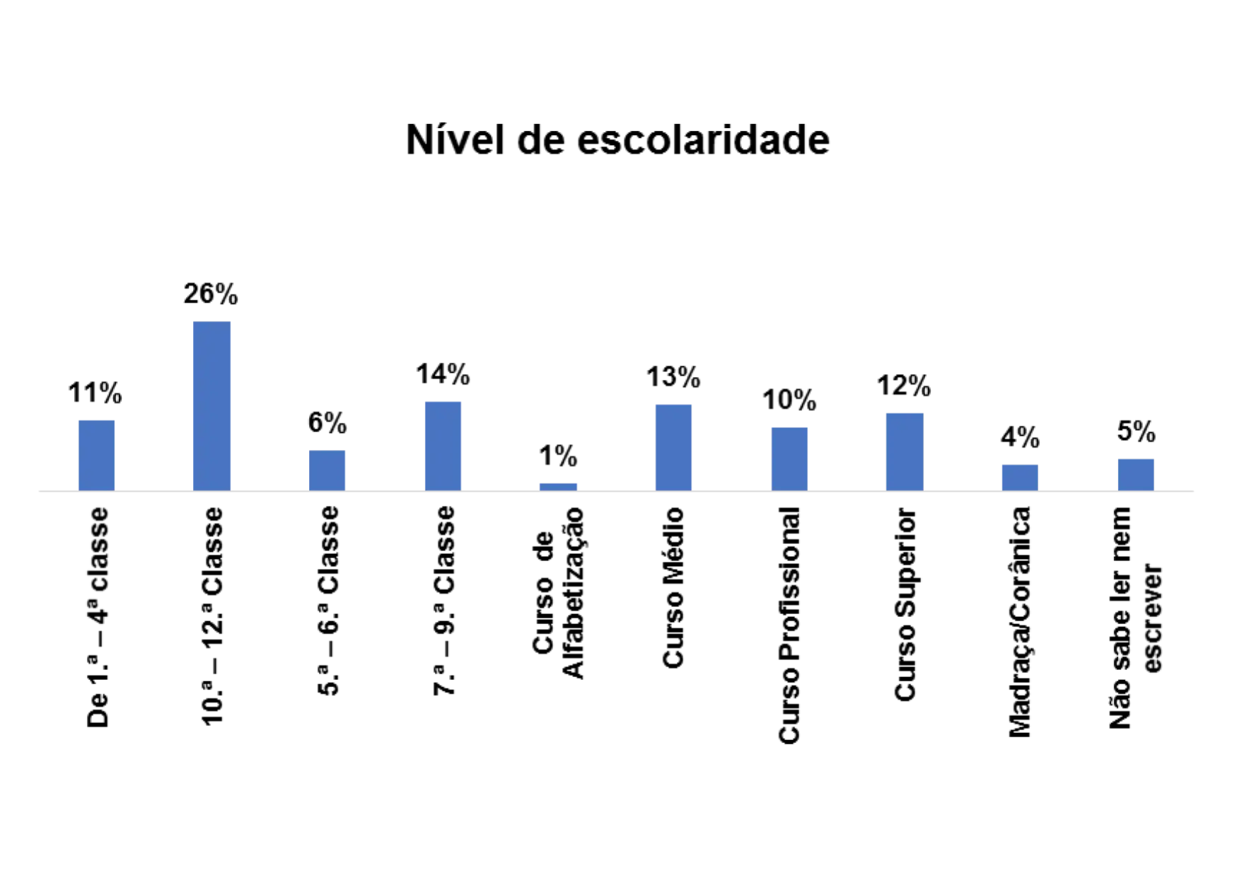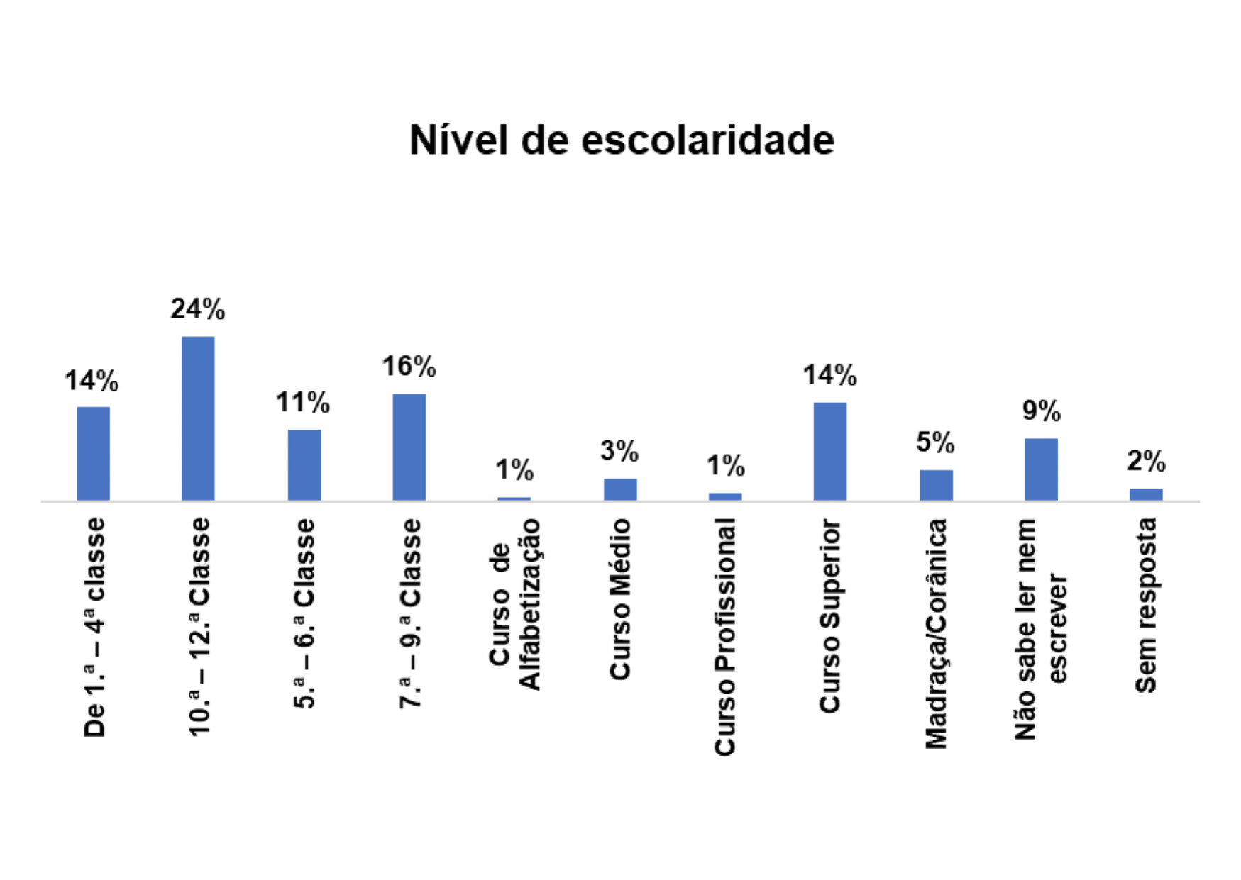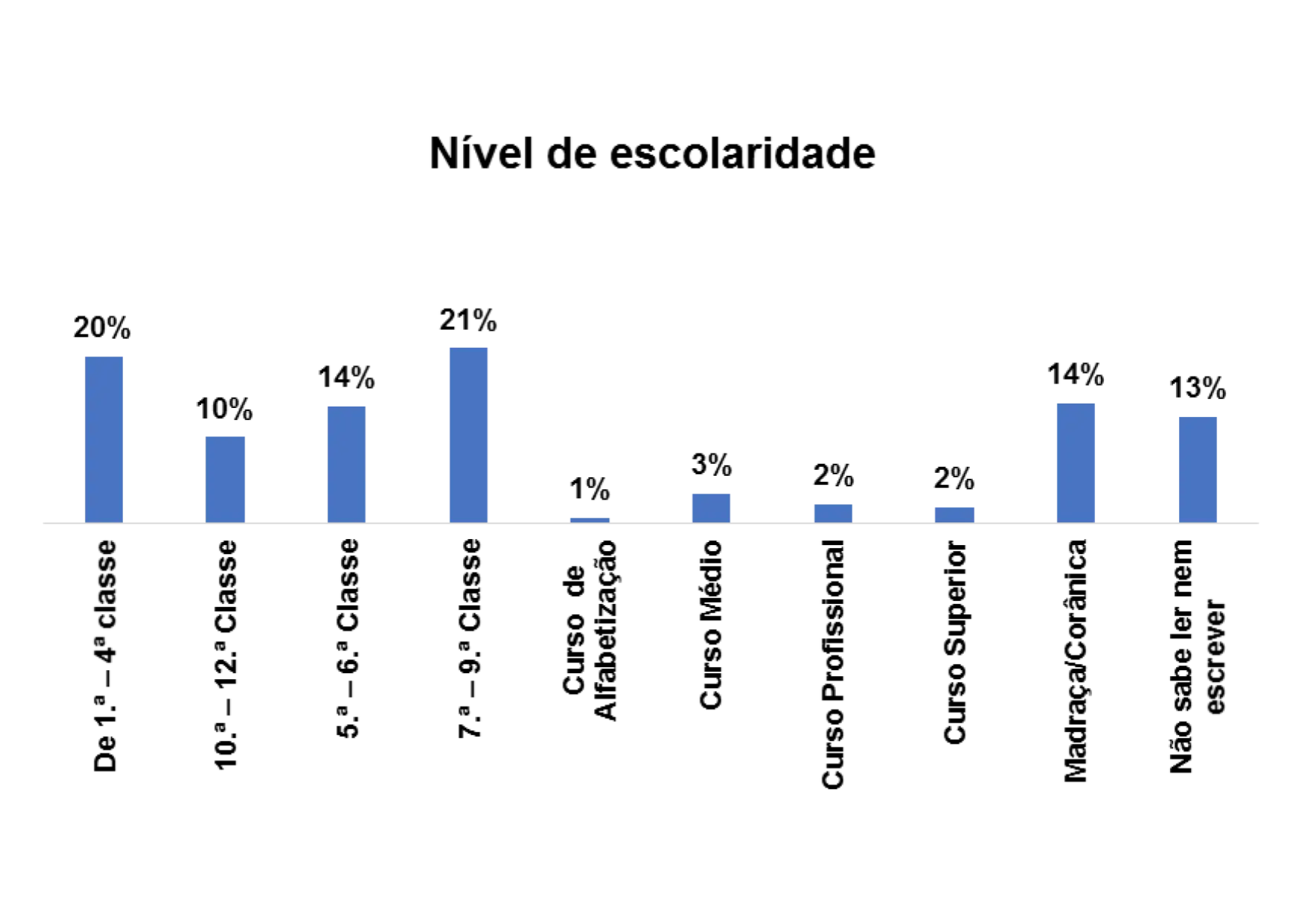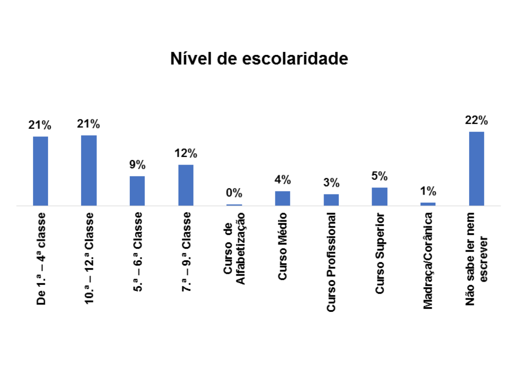 De acordo com o gráfico 8, o nível de escolaridade predominante entre os/as entrevistados/as no estudo é o nível de escolaridade entre 10ª – 12ª classe, representado por 21% em seguida o nível entre 7.ª – 9ª classe, representado por 15%. E ainda se nota que 10% dos entrevistados/as não sabem ler e nem escrever.