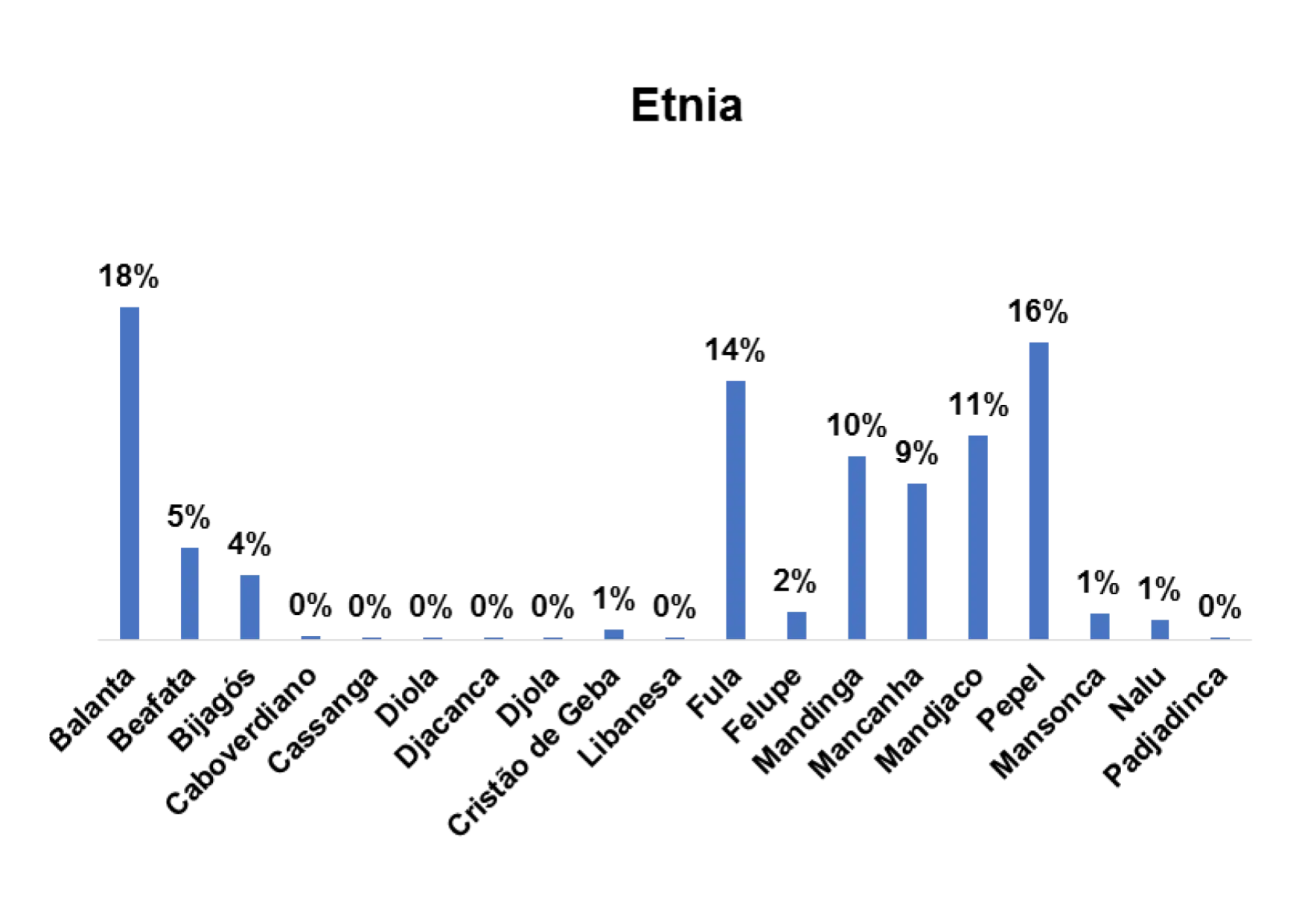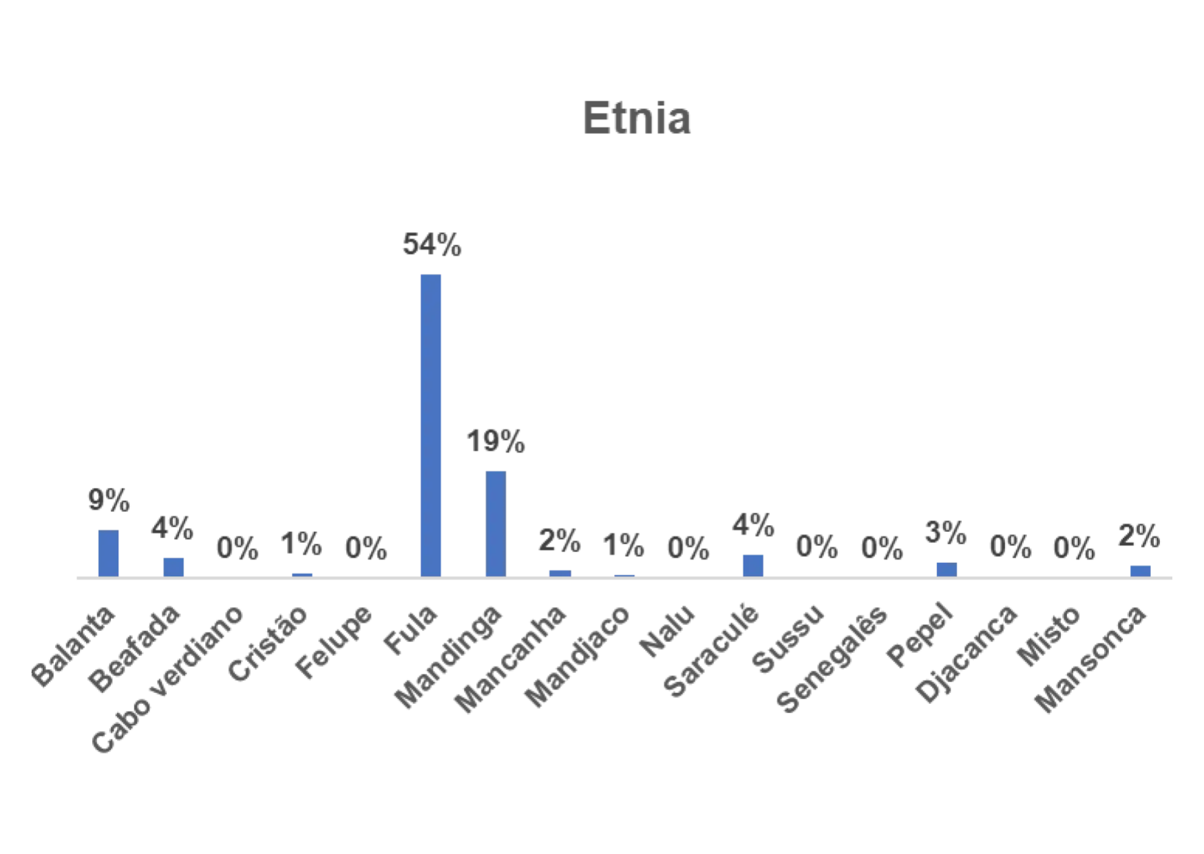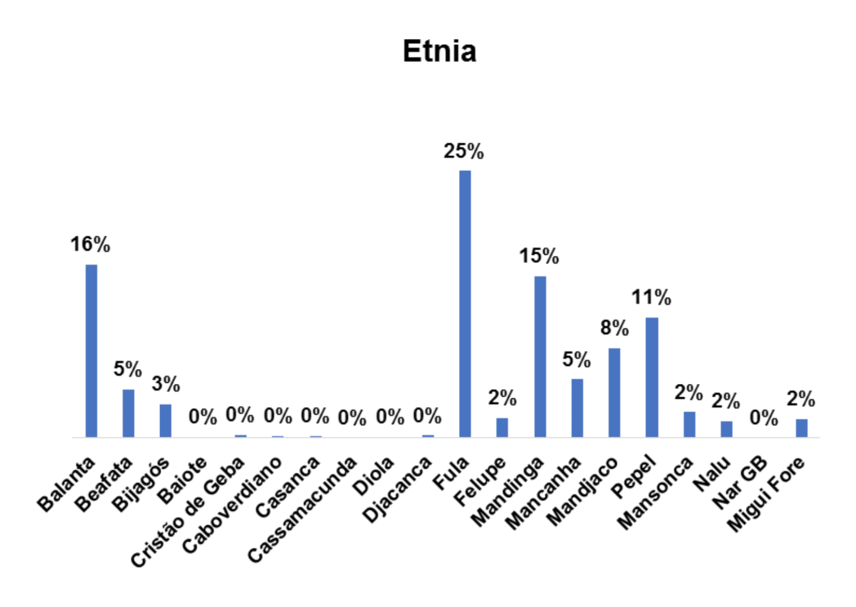 Segundo o gráfico 1, a etnia predominante entre os/as entrevistados/as no estudo a nível nacional é a etnia fula, representada por 25% em seguida a etnia balanta, representada por 16%.