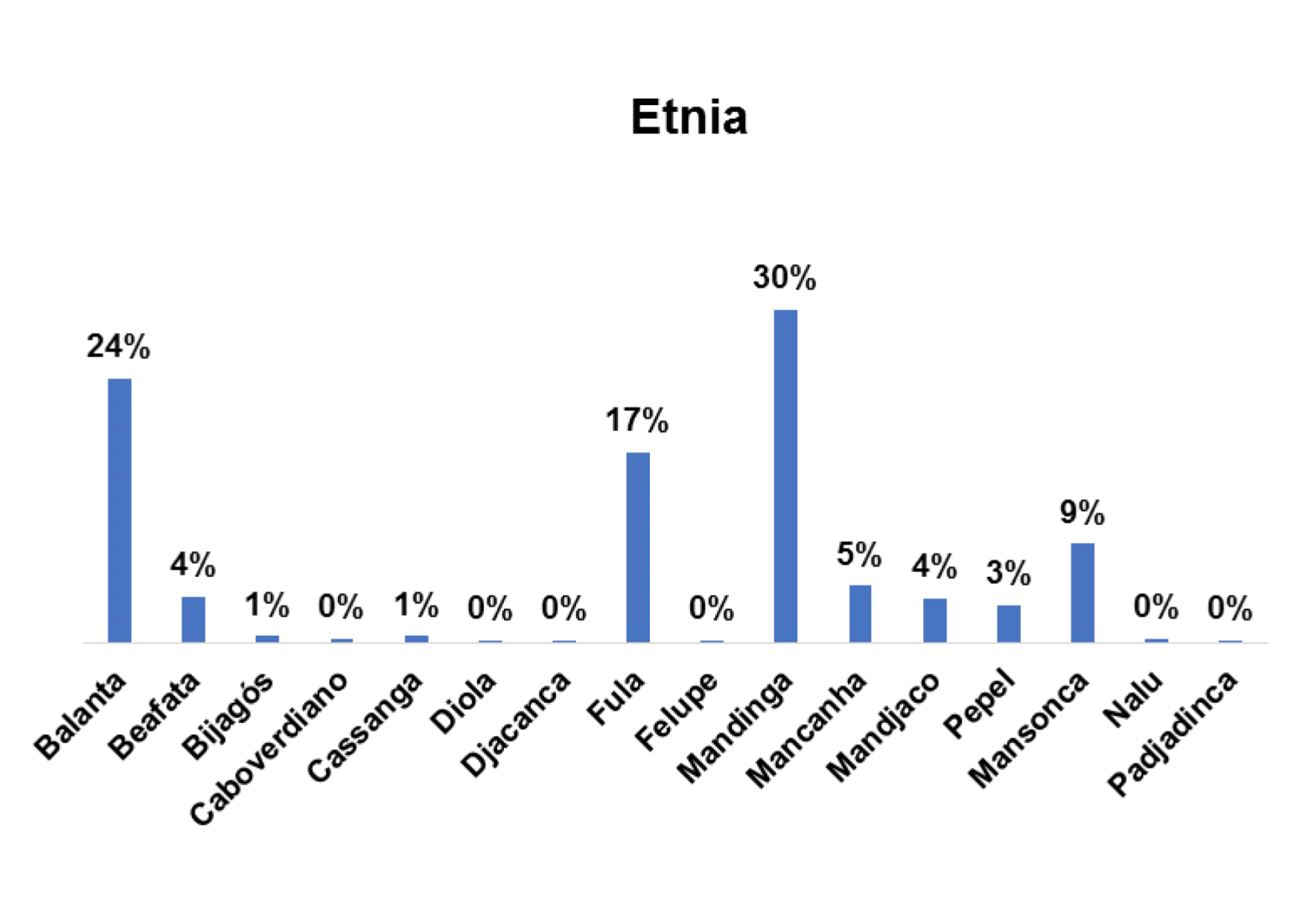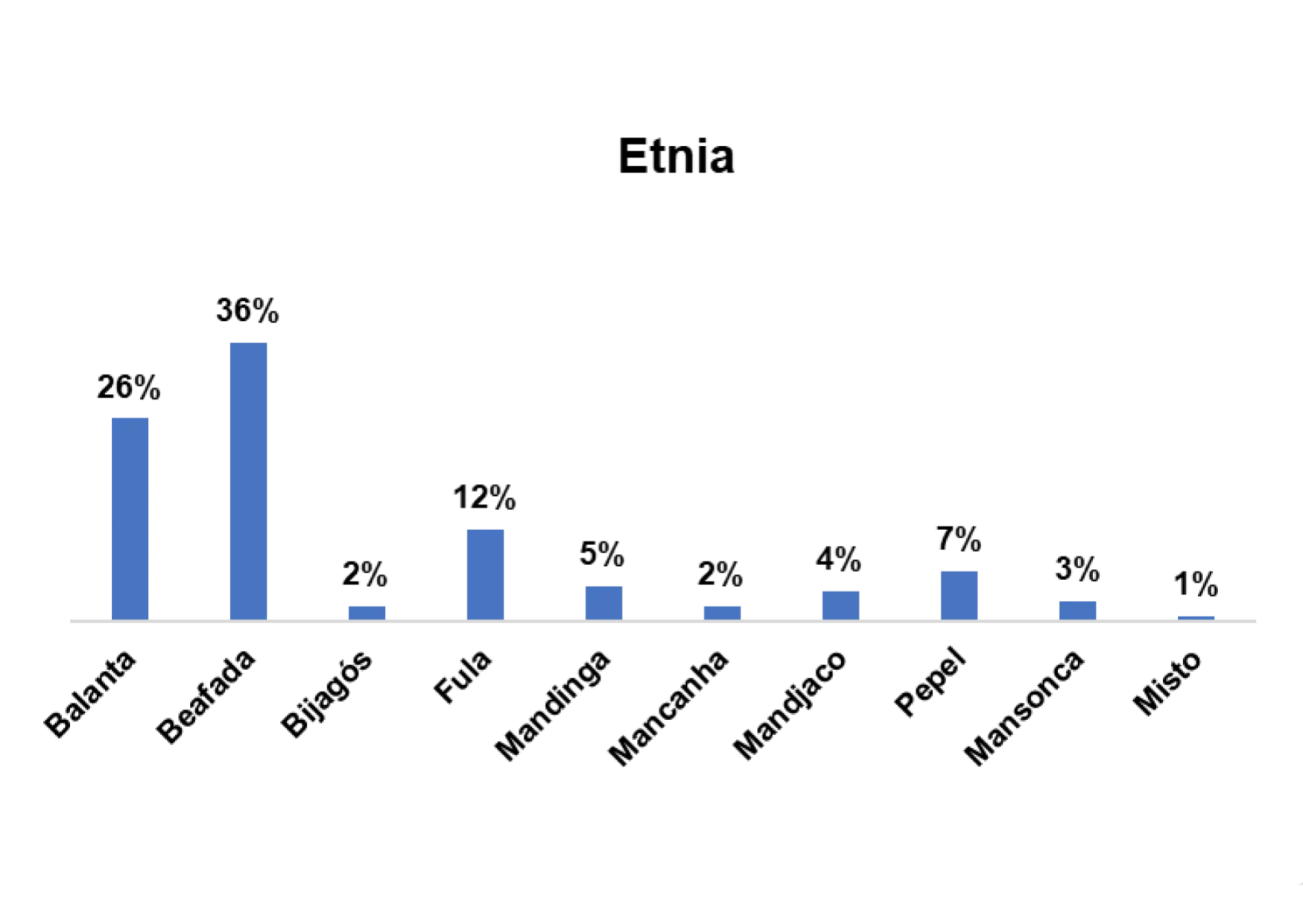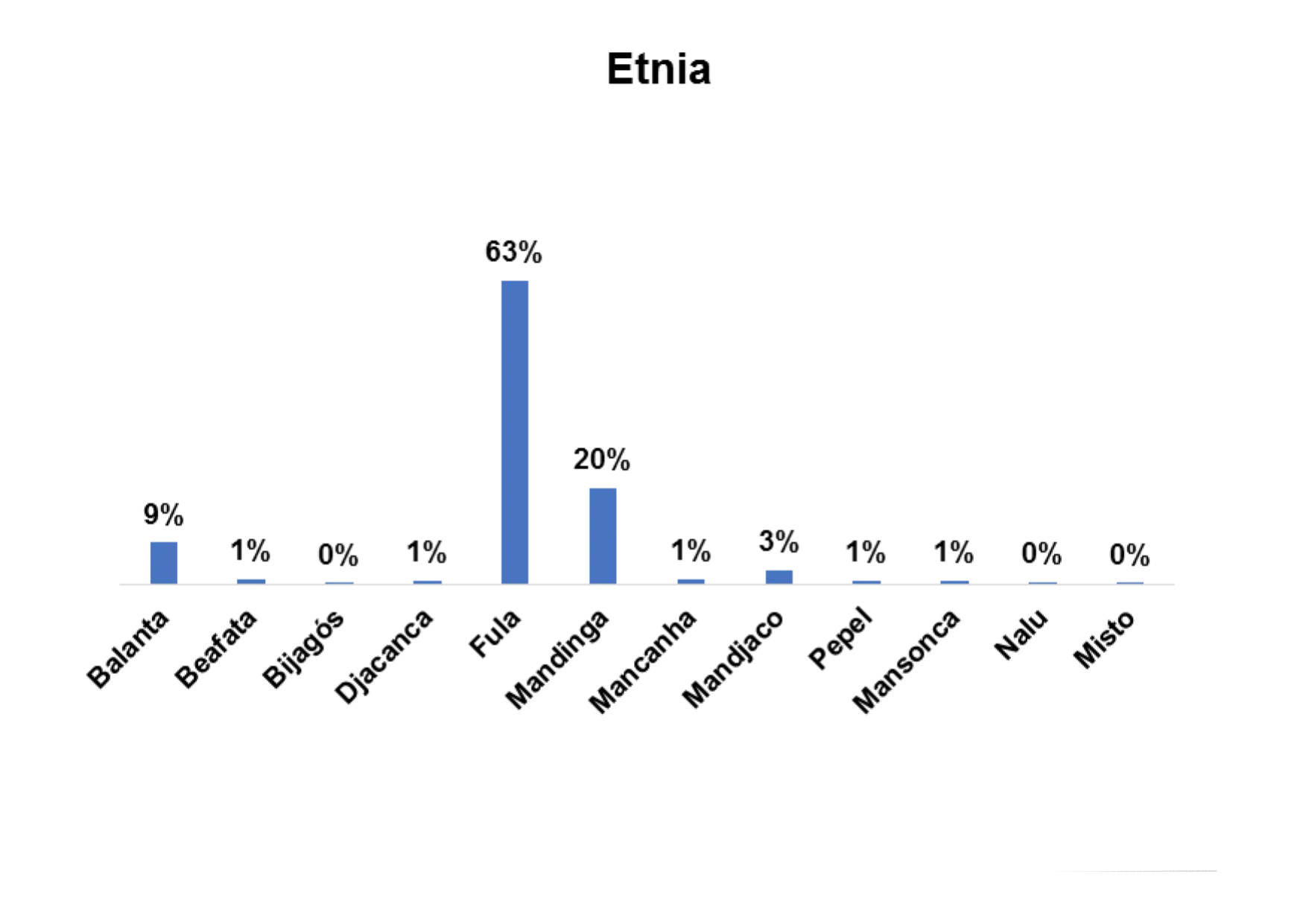 Segundo o gráfico 1, a etnia predominante entre os/as entrevistados/as no estudo a nível nacional é a etnia fula, representada por 25% em seguida a etnia balanta, representada por 16%.