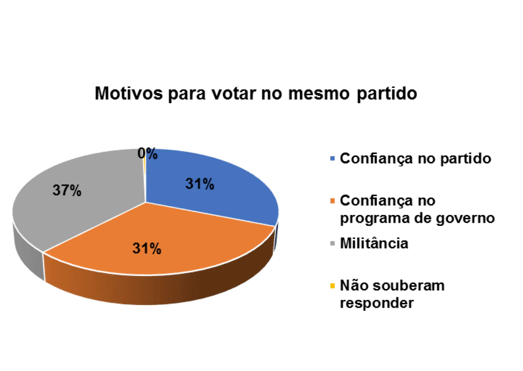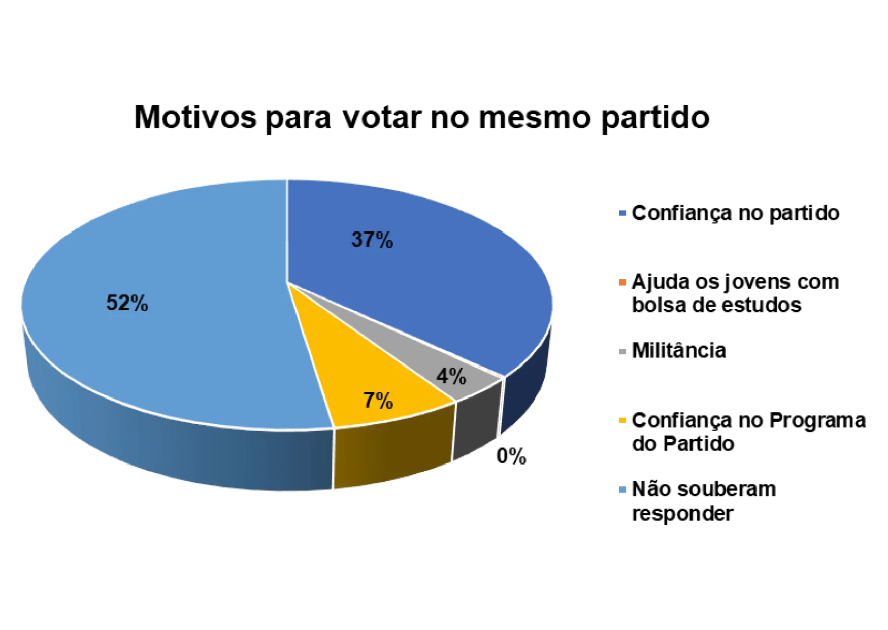 E de acordo com as respostas, os eleitores não apresentaram dificuldades em apontar os principais motivos que os levem a votar sempre no mesmo partido. E em suas respostas, 38% justificam que é por confiança no partido, 11% consideram que é pelo bom programa de governo e apenas 5% afirmam que admiram o partido.