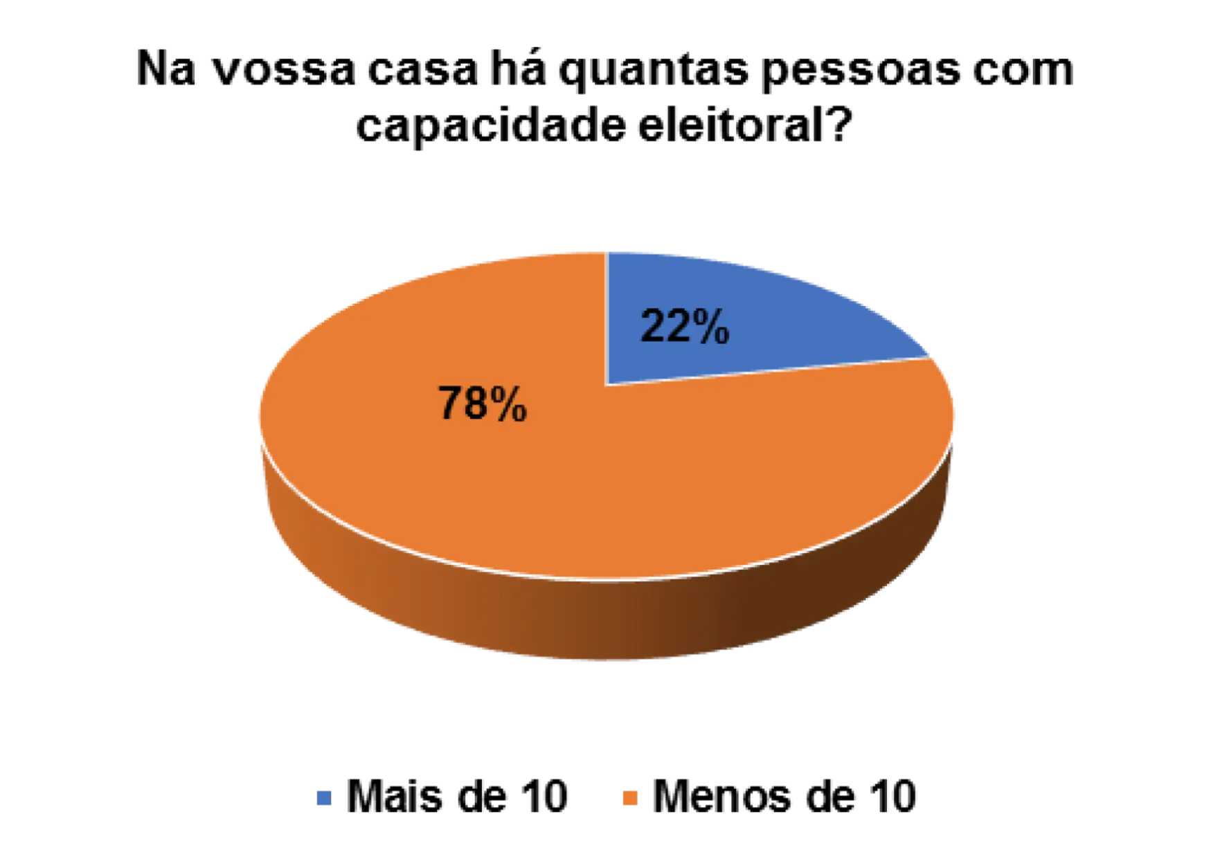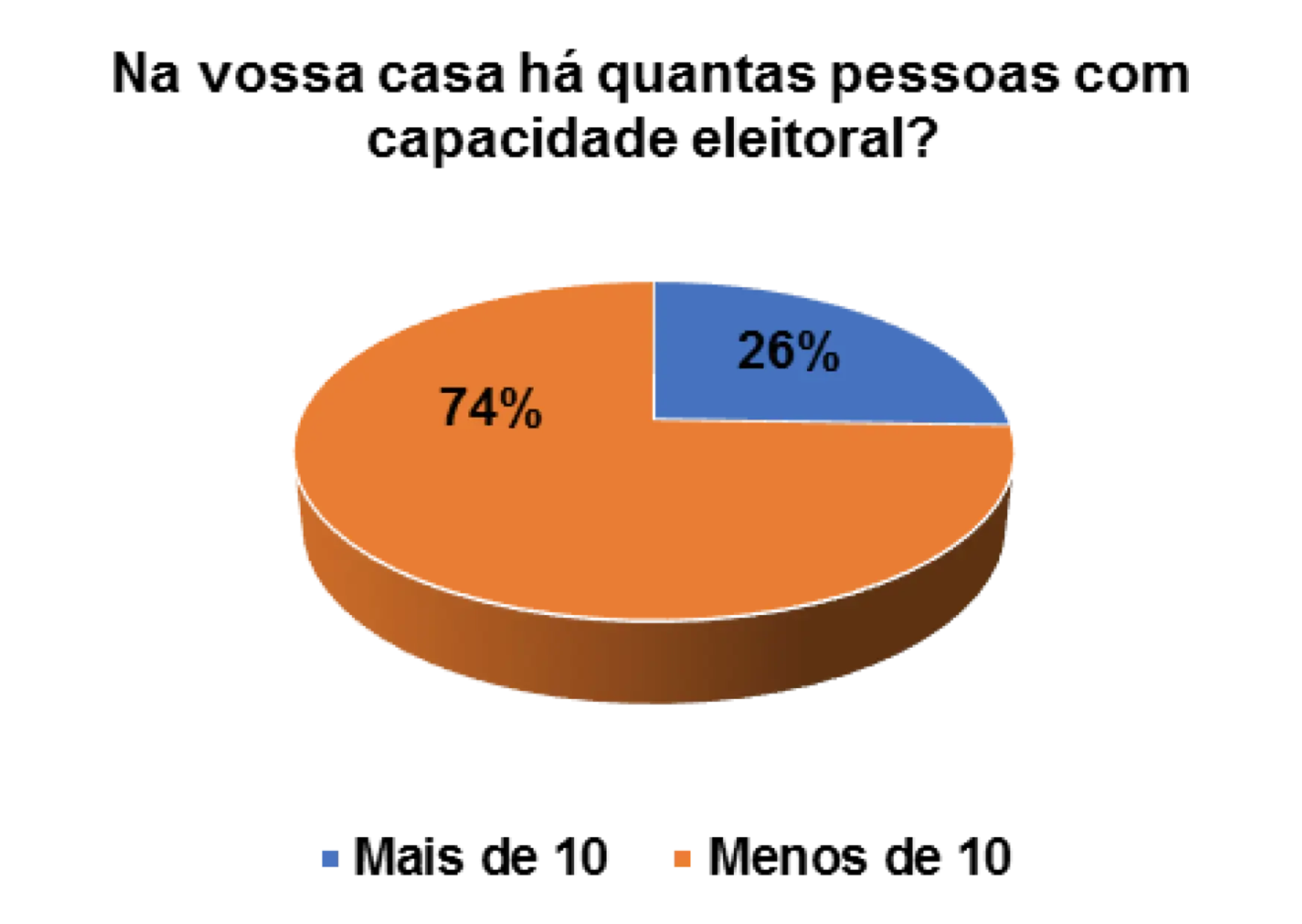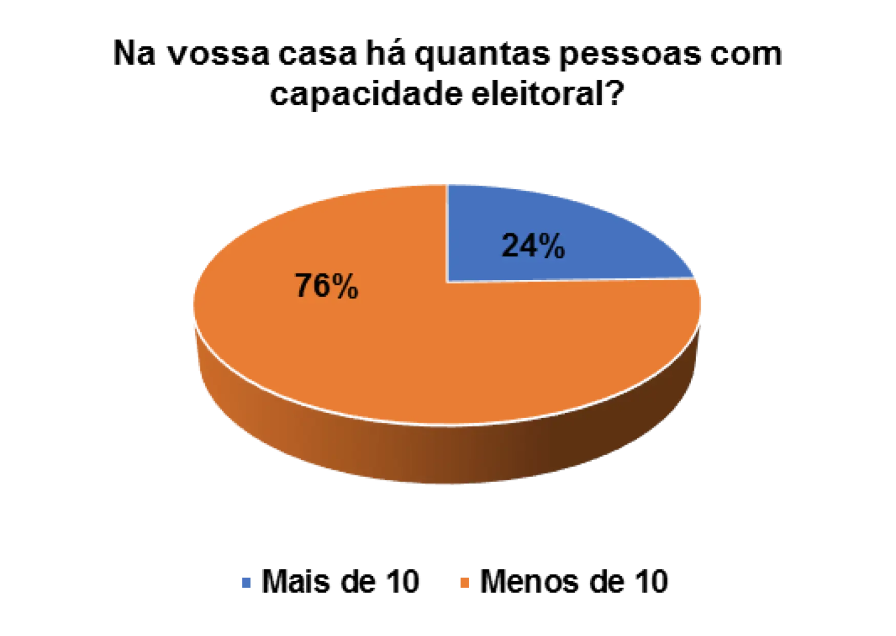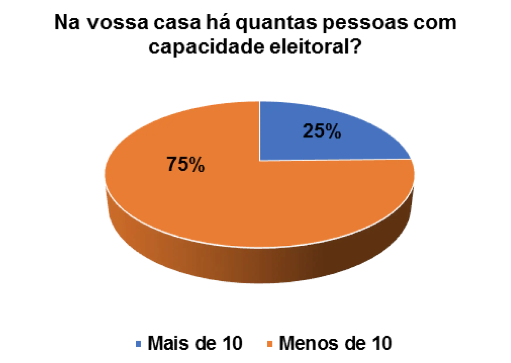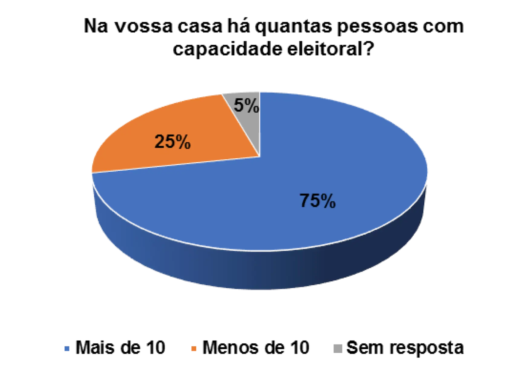 Quando questionados/as sobre a capacidade eleitoral do agregado familiar, 25% afirmam que no agregado menos de 10 pessoas podem votar e 75% afirmam que no agregado mais de que 10 podem votar.