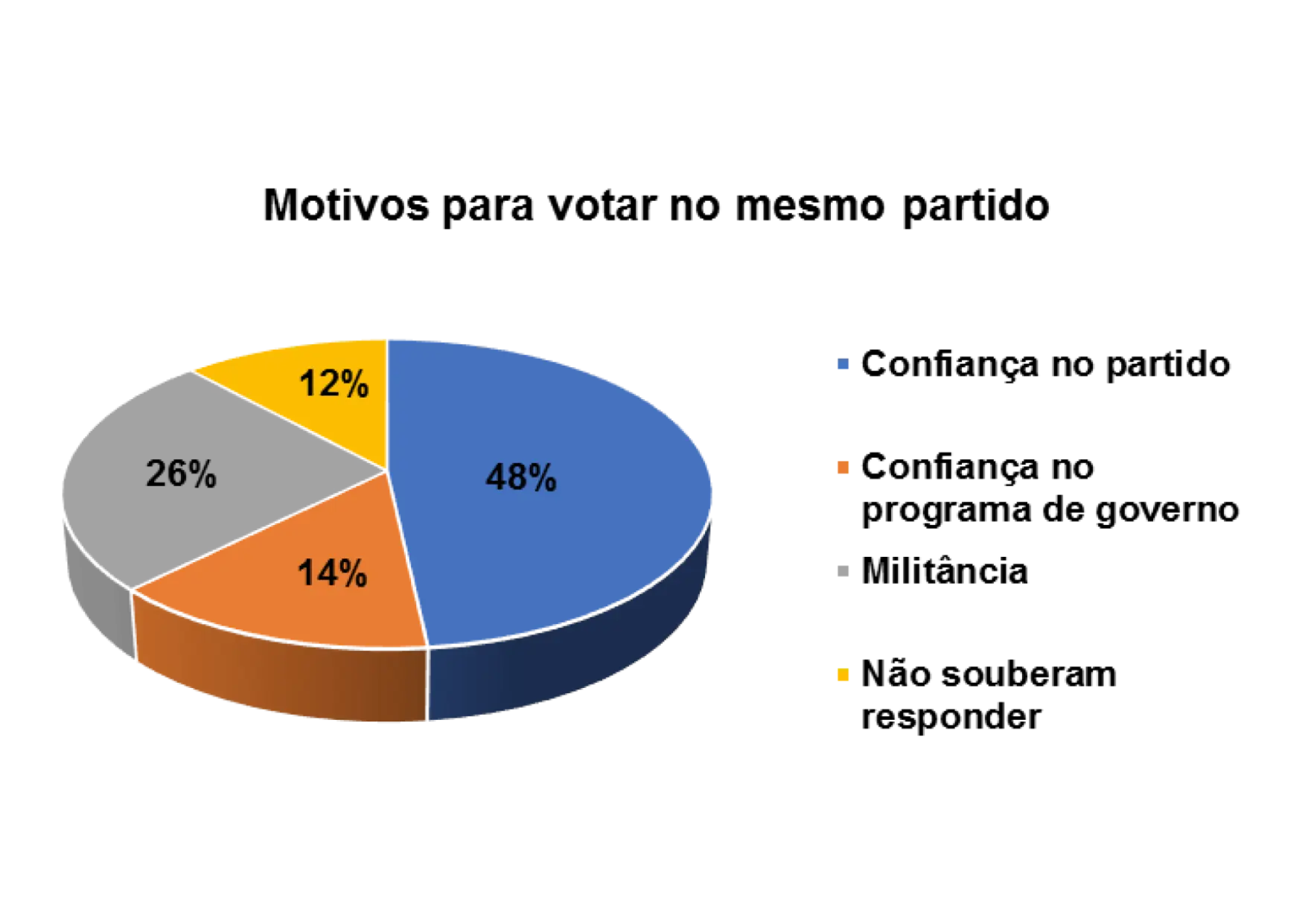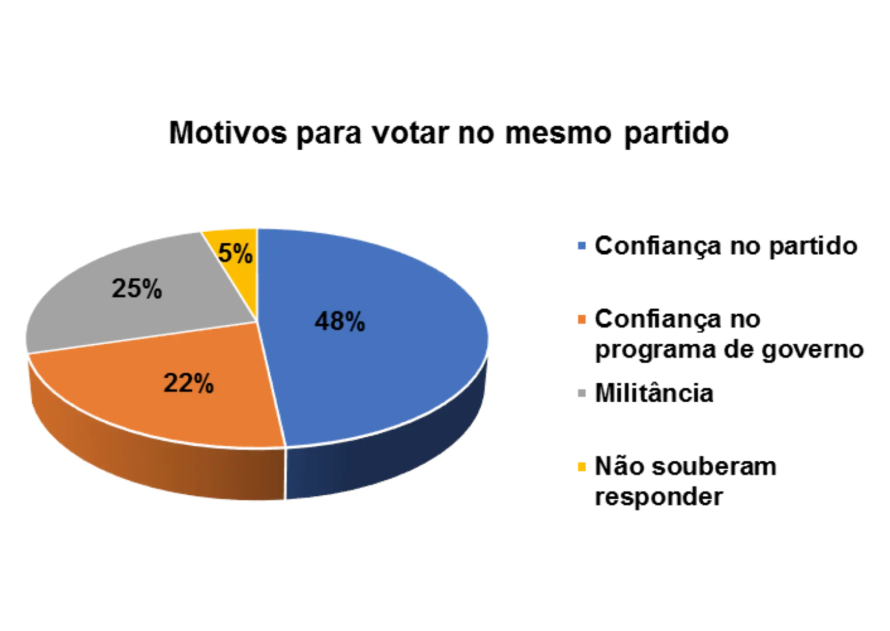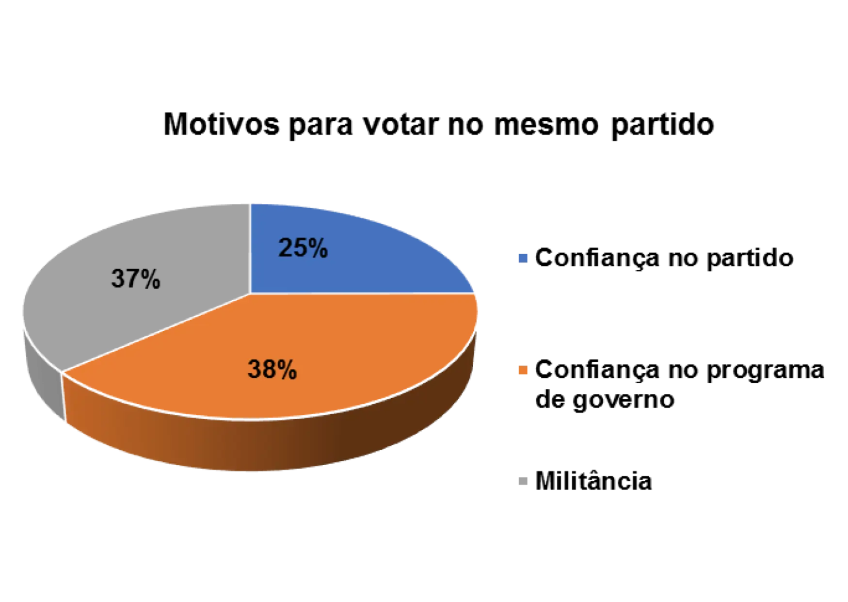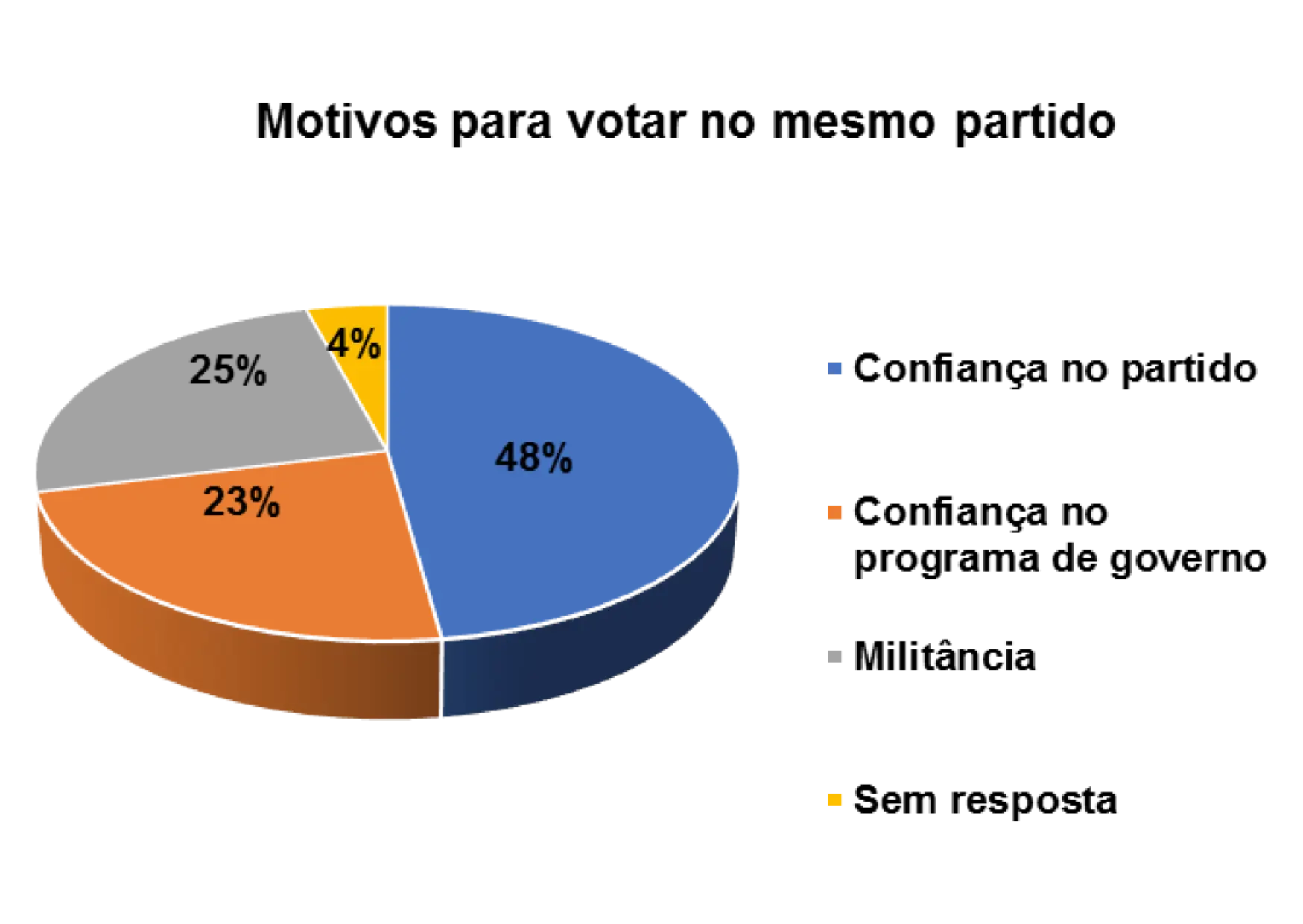 E os principais motivos de terem votado sempre no mesmo partido são: confiança no partido (48%), confiança no programa de Governo (23%) e militância (25%).